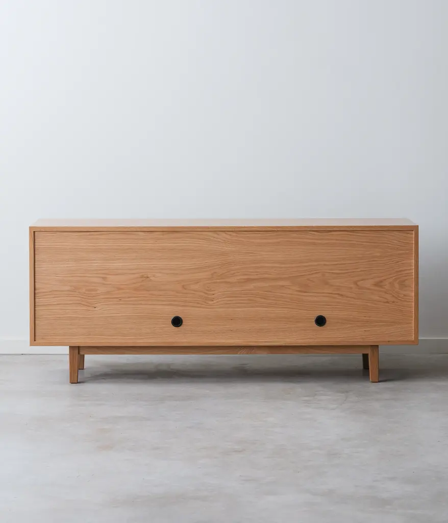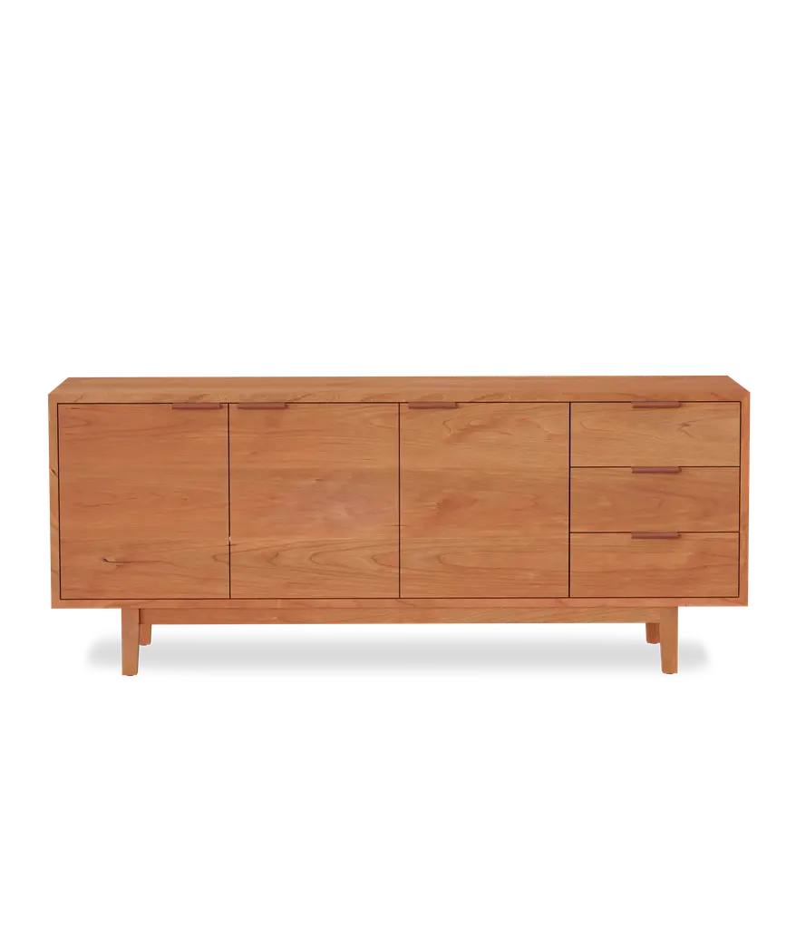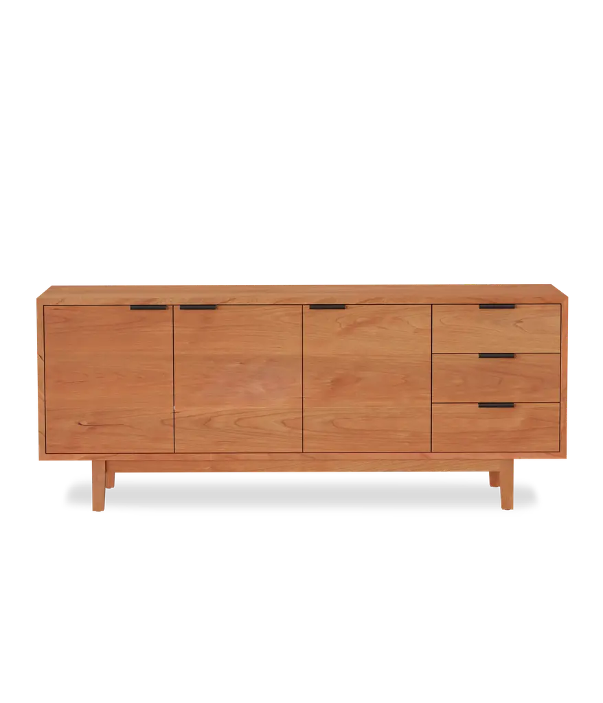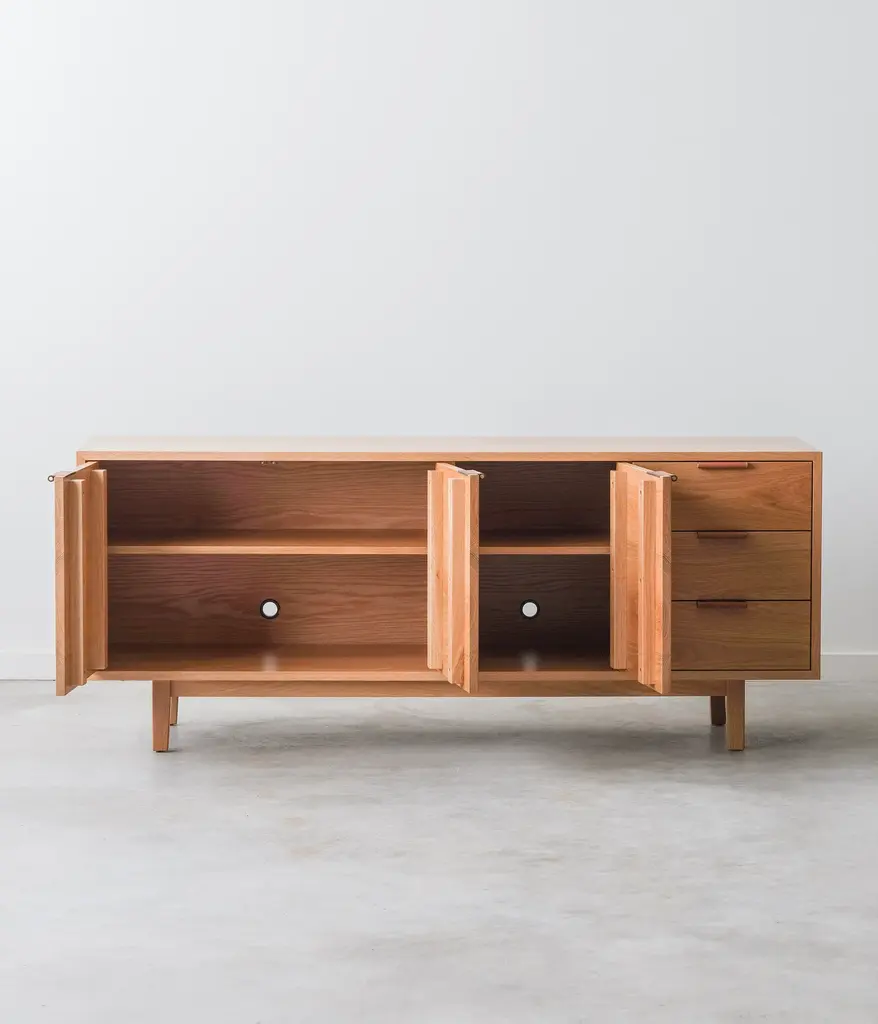 Add elegance and organization to your living room with the Hayward Media Cabinet. Continuous grain runs across the doors and drawers, highlighting the beauty of the natural hardwood. Two adjustable shelves and three drawers on soft close slides, make it the ideal storage piece. Two cord cutouts in the back, make for easy organization of all your electronics.