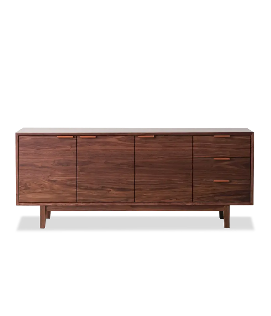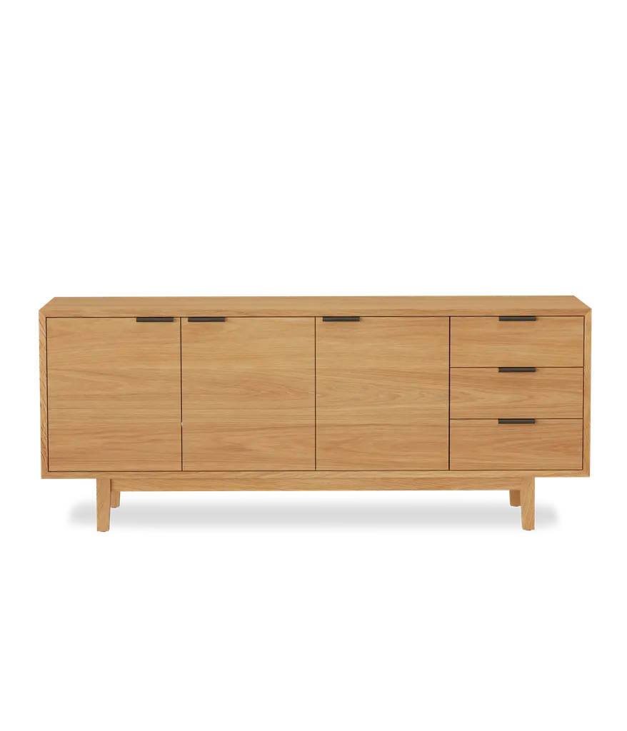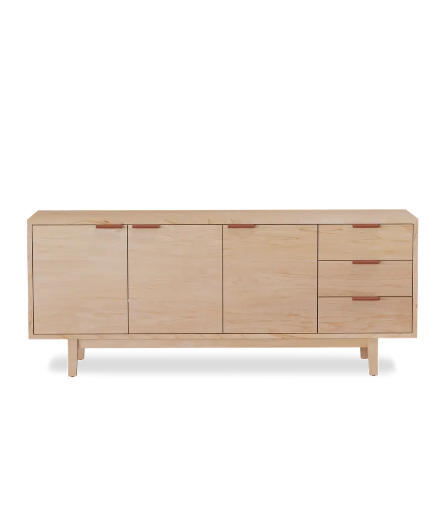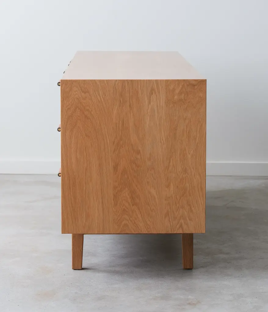 Add elegance and organization to your living room with the Hayward Media Cabinet. Continuous grain runs across the doors and drawers, highlighting the beauty of the natural hardwood. Two adjustable shelves and three drawers on soft close slides, make it the ideal storage piece. Two cord cutouts in the back, make for easy organization of all your electronics.