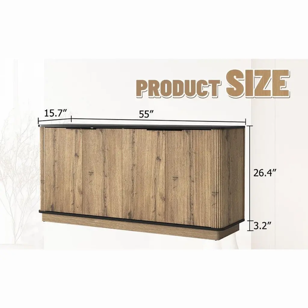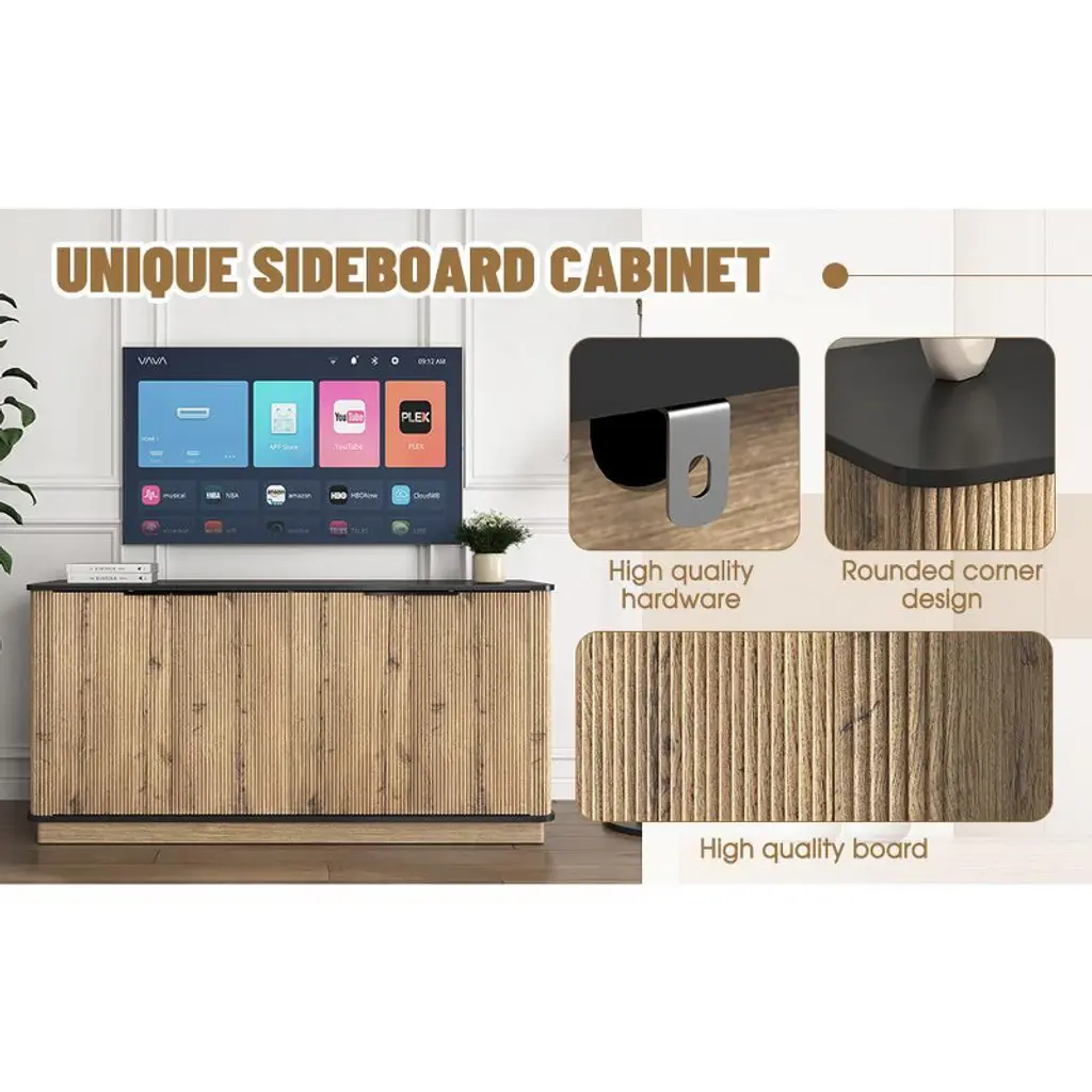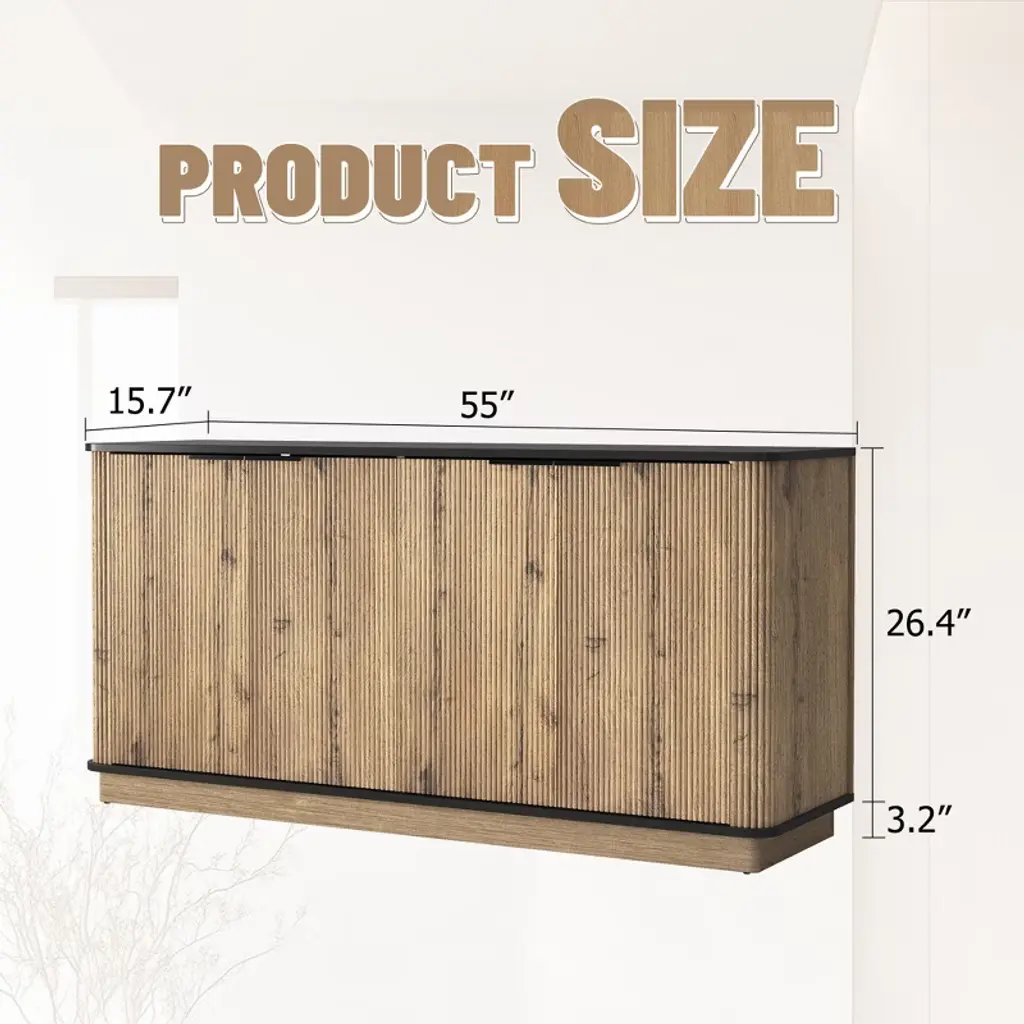 【Multi-functional Design】: This MDF sideboard is not only capable of holding your tableware but also provides ample space for a large-screen TV, meeting both your entertainment and storage needs. 【Metal Rounded Corner Design】: This MDF sideboard features a delicate rounded corner design that enhances the structural stability of the cabinet. The rounded corners also effectively prevent injuries from accidental impacts, thereby increasing home safety. 【Elegant Handle Design】: The cabinet is equipped with handles that are delicately designed, providing not only a convenient experience for opening and closing, but also adding a sense of fashion to the overall appearance of the cabinet with their graceful shape. 【Perfect Size】:The dimensions of 55*15.7*29.5 inches make this sideboard suitable for various living spaces, easily fitting into small apartments as well. 【Aesthetically Practical】: The sideboard is stylish in appearance and can match various interior decoration styles while providing practical storage solutions. 【Quality Material】: Made from MDF, this sideboard is durable, easy to maintain, and offers good load-bearing capacity. 【Easy Assembly】: With the help of instructions, most people can assemble it in just 20 minutes. Please be advised that the colors presented on our website are for reference purposes only. Due to variations in color settings across different screen devices, the actual product color may differ slightly.