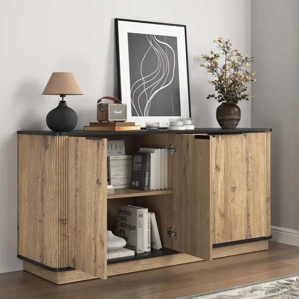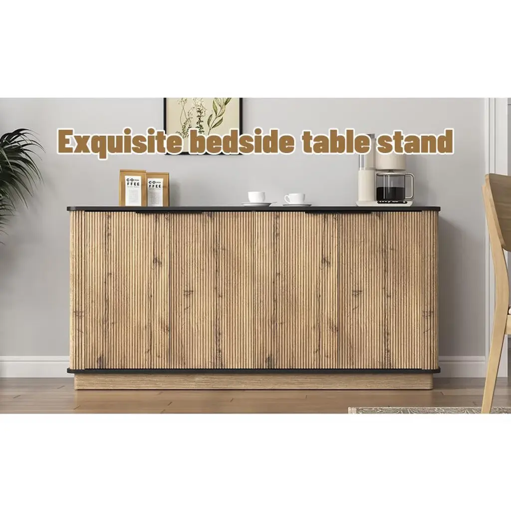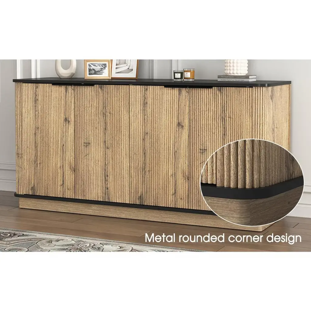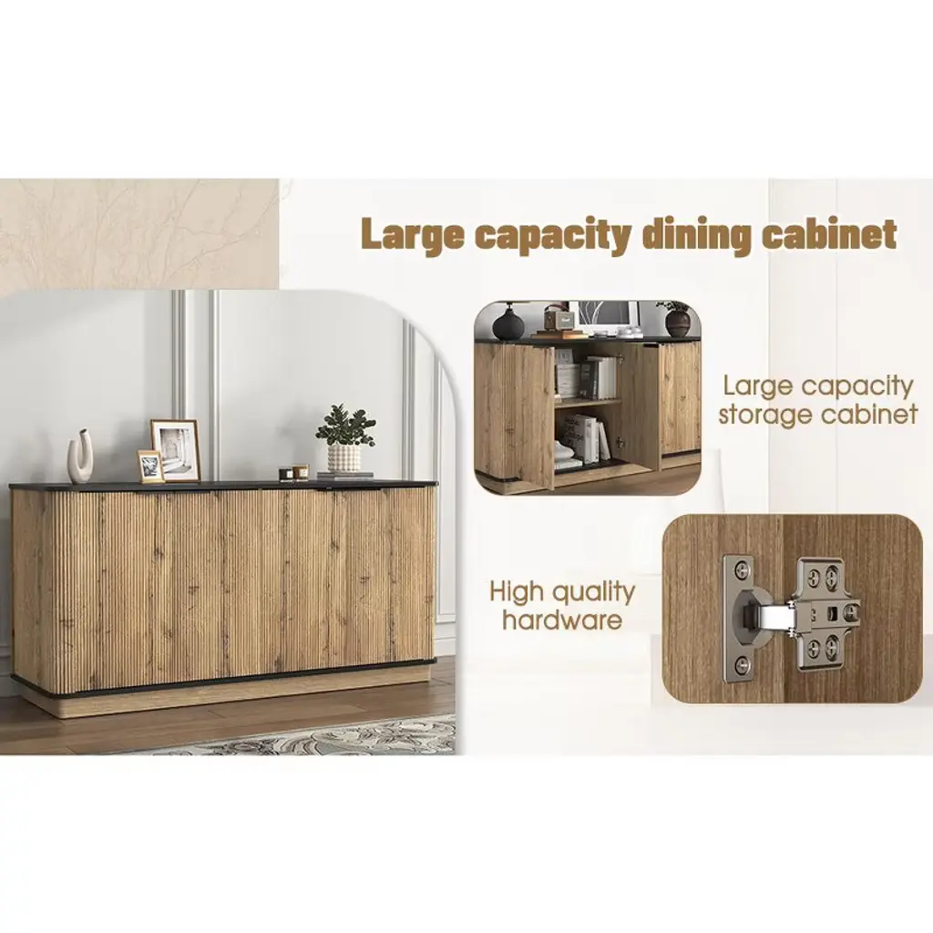 【Multi-functional Design】: This MDF sideboard is not only capable of holding your tableware but also provides ample space for a large-screen TV, meeting both your entertainment and storage needs. 【Metal Rounded Corner Design】: This MDF sideboard features a delicate rounded corner design that enhances the structural stability of the cabinet. The rounded corners also effectively prevent injuries from accidental impacts, thereby increasing home safety. 【Elegant Handle Design】: The cabinet is equipped with handles that are delicately designed, providing not only a convenient experience for opening and closing, but also adding a sense of fashion to the overall appearance of the cabinet with their graceful shape. 【Perfect Size】:The dimensions of 55*15.7*29.5 inches make this sideboard suitable for various living spaces, easily fitting into small apartments as well. 【Aesthetically Practical】: The sideboard is stylish in appearance and can match various interior decoration styles while providing practical storage solutions. 【Quality Material】: Made from MDF, this sideboard is durable, easy to maintain, and offers good load-bearing capacity. 【Easy Assembly】: With the help of instructions, most people can assemble it in just 20 minutes. Please be advised that the colors presented on our website are for reference purposes only. Due to variations in color settings across different screen devices, the actual product color may differ slightly.