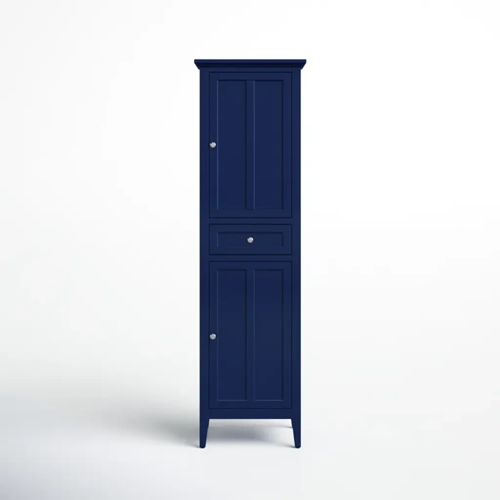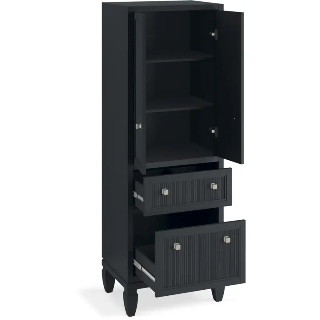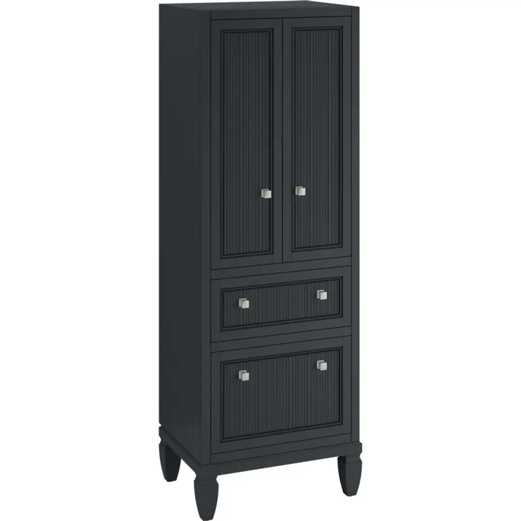Neoclassical detailing embraces modern design and colors in the texturally captivating collection. Featuring ribbed panels inset on picture frame-like stacked and door molding, this cabinetry gets a lift from chunky tapered feet. Adorned with classic Vibrant hardware, the linen tower features two interior shelves for plenty of storage space. Includes cabinet in your choice of color, legs, and Vibrant hardware. Additional hardware finishes are also available.