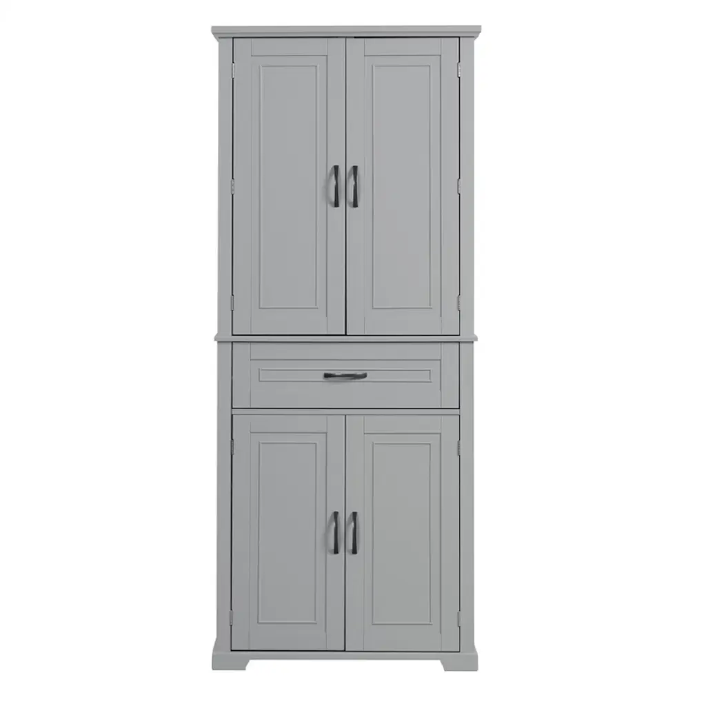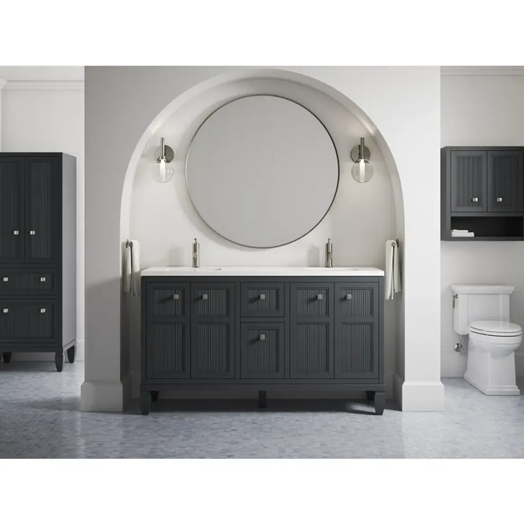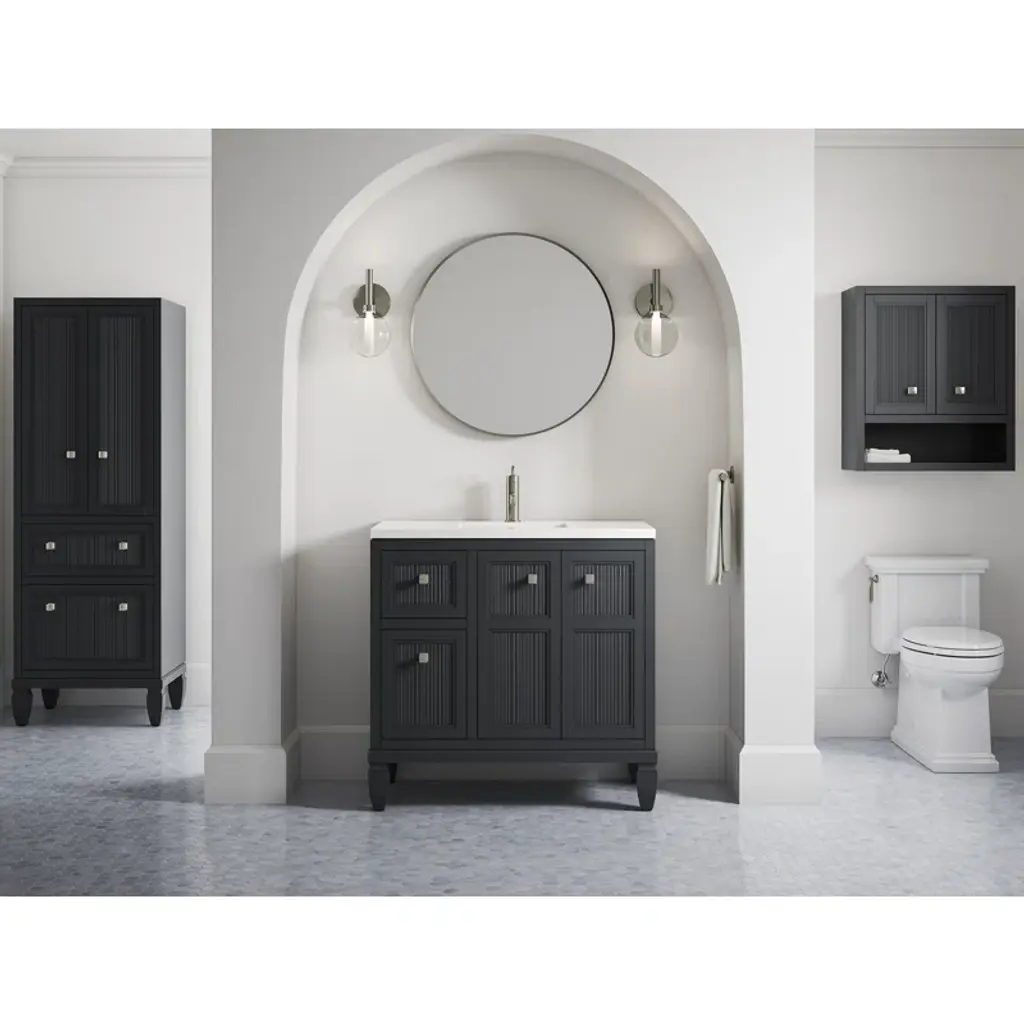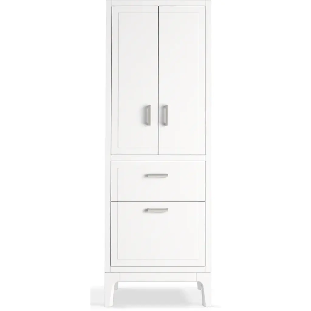 Neoclassical detailing embraces modern design and colors in the texturally captivating collection. Featuring ribbed panels inset on picture frame-like stacked and door molding, this cabinetry gets a lift from chunky tapered feet. Adorned with classic Vibrant hardware, the linen tower features two interior shelves for plenty of storage space. Includes cabinet in your choice of color, legs, and Vibrant hardware. Additional hardware finishes are also available.