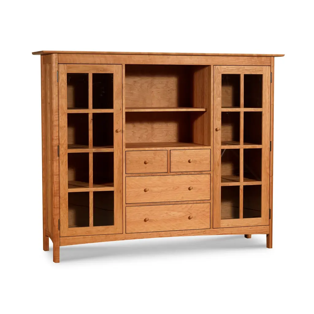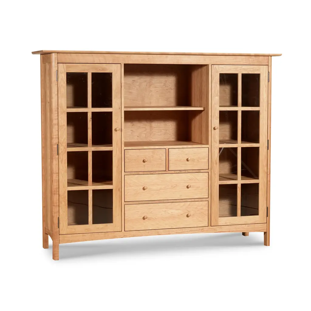 Our large high end Heartwood Shaker Style Home Office Cabinet is handmade using premium hardwood and crafted to last a lifetime. This luxurious solid wood bookcase with 4 drawers and glass doors is a versatile cabinet for your home or office. Solve your storage and display needs. Our Heartwood Shaker fine furniture collection is handcrafted to order in Vermont in your choice of solid cherry, maple, or walnut woods with a natural eco-friendly oil finish that not only protects but enhances the natural beauty of the wood. Base price represents cabinet in natural cherry Shown in natural cherry Matching furniture available in our Heartwood Shaker Furniture Collection Please Note: This is an over-sized piece, available for first floor delivery only.
