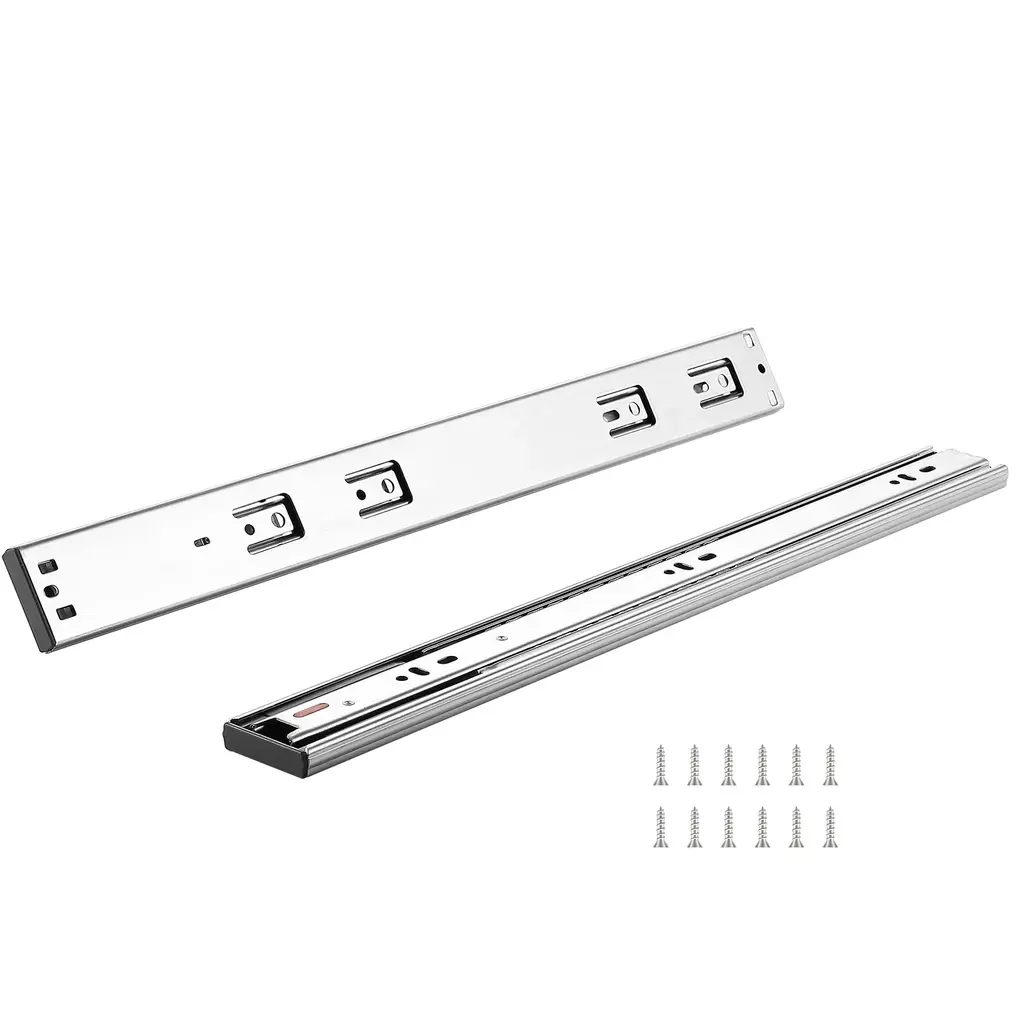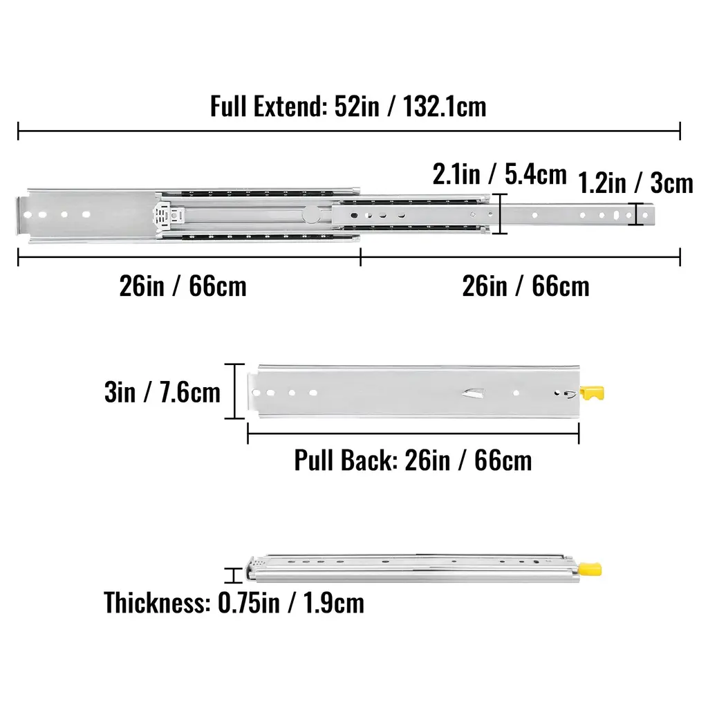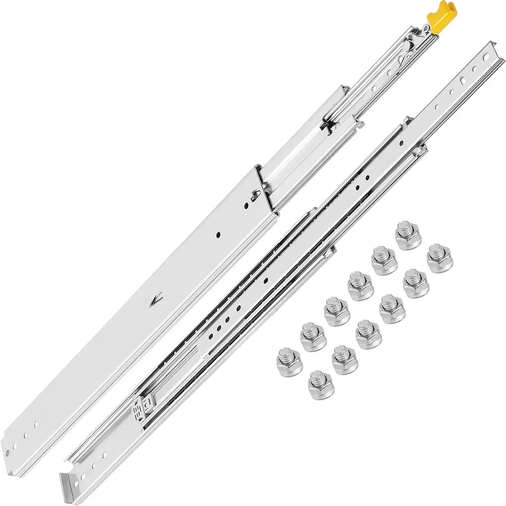 Three-Section Drawer Slides: You can get 1 pair of locking drawer slides: 18"-48" in length, 2.1"/ 5.3 cm in width, and 0.75"/ 1.9 cm in thickness. Our 3-fold full extension design allows the entire drawer to be extended fully, making it easy to reach. A great helper to maximally utilize your drawer's space(fully closed length: 36", fully extended length: 36"-96"). Sturdy Steel & 250 lbs/500 lb Bearing: Constructed with 0.08"/ 2 mm thickness cold-rolled steel (CRS), the heavy-duty drawer slides have up to 250 lbs/ 115 kg load capacity. Secure and rugged enough to support heavy storage without deformation over time. The electroplated surface keeps the extension drawer slides rust-proof and abrasion-proof, ensuring lifetime use. The slides can be applied to goods shelves, cabinets, industrial drawers, RVs, trucks, vending machines, etc. Softly & Quietly Slides with Lock: These slides feature a lock-in and lock-out design for easy control, secure fixation, and no chance of drawer separating from the cabinet. Compared to drawer slides without locks, our drawer slides with locks provide more security and stability. A double row of ball-bearing action provides a smooth slide performance when closing and opening the drawer. The nylon buffer design on the middle-section slides produces less noise and no bounce back. Choose the Right Size: How can you determine the right size of slides for your drawer? Please refer to the detailed description of each size as the picture shows. 0.76"/ 19.2 mm space between drawer and cabinet wall is required (left 0.76", right 0.76"). It is better to measure the length of the drawer and cabinet without the frame board before choosing our drawer slides. Note: The length of slides should be less than or equal to drawer depth. Installation & Usage: Full extension drawer slides are compatible with most major drawer and cabinet types. The heavy-duty drawer slides can be installed on the side of the cabinet or machine parts. All screws and bolts are included for effortless installation. Ideal for new construction, remodeling, and replacement projects, such as room furniture, kitchen, tool shed and commercial equipment. Installation is effortless, so you can use the drawer right away. Package Content 2 x Drawer Slides 12 x M5 Screws (1 x Heavy-Duty Drawer Slide Kit 1 x Screw Kit 1 x User Manual 12 x M5 Screw Nuts) for 500lbs option