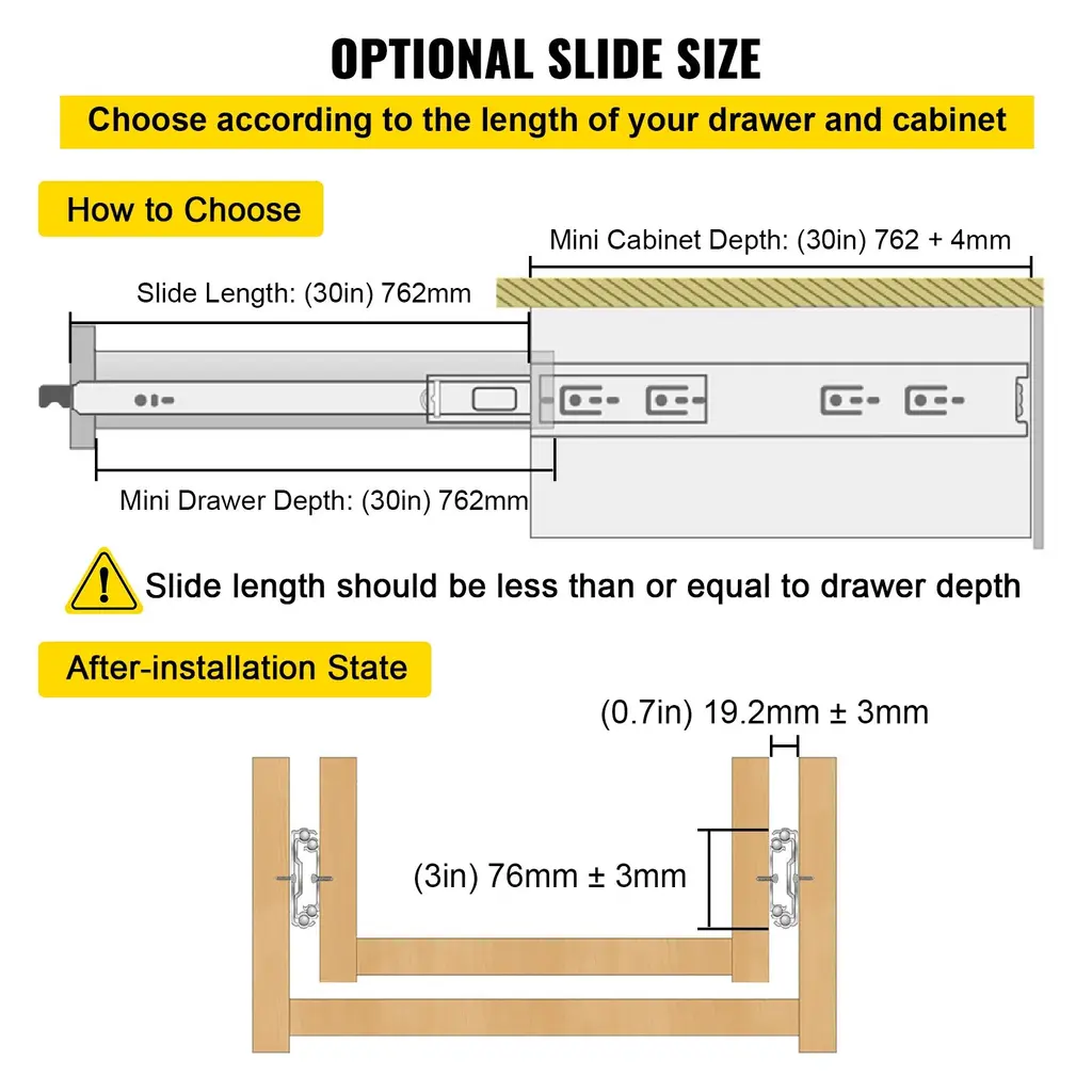Three-Section Drawer Slides: You can get 1 pair of locking drawer slides: 18"-48" in length, 2.1"/ 5.3 cm in width, and 0.75"/ 1.9 cm in thickness. Our 3-fold full extension design allows the entire drawer to be extended fully, making it easy to reach. A great helper to maximally utilize your drawer's space(fully closed length: 36", fully extended length: 36"-96"). Sturdy Steel & 250 lbs/500 lb Bearing: Constructed with 0.08"/ 2 mm thickness cold-rolled steel (CRS), the heavy-duty drawer slides have up to 250 lbs/ 115 kg load capacity. Secure and rugged enough to support heavy storage without deformation over time. The electroplated surface keeps the extension drawer slides rust-proof and abrasion-proof, ensuring lifetime use. The slides can be applied to goods shelves, cabinets, industrial drawers, RVs, trucks, vending machines, etc. Softly & Quietly Slides with Lock: These slides feature a lock-in and lock-out design for easy control, secure fixation, and no chance of drawer separating from the cabinet. Compared to drawer slides without locks, our drawer slides with locks provide more security and stability. A double row of ball-bearing action provides a smooth slide performance when closing and opening the drawer. The nylon buffer design on the middle-section slides produces less noise and no bounce back. Choose the Right Size: How can you determine the right size of slides for your drawer? Please refer to the detailed description of each size as the picture shows. 0.76"/ 19.2 mm space between drawer and cabinet wall is required (left 0.76", right 0.76"). It is better to measure the length of the drawer and cabinet without the frame board before choosing our drawer slides. Note: The length of slides should be less than or equal to drawer depth. Installation & Usage: Full extension drawer slides are compatible with most major drawer and cabinet types. The heavy-duty drawer slides can be installed on the side of the cabinet or machine parts. All screws and bolts are included for effortless installation. Ideal for new construction, remodeling, and replacement projects, such as room furniture, kitchen, tool shed and commercial equipment. Installation is effortless, so you can use the drawer right away. Package Content 2 x Drawer Slides 12 x M5 Screws (1 x Heavy-Duty Drawer Slide Kit 1 x Screw Kit 1 x User Manual 12 x M5 Screw Nuts) for 500lbs option