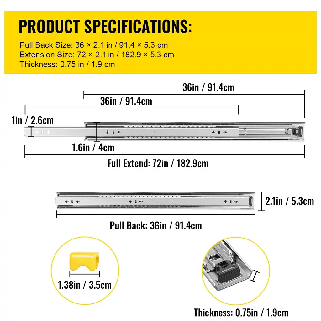 Three-Section Drawer Slides: You can get 1 pair of locking drawer slides: 18"-48" in length, 2.1"/ 5.3 cm in width, and 0.75"/ 1.9 cm in thickness. Our 3-fold full extension design allows the entire drawer to be extended fully, making it easy to reach. A great helper to maximally utilize your drawer's space(fully closed length: 36", fully extended length: 36"-96"). Sturdy Steel & 250 lbs/500 lb Bearing: Constructed with 0.08"/ 2 mm thickness cold-rolled steel (CRS), the heavy-duty drawer slides have up to 250 lbs/ 115 kg load capacity. Secure and rugged enough to support heavy storage without deformation over time. The electroplated surface keeps the extension drawer slides rust-proof and abrasion-proof, ensuring lifetime use. The slides can be applied to goods shelves, cabinets, industrial drawers, RVs, trucks, vending machines, etc. Softly & Quietly Slides with Lock: These slides feature a lock-in and lock-out design for easy control, secure fixation, and no chance of drawer separating from the cabinet. Compared to drawer slides without locks, our drawer slides with locks provide more security and stability. A double row of ball-bearing action provides a smooth slide performance when closing and opening the drawer. The nylon buffer design on the middle-section slides produces less noise and no bounce back. Choose the Right Size: How can you determine the right size of slides for your drawer? Please refer to the detailed description of each size as the picture shows. 0.76"/ 19.2 mm space between drawer and cabinet wall is required (left 0.76", right 0.76"). It is better to measure the length of the drawer and cabinet without the frame board before choosing our drawer slides. Note: The length of slides should be less than or equal to drawer depth. Installation & Usage: Full extension drawer slides are compatible with most major drawer and cabinet types. The heavy-duty drawer slides can be installed on the side of the cabinet or machine parts. All screws and bolts are included for effortless installation. Ideal for new construction, remodeling, and replacement projects, such as room furniture, kitchen, tool shed and commercial equipment. Installation is effortless, so you can use the drawer right away. Package Content 2 x Drawer Slides 12 x M5 Screws (1 x Heavy-Duty Drawer Slide Kit 1 x Screw Kit 1 x User Manual 12 x M5 Screw Nuts) for 500lbs option
