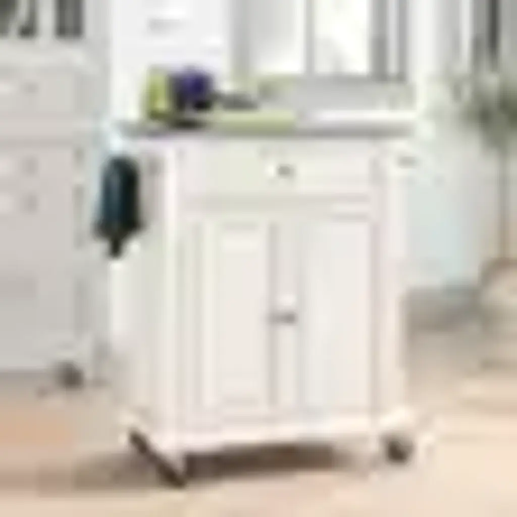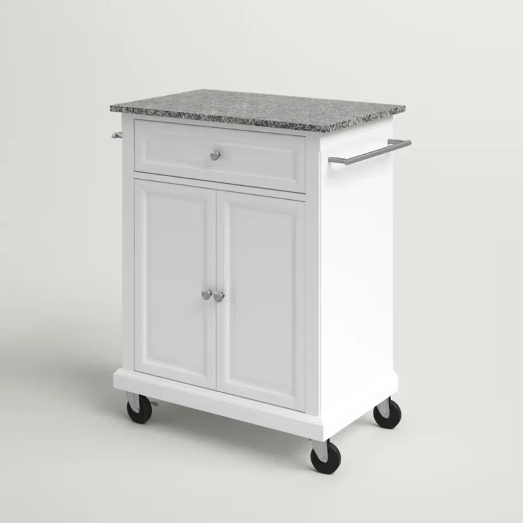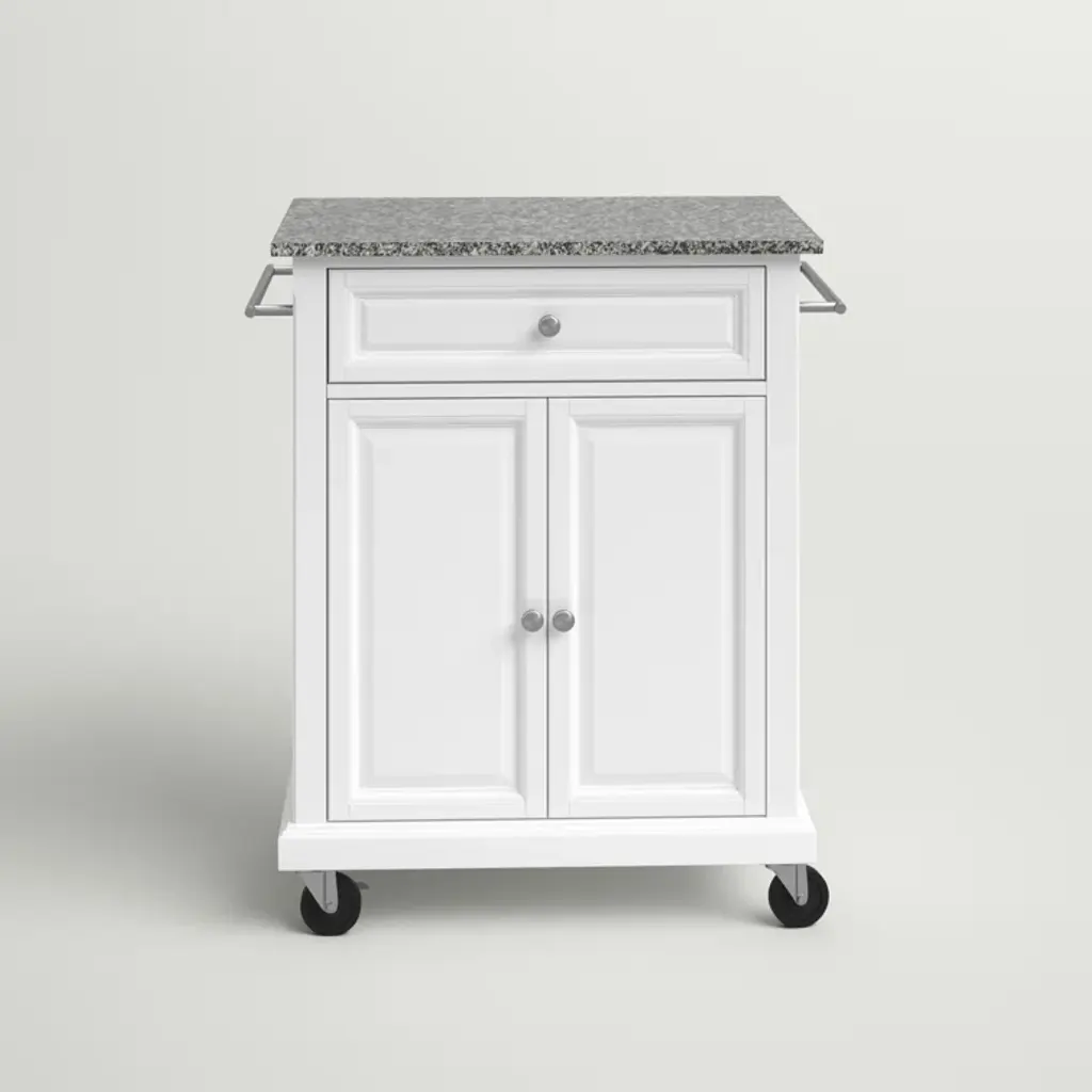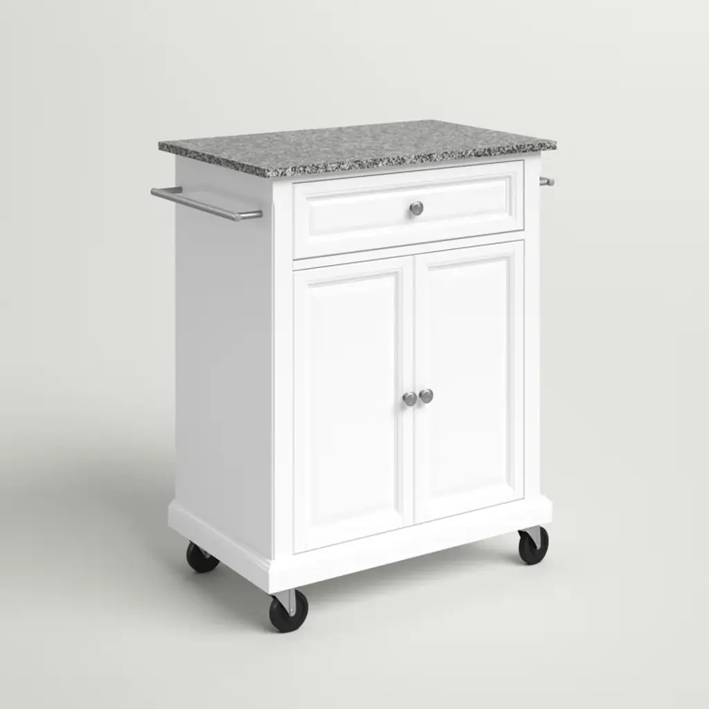 Optimize your space with this compact kitchen cart made from solid and engineered wood with a finish of your choice for a more traditional look. Raised paneling and chunky moldings stand out, while a gray granite countertop creates the ideal dinner prep area. A set of double doors offers enclosed cabinet storage for dinnerware, pots, and pans. Plus, a drawer above the cabinet is great for smaller utensils and accessories. There's also a towel bar on either side, and it rests on four removable, lockable caster wheels for easy mobility.