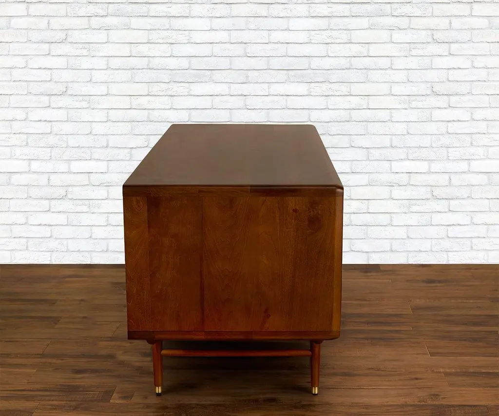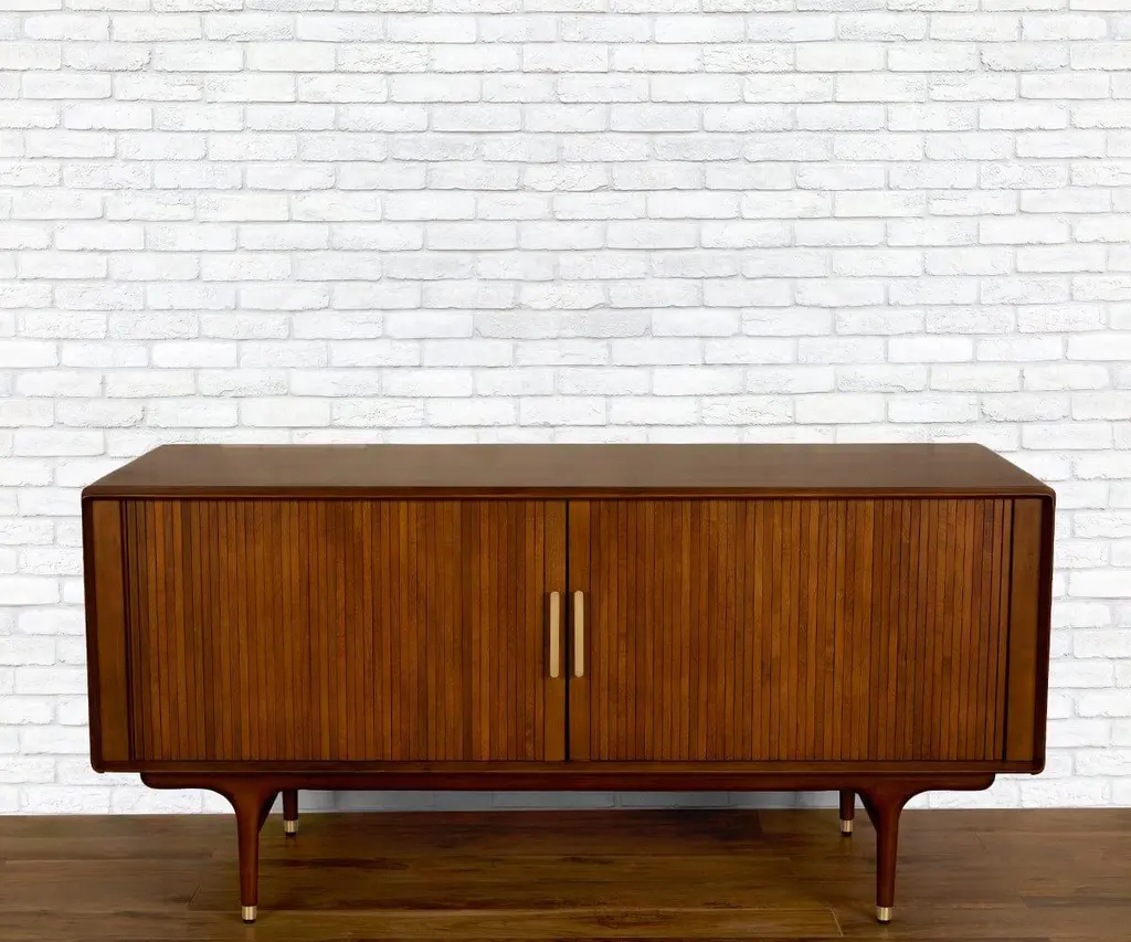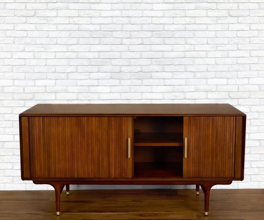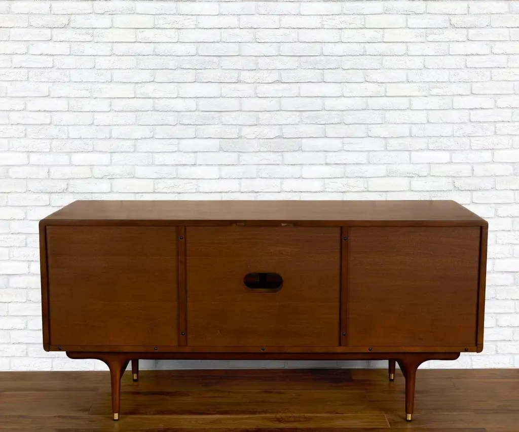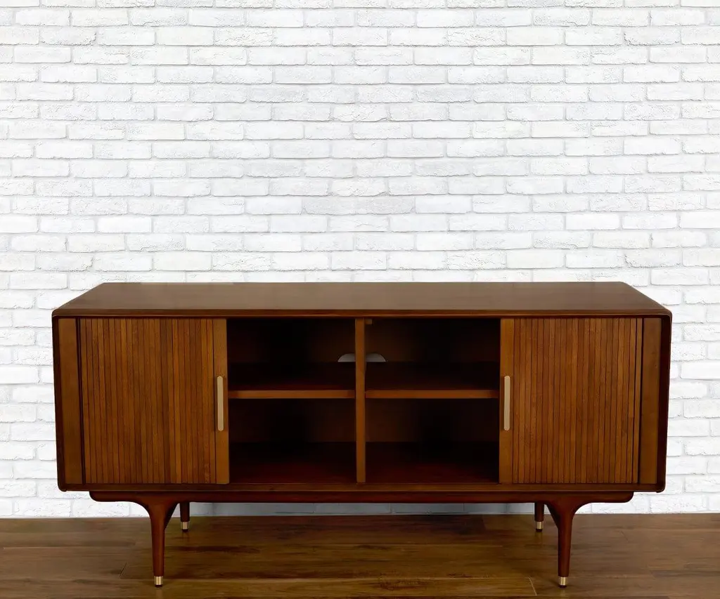 The Hendrick Media Stand commands attention with a dynamic, mid-century-inspired profile. It provides two tambour doors for all of your media storage needs. The tambour doors are made of narrow slats, which slide open sideways to reveal the spacious cabinets within, complete with convenient adjustable shelving. Each of the drawers is on a full-extension metal ball-bearing glide for easy and smooth access. Tall, tapered legs feature solid brass caps for durability and style. Solid brass drawer and door pulls complete the aesthetic.