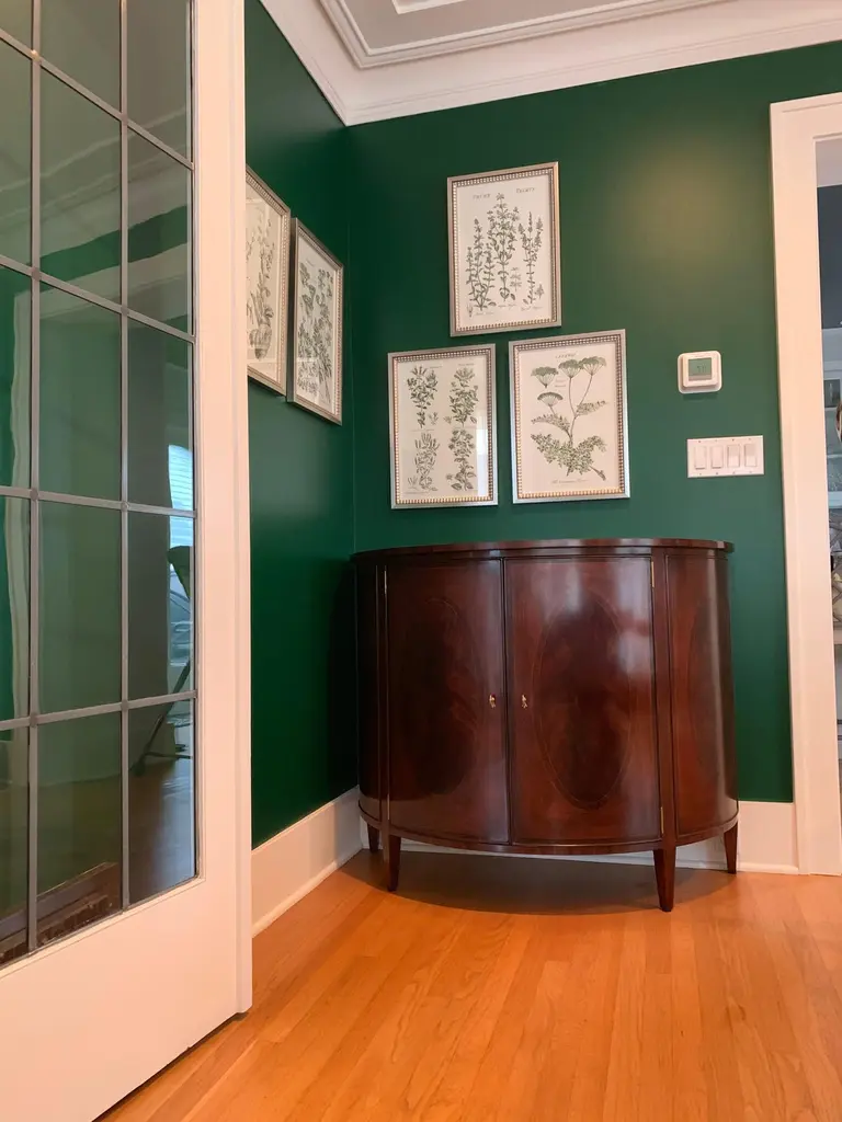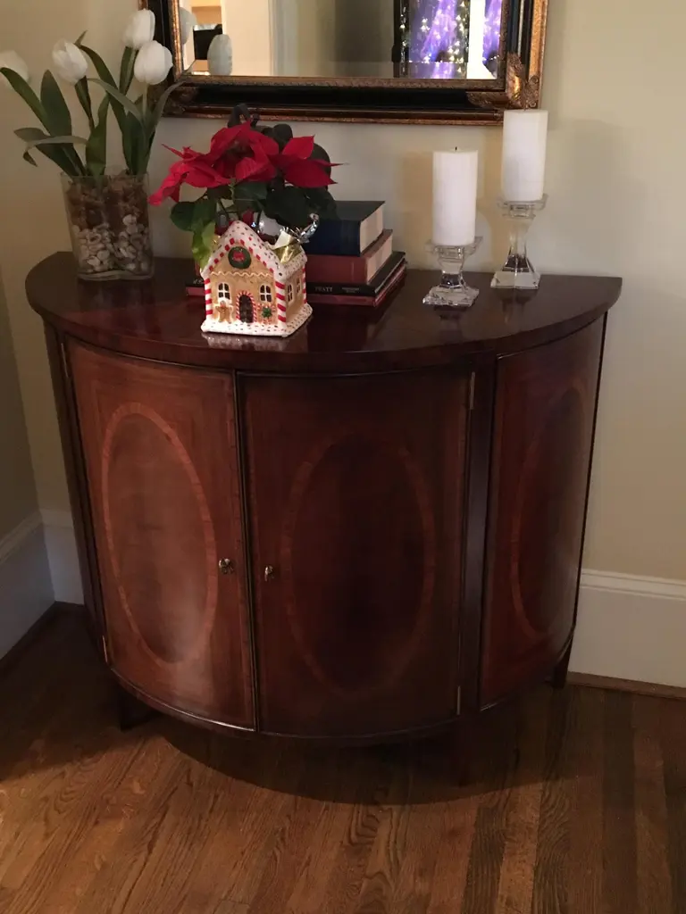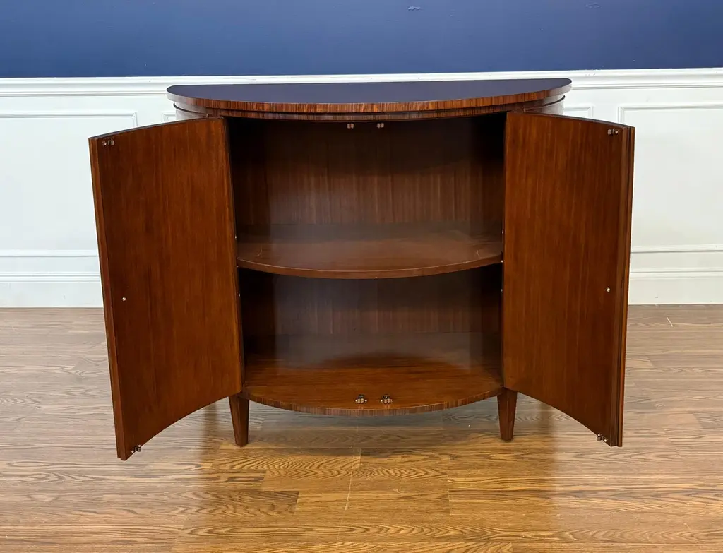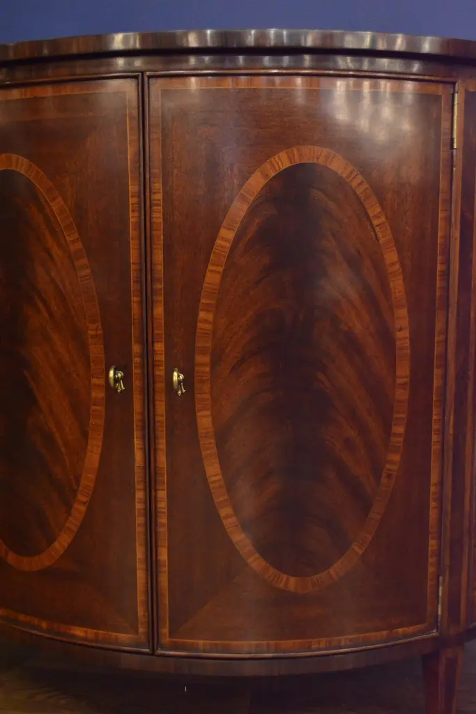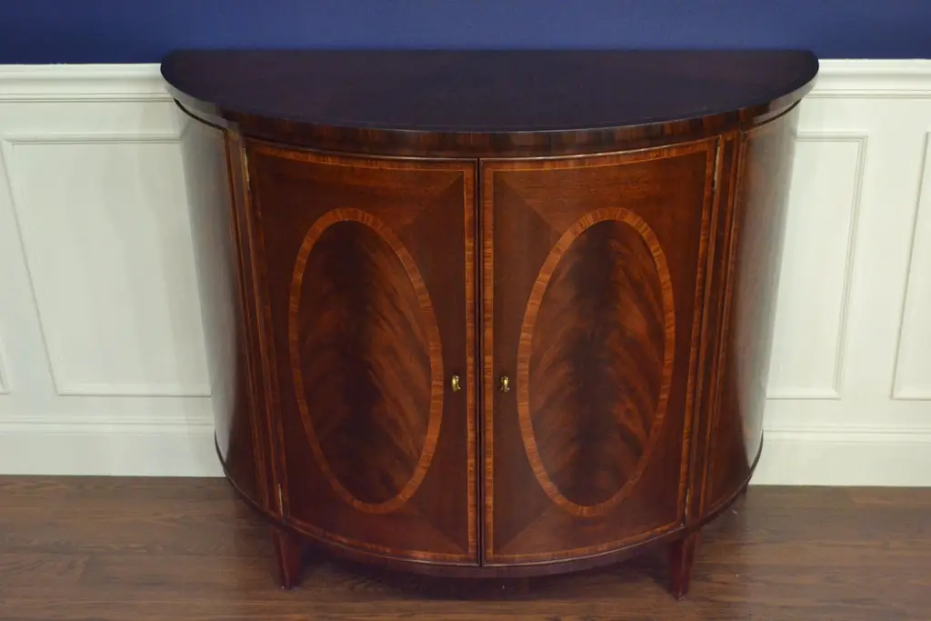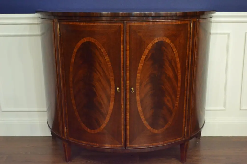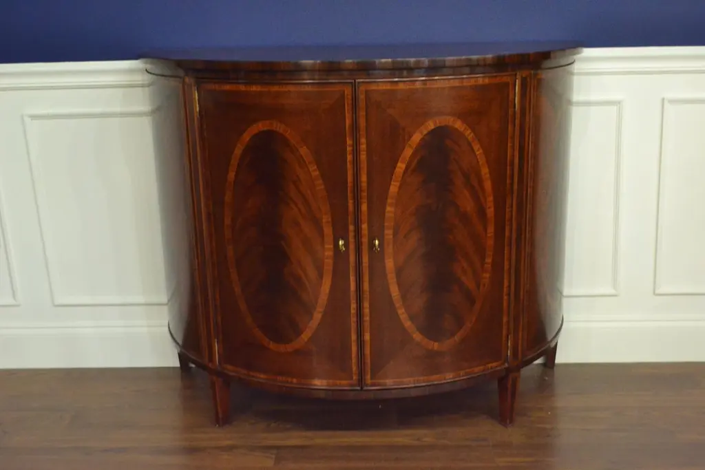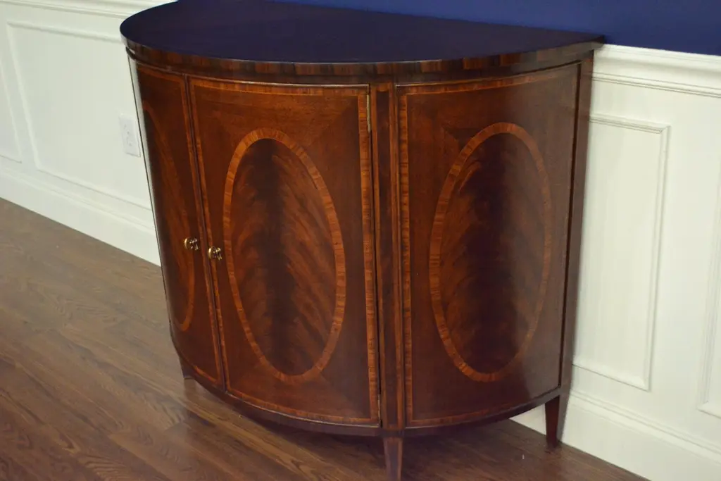 This is a new traditional mahogany Demilune two door cabinet. It’s design was inspired by the Hepplewhite cabinets from the Regency period and features a classic Hepplewhite demilune shaped front with square tapered feet. It features with swirly crotch mahogany fields and straight grain mahogany borders. This cabinet has solid brass hardware. It has a hand steel wool rubbed and polished satin finish. Dimensions: Width 45 in., depth 21 in., height 36 in.Optional features include optional finishes and hardware.Production time is estimated to be approximately 20 weeks.
