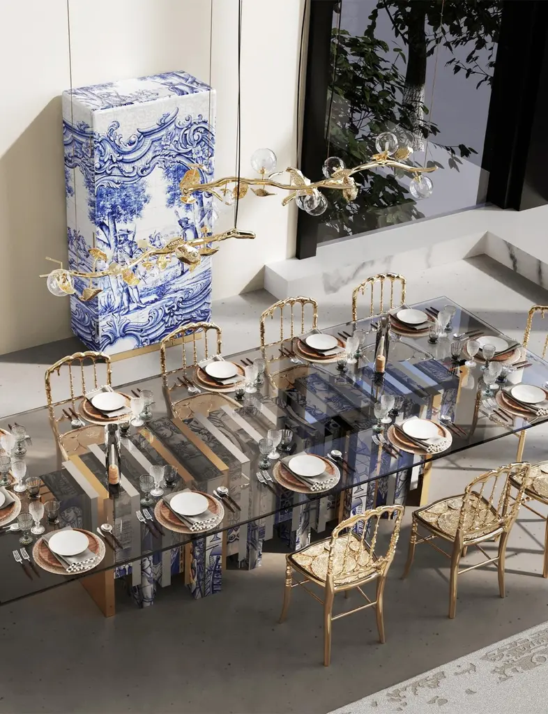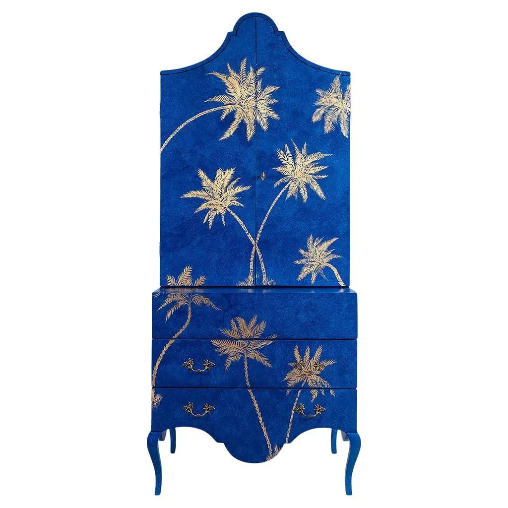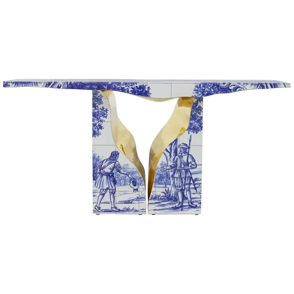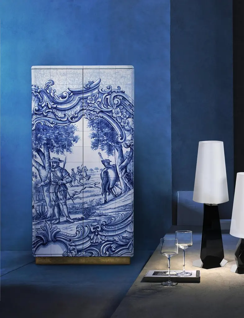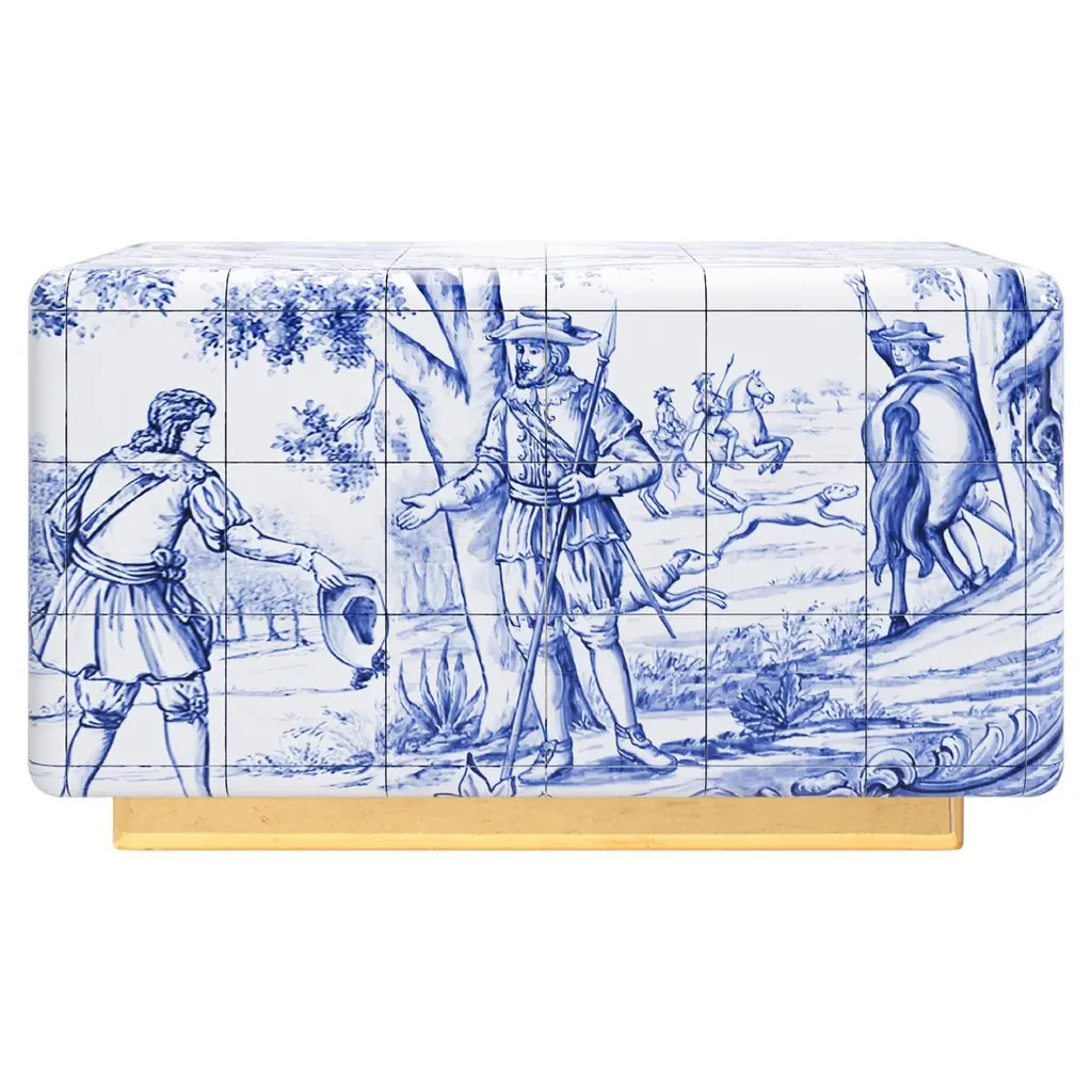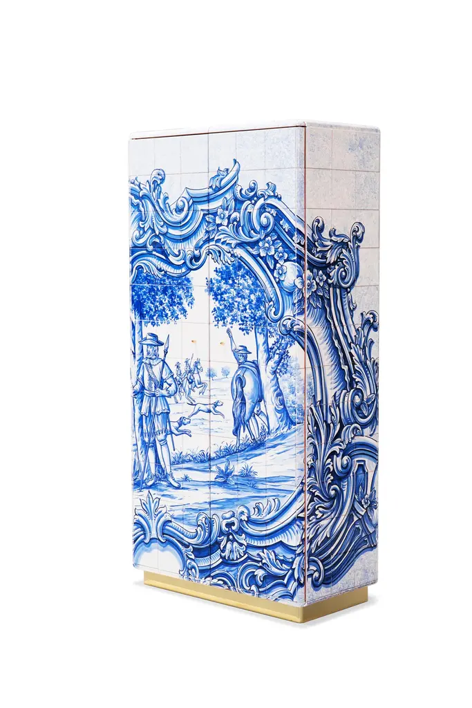 The Heritage Cabinet is a magnificent journey through Portuguese legacy. Covered in Azulejos, traditional hand painted tiles and one of the most representative art forms of Portuguese culture, the architectural cabinet portrays different scenes from the country’s Discoveries era. Centuries of history are gathered in a single final panel, and each layer is enhanced by vertical mirrors on the lateral surfaces. The hint of wander through the rich legacy continues when two doors open to a lined glossy gold leaf interior, and a classical ornament trim reminds the inside of churches and rich buildings. A clear glass shelve can be seen on the two individual divisions of the sideboard. A statement cabinet, the Heritage can take center stage in the most elegant rooms since its back is also fully hand painted. A lengthy tradition of bespoke and exclusivity to make one-of-kind design pieces.
