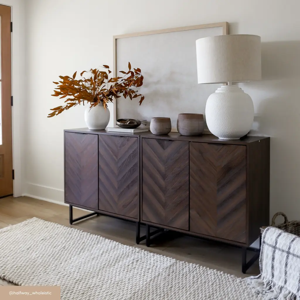 A hideaway so beautiful, we had to make it in another color! The set of 3 Enloe storage cabinets feature rustic walnut paper doors that have beautiful herringbone design for a modern meets rustic feel. The cabinets are held up on beautiful matte black metal legs that have footpads attached to keep your floors from being scratched. With two swinging doors, these cabinets offer plenty of hidden storage and enough space to keep your home clutter-free.