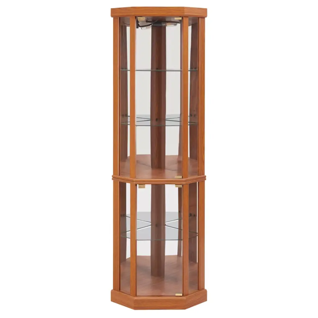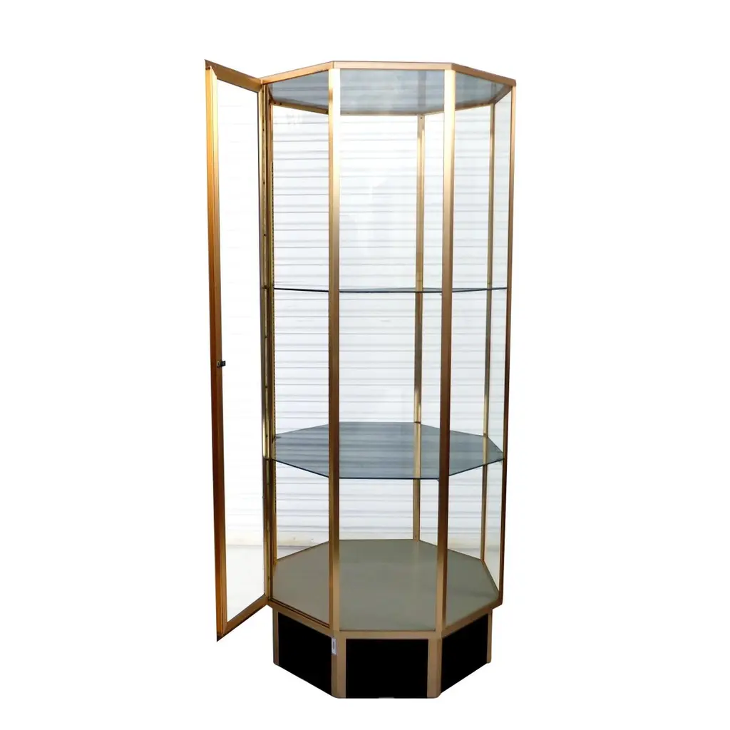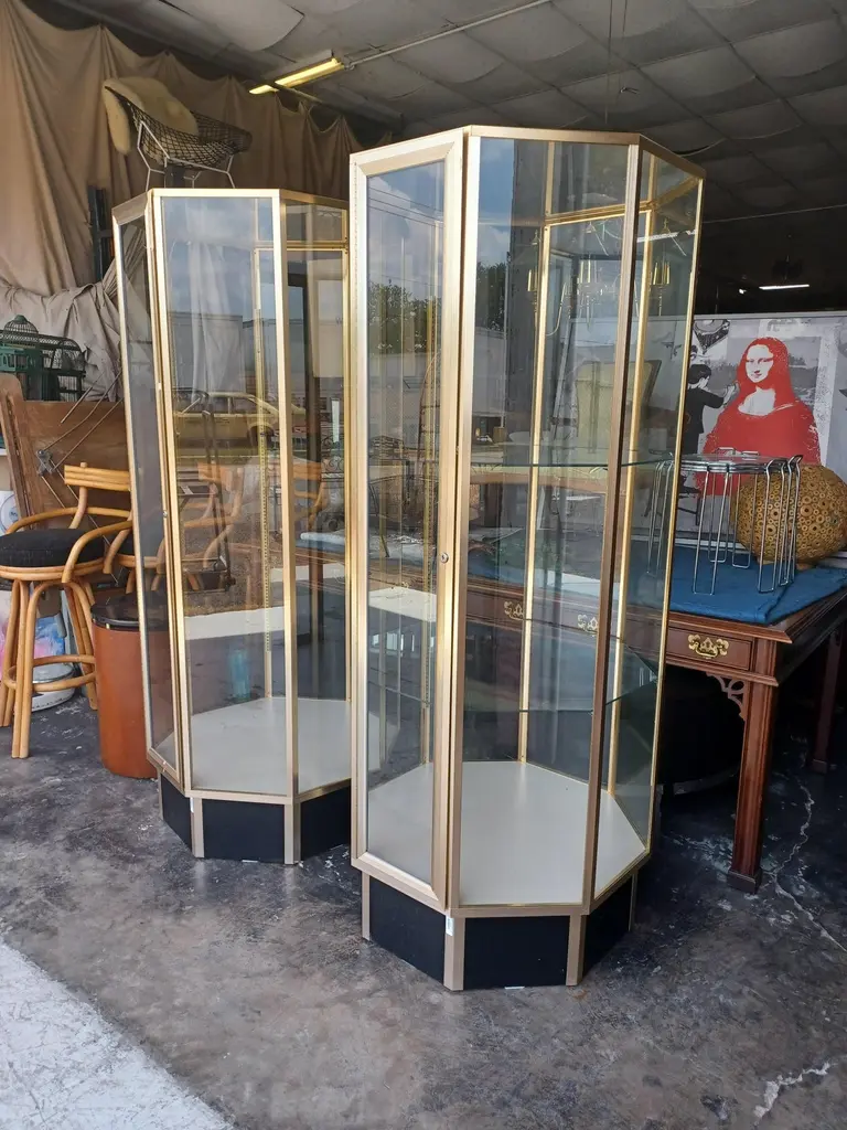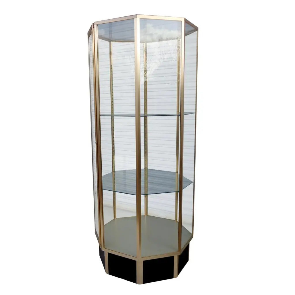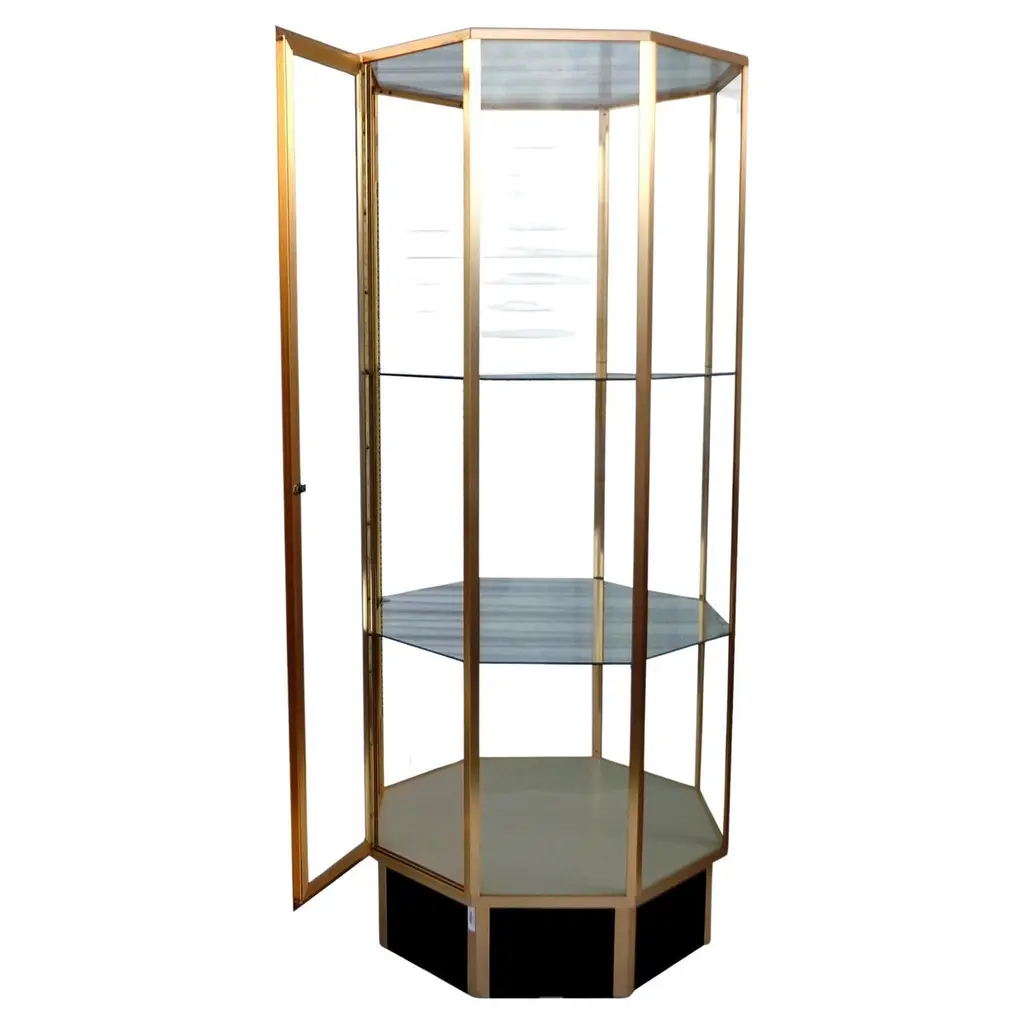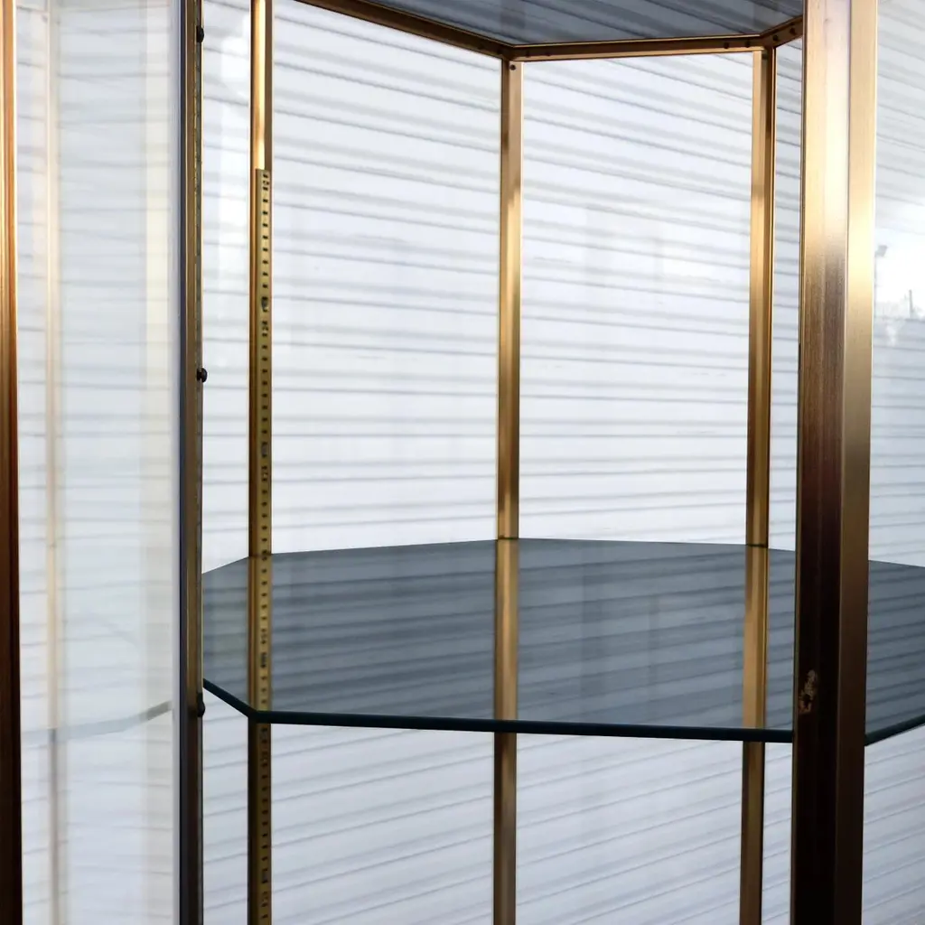 72? Hexagon Mastercraft style glass display cabinetBlack lacquered brass and glass display cabinet or vitrine. Three adjustable glass shelves.2 available.