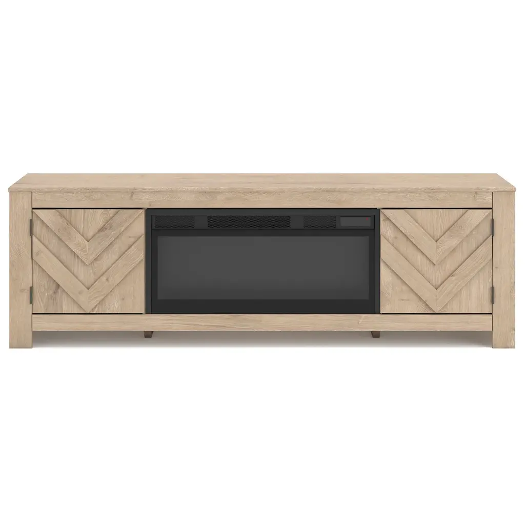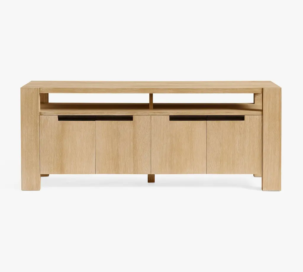 Effortlessly stylish and thoughtfully designed, the High Mountain collection makes it easy to stay organized and fully immersed in your home entertainment space. This contemporary console features a natural finish and a handsome square-shaped frame that delivers a timeless, grounded look. Rear wire management holes in the dual cabinets provide a clutter-free setup, while adjustable shelves offer flexible storage to support your organization needs. At the center, an open shelf provides plenty of display space for your entertainment essentials.