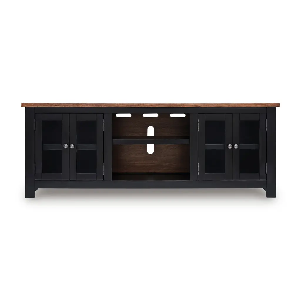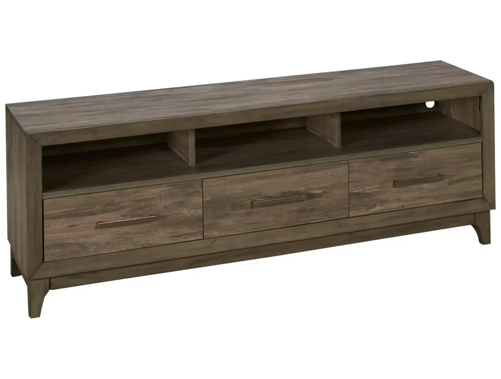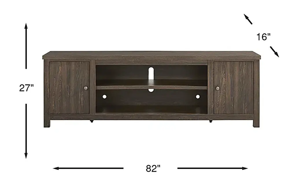 Effortlessly stylish and thoughtfully designed, the High Mountain collection makes it easy to stay organized and fully immersed in your home entertainment space. This contemporary console features a rich dark oak finish and a handsome square-shaped frame that delivers a timeless, grounded look. Rear wire management holes in the dual cabinets provide a clutter-free setup, while adjustable shelves offer flexible storage to support your organization needs. At the center, an open shelf provides plenty of display space for your entertainment essentials.