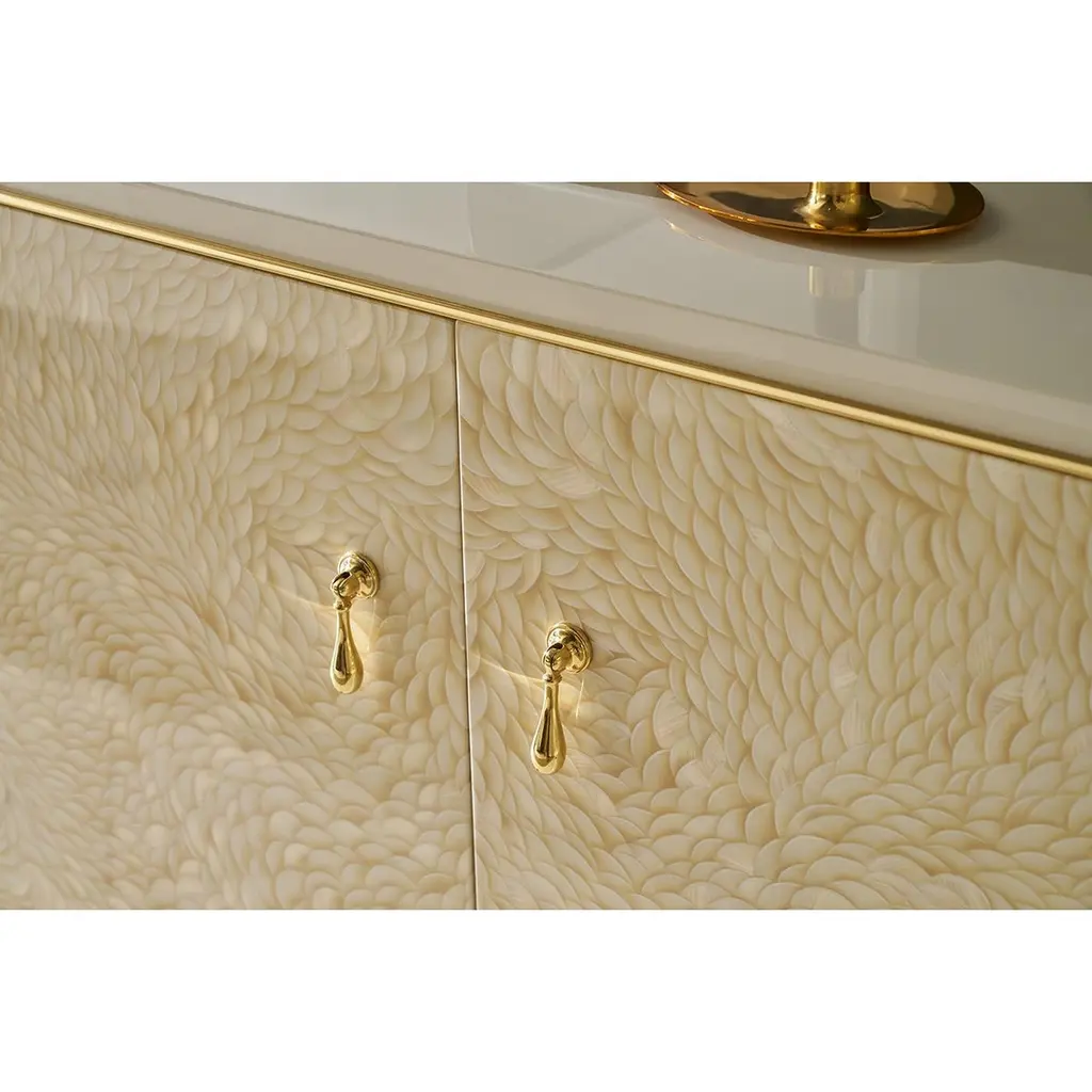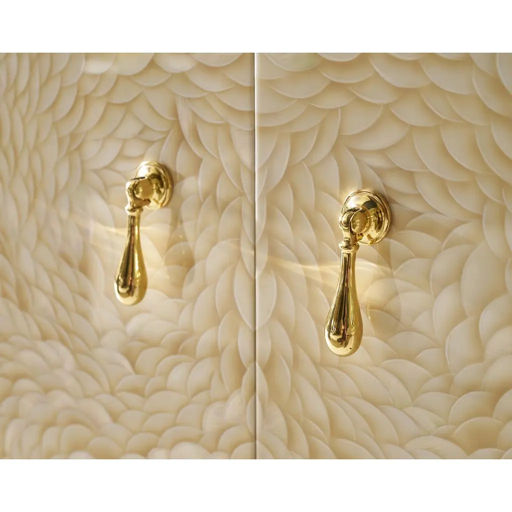 Four Door Cabinet is a shining example of luxury and artistry. Meticulously artisan made, this compact statement piece features hand-painted doors with a swirling, feather-like pattern that adds organic elegance and depth.Polished brass trim and hardware complement the soft white exterior, while the brass base brings a touch of radiant glamour. Ideal for entryways, dining spaces, or chic living rooms, it delivers functional storage wrapped in a refined, fashion-forward silhouette.Dimensions: 80" W x 19" D x 34" H