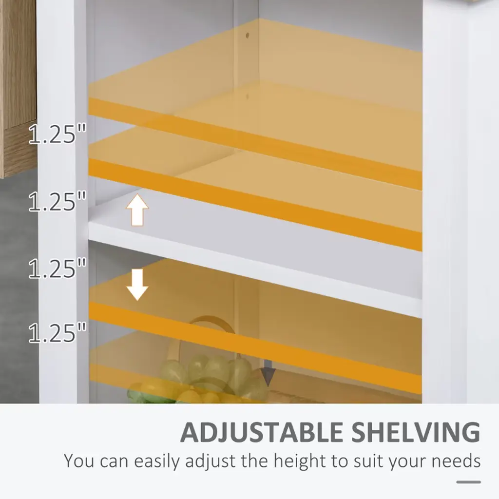 Multiple Storage Options: The kitchen island with storage features a large drawer for storing utensils, while the two cabinet doors house interior shelves for larger kitchen necessities. Open storage areas on the sides with adjustable design provide additional space.Versatile Design: Bring modern elegance and functionality into your home with this modern island table for kitchen. With an elegant color, this kitchen storage cabinet is great for cooking area and dining room.Quality Material: This coffee bar cabinet is built from solid MDF board with veneer for long-lasting stability and is super easy to maintain.Added Beauty & Security: Our microwave stand features a fluted door panel with antique style drawer and door for extra beauty. This small kitchen island also comes with wall attachments for added stability and security, should you decide to turn your island into a peninsula.kitchen Cabinet Information: Overall Dimension: 47.25" W x 17.75" D x 36.25" H, Max Weight Capacity: 220 lbs.