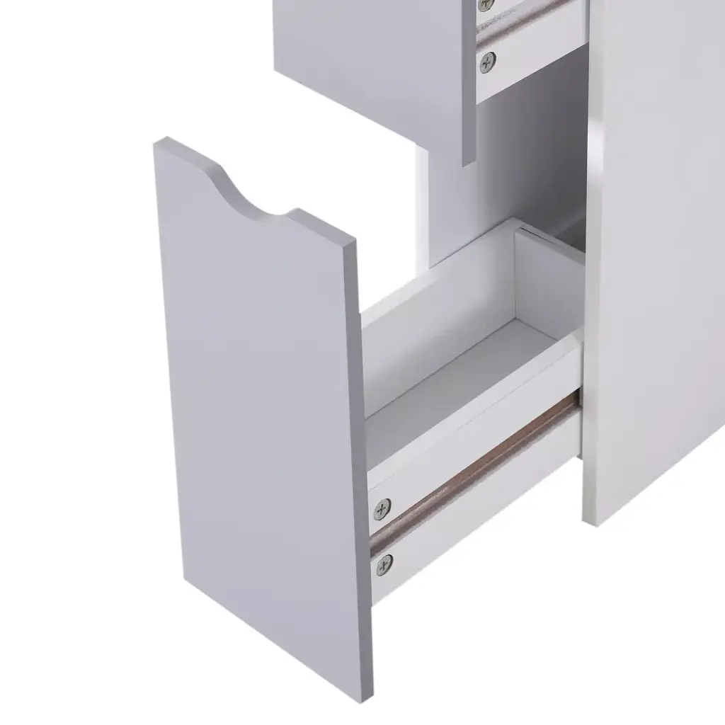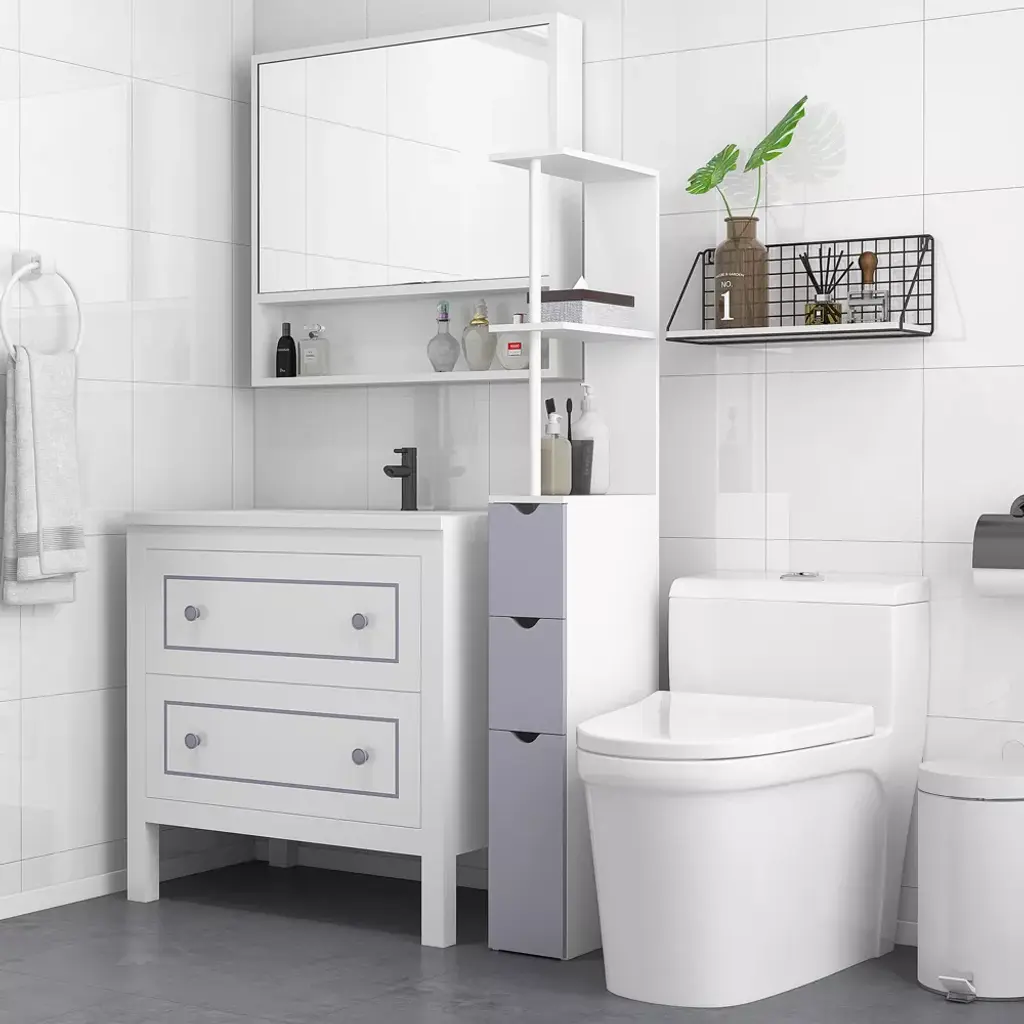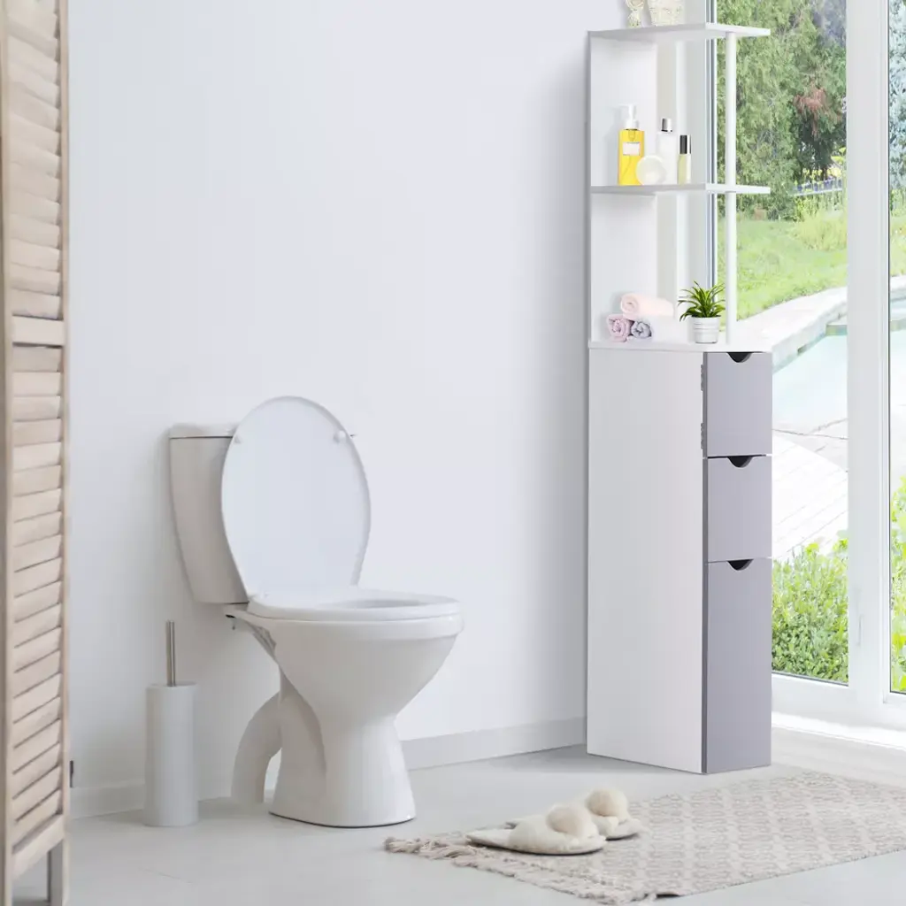 Are you looking for a small bathroom cabinet that occupies little space but still allows you to store many things? The HOMCOM 54" floor cabinet is a practical and multipurpose piece of furniture with shelves and drawers and is ideal for any bathroom, kitchen, or hallway. As for style, it's sleek, modern, and contemporary. This freestanding towel cabinet will undoubtedly help you organize all your bathroom essentials in a convenient place.