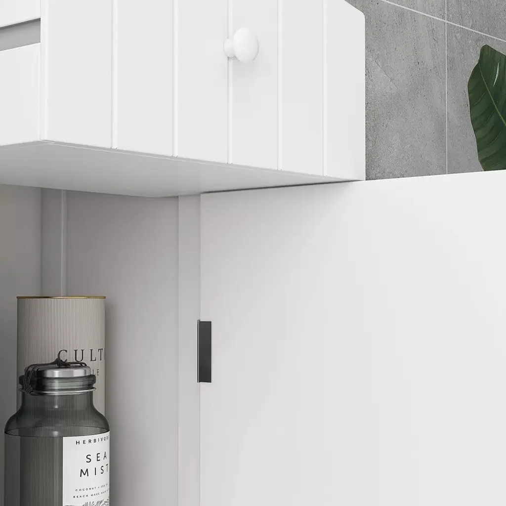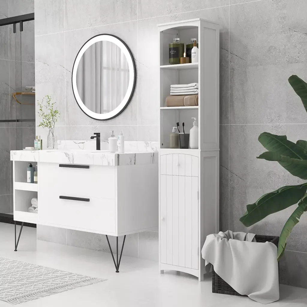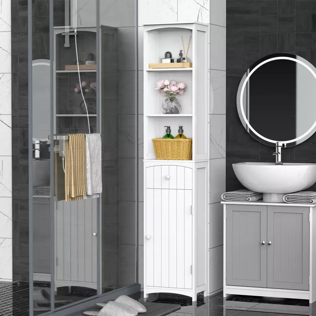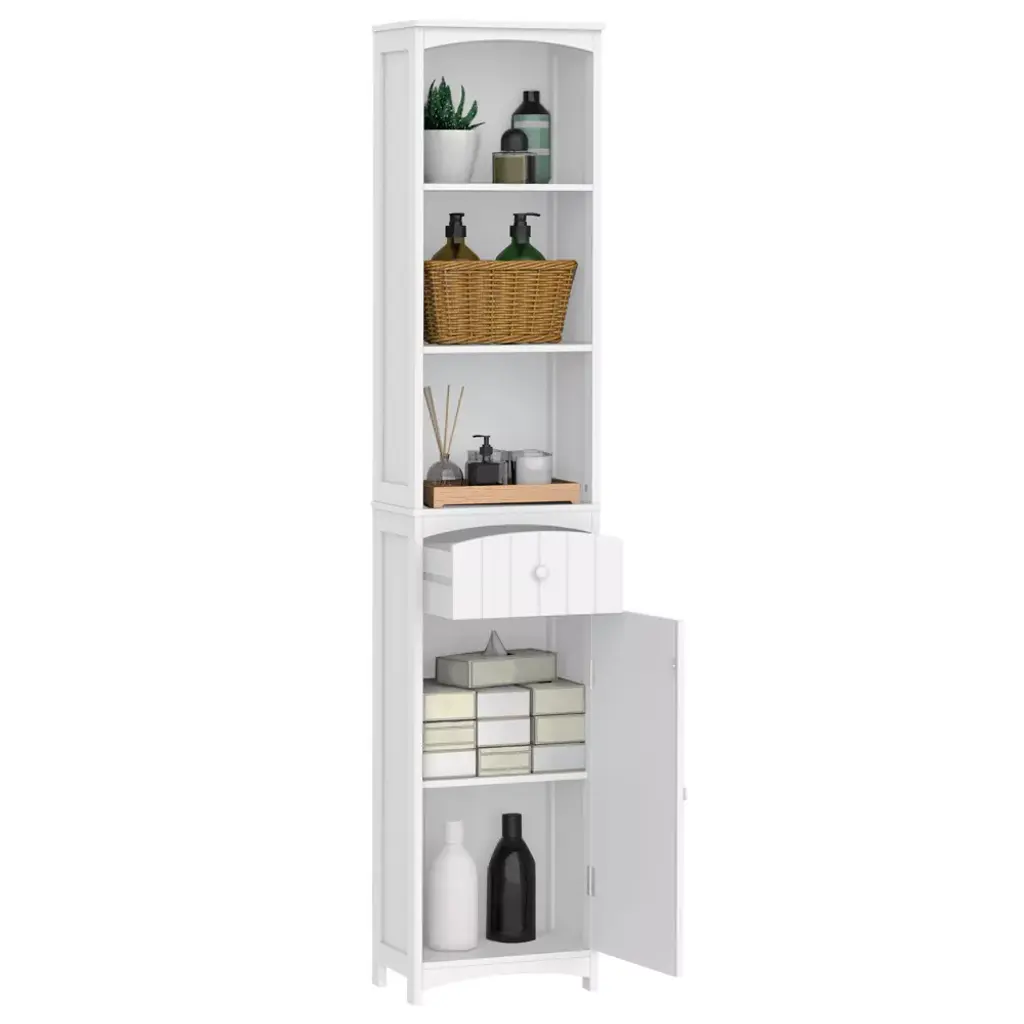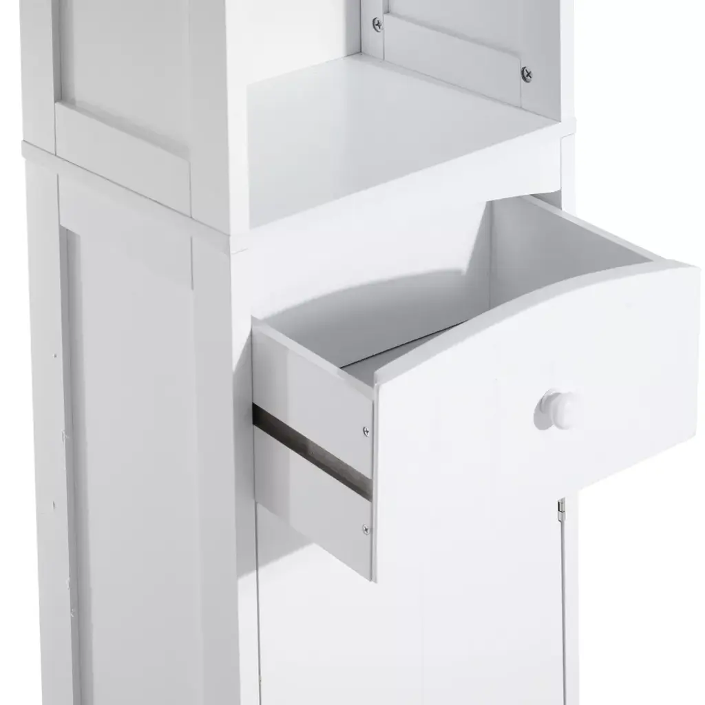 This HOMCOM corner cabinet with doors in soft white finish is a great addition to your bathroom area. You can enjoy the ample storage room with three upper shelves, a middle drawer, and a fully closed at the bottom. With this slim bathroom storage cabinet, you can reasonably store your bathroom essentials and keep the bathroom clean and tidy. Stylish and functional, a great item to enhance your home décor.