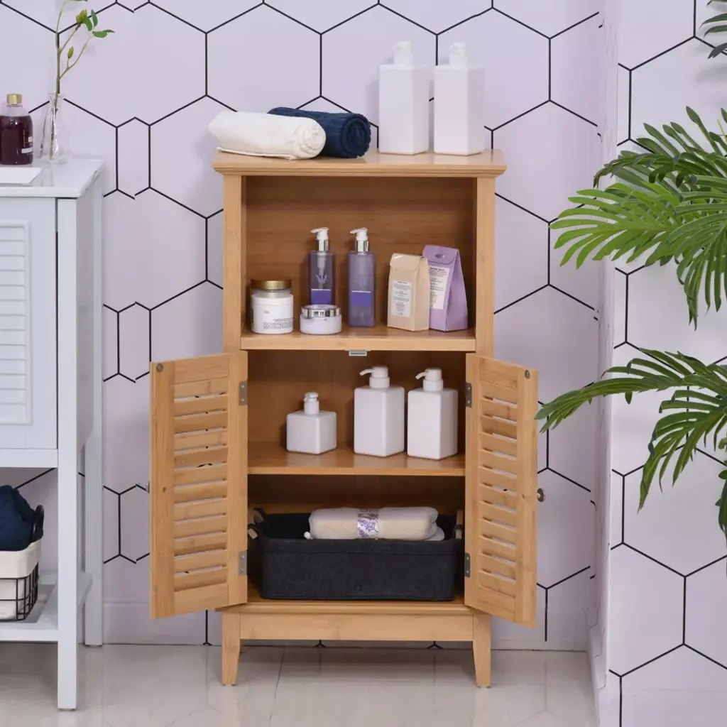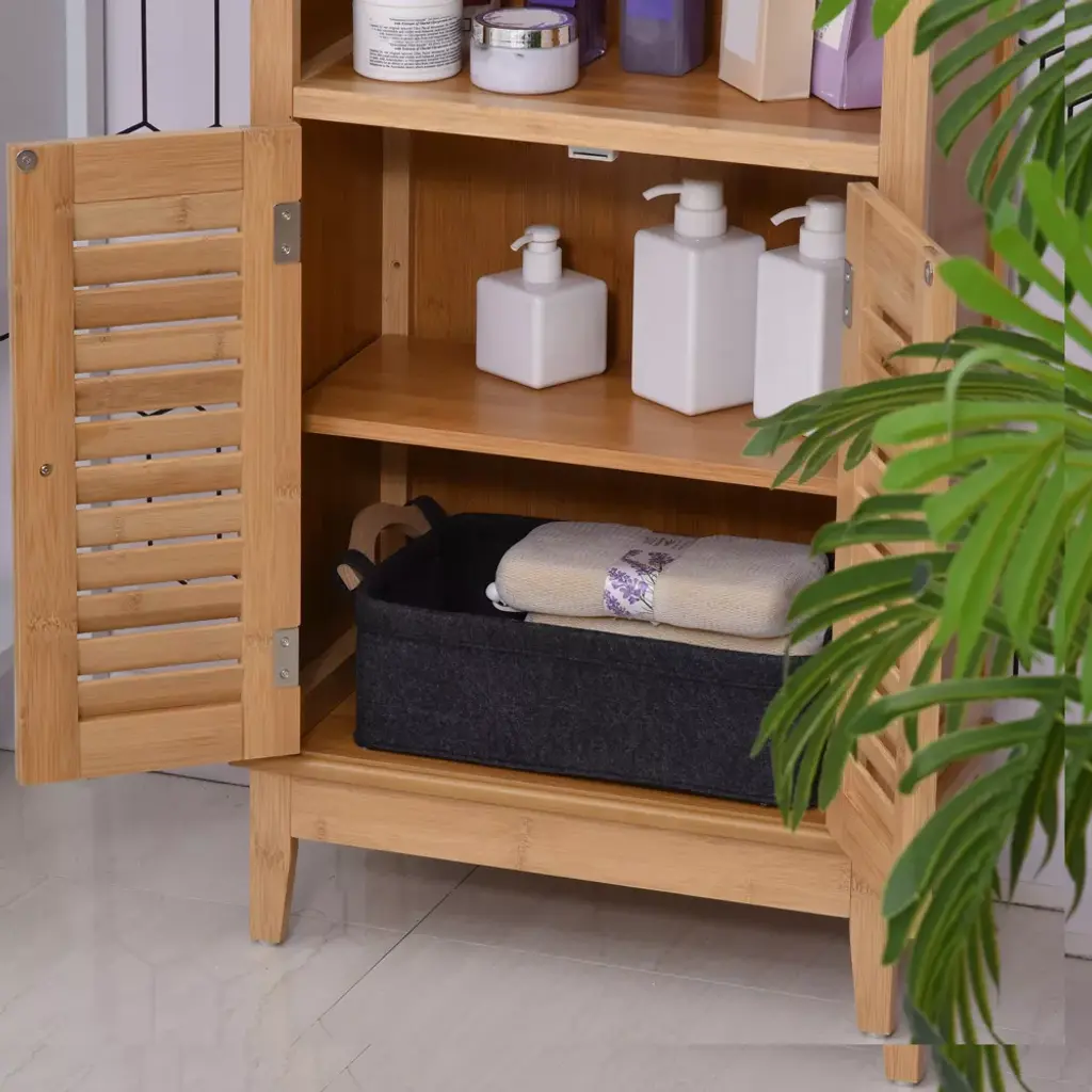 Homcom Bamboo Floor Cabinet Bathroom Floor Cabinet Living Room Organizer Tower With Multiple Shelves And Doors, Natural