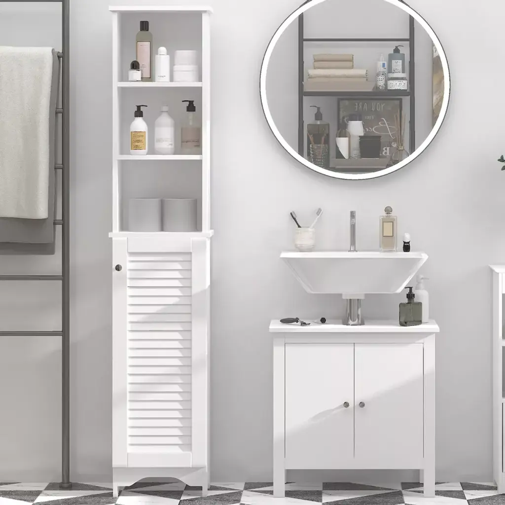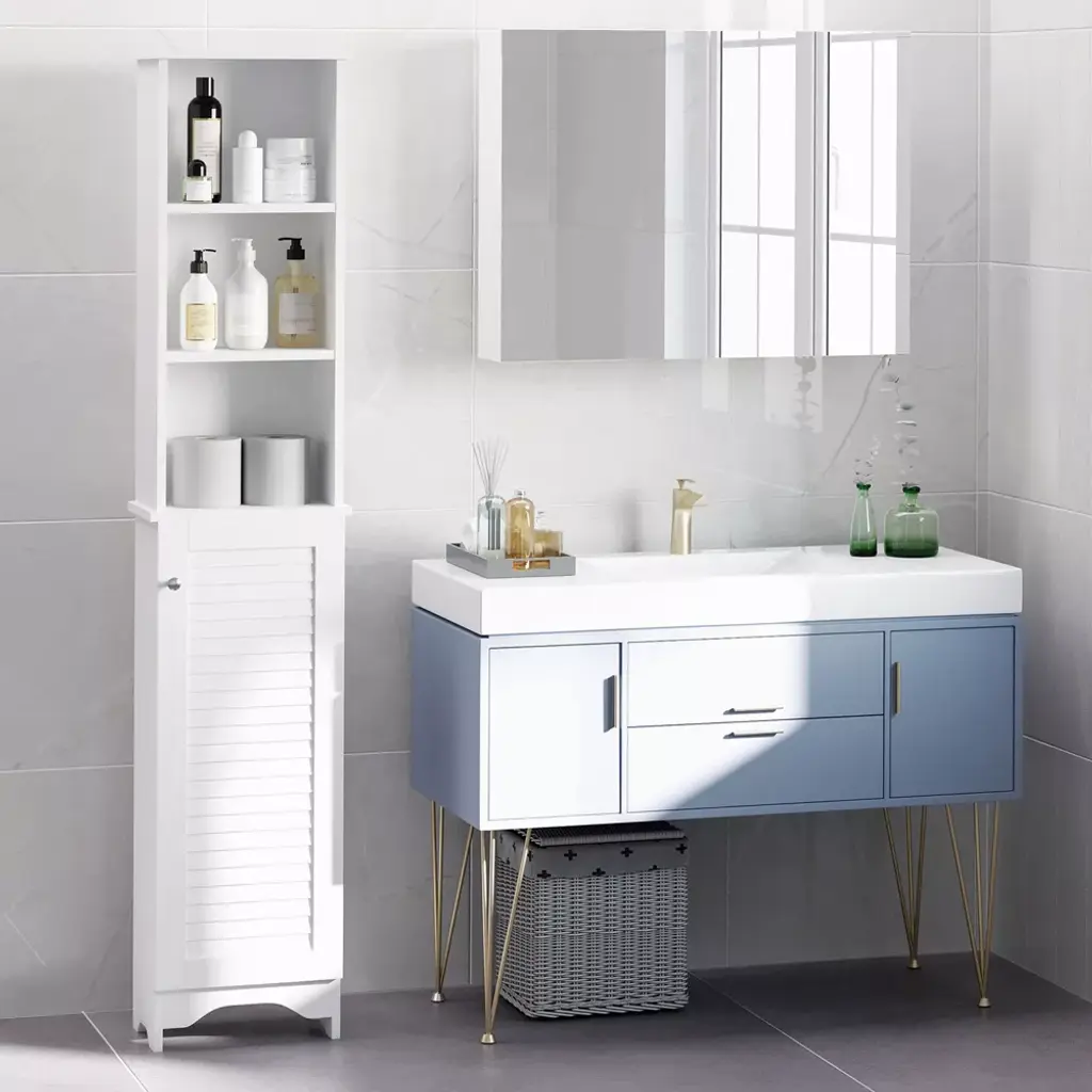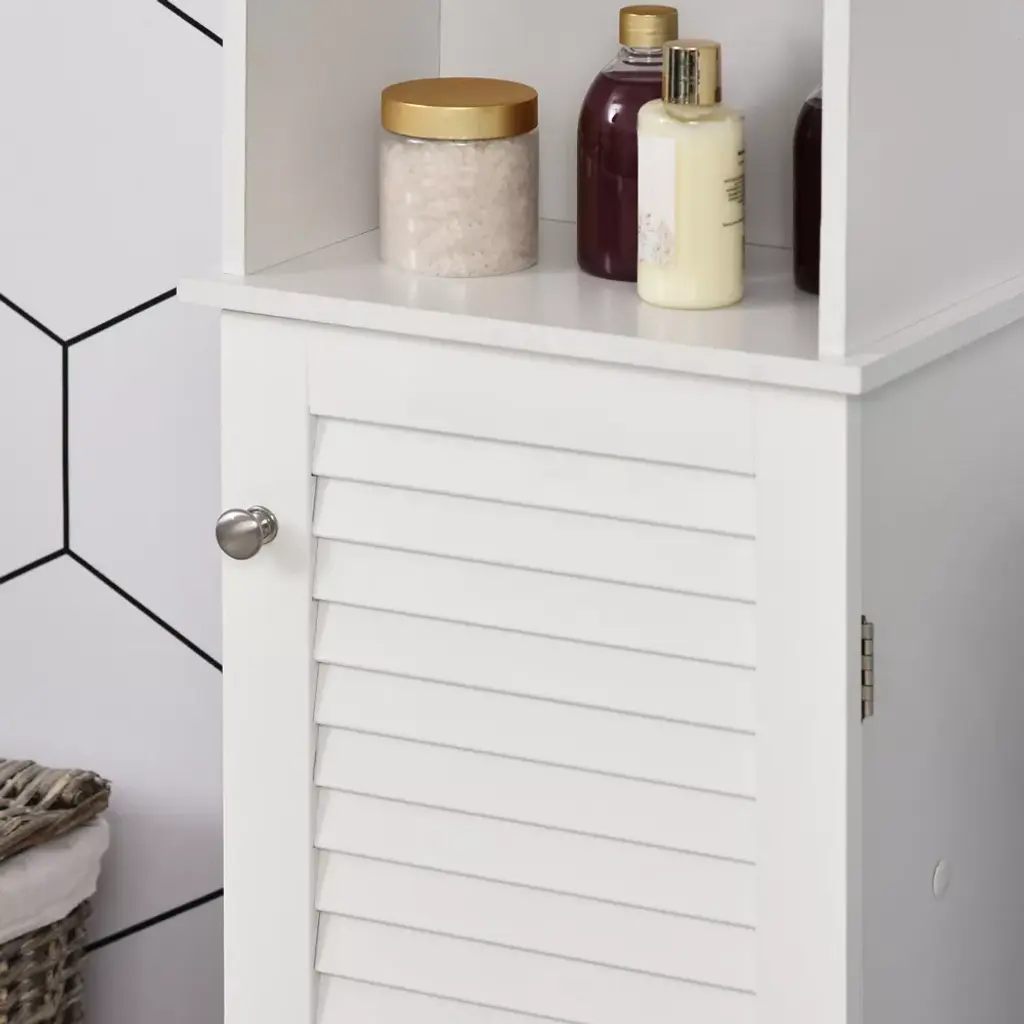 Check out this superbly designed contemporary tall bathroom cabinet from HOMCOM! With a chic shutter door and interior height-adjustable shelving, this cabinet can easily fit in narrow spaces while providing plenty of storage. It is made of MDF material that is quality and natural. Furthermore, this freestanding cabinet is versatile, allowing you to place storage in places that are normally unusable due to size. Checkout this freestanding bathroom cabinet from HomCom and get back to storage.