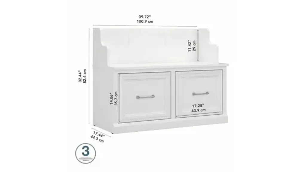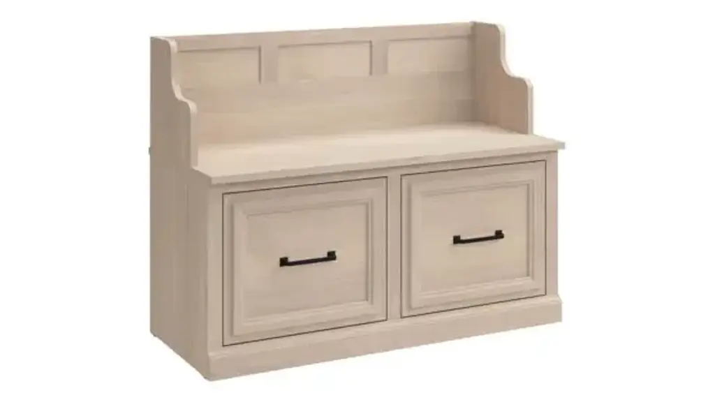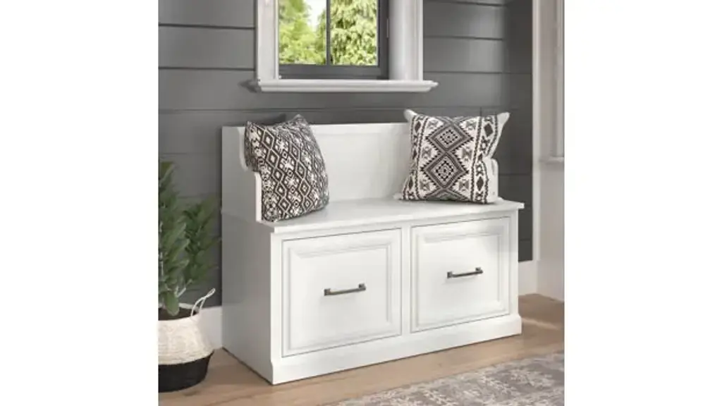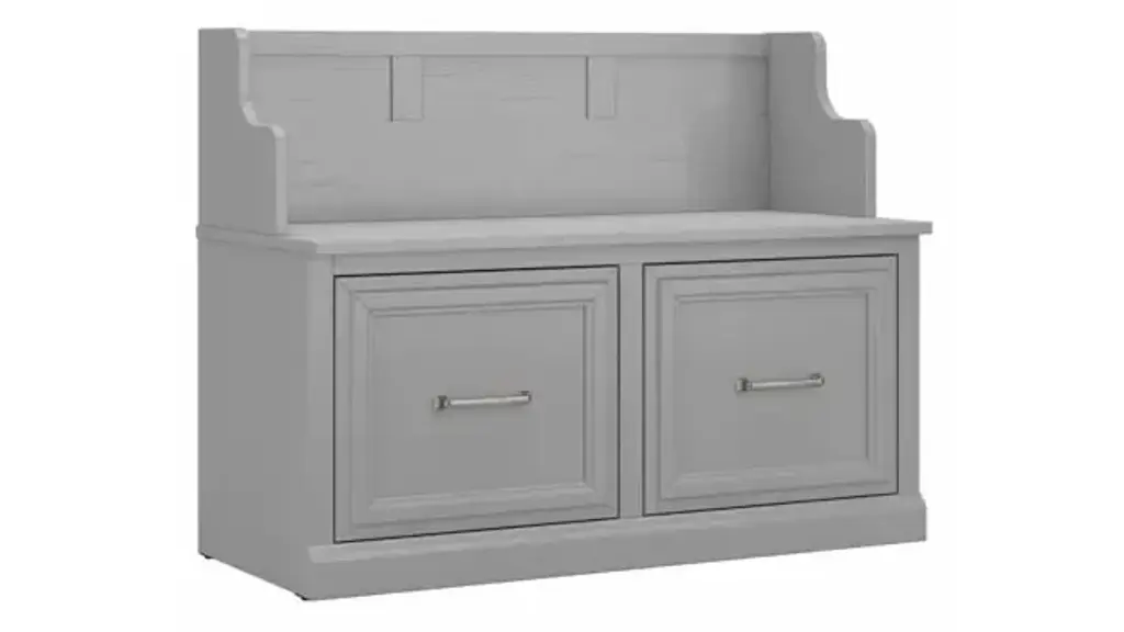 The Bush Furniture Woodland 40"W Entryway Bench with Doors combines transitional styling and a practical design to offer an ideal shoe storage solution. Have a seat on the durable shoe bench surface and take a moment to relax as you get ready to head out the door or come home after a long day. The top of the mudroom bench supports up to 250 lbs., so you can sit down to put on and take off your shoes or set shopping bags down after a trip to the store with confidence. Cabinet doors with Weathered Nickel handles conceal two internal compartments that keep footwear in order and out of sight. The entryway organizer's transitional design blends elements of contemporary and traditional styling to complement a wide range of home furnishings while your choice of finish options make it easy to find the perfect look for your space. This storage bench with back has been rigorously tested to meet Bush Furniture's standards for safety, performance and durability. See the full Woodland Collection to complete your home's entryway, mudroom or foyer with style. Overall Dimensions: 39.72"W x 17.44"D x 32.44"H. Ships ready for easy assembly.