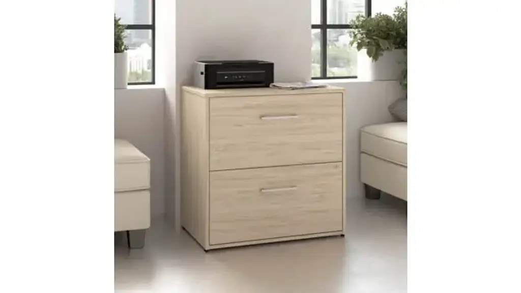 The Bush Business Furniture Hustle 2 Drawer Lateral File Cabinet provides the form and function needed to support your entrepreneurial spirit without breaking the bank. An ideal choice for small to medium-size businesses and home offices alike, the filing cabinet is a great way to keep letter, legal, and A4-size paperwork organized and accessible. Drawers open on smooth full-extension ball bearing slides for an easy reach to contents and are designed to extend one at a time for safety and stability. A single lock secures both drawers to safeguard documents with sensitive information as well as valuable items. Each drawer holds up to 60 lbs of materials. Coordinating items in the Hustle Collection include a variety of computer desks in addition to a mobile file cabinet, storage cabinet and 5 shelf bookcase (sold separately). Find the perfect look for your workspace with an array of attractive finish options. This 2 drawer file cabinet with lock has been meticulously designed and tested to meet or exceed ANSI/BIFMA quality standards for safety, durability, and performance. American made with U.S. and imported parts. Overall Dimensions: 29.65" W x 19.61" D x 30" H. Ships ready for easy assembly.