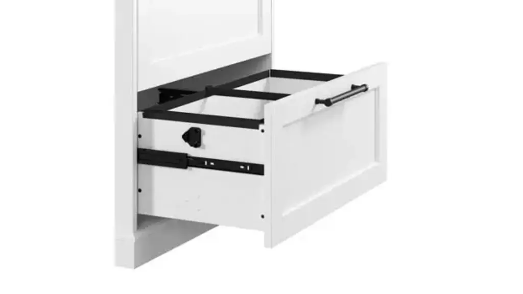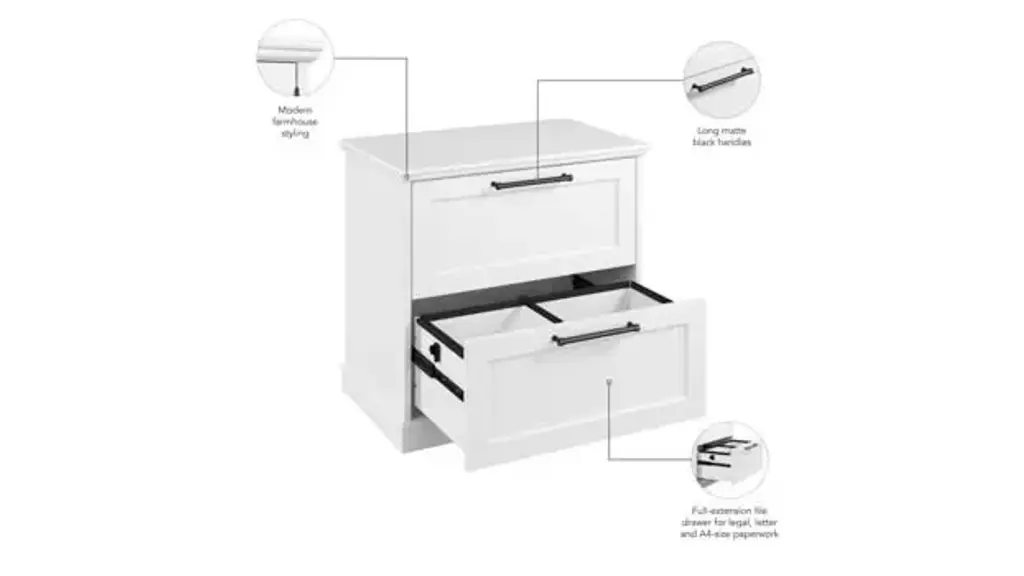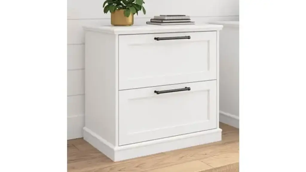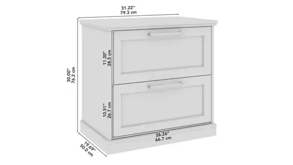 The Bush Furniture Westbrook 2 Drawer Lateral File Cabinet offers a perfect solution to help keep your work or living space in order. Two file drawers open on smooth full-extension ball bearing slides for an effortless reach to letter, legal, and A4-size documents. Each drawer supports up to 50 lbs of materials. The filing cabinet's surface can support up to 200 lbs, making it perfect for use as a small printer stand or for brightening up the room with your favorite plants and decorations. The home office file cabinet is adorned with long matte black handles and shaker-style drawer fronts to reflect the best elements of modern and farmhouse styling. Thanks to its style versatility, this beautiful filing cabinet suits a variety of home decor styles, from traditional, to contemporary. This two drawer file cabinet is a great choice for a home office or any other living space where you need file storage. The 2 drawer file cabinet has been meticulously tested to meet or exceed industry standards for safety, durability, and performance. Create a cohesive home office space with coordinating items from the Westbrook Collection, including home office desks, bookcases, storage cabinets, and more. Overall Dimensions: 31.22" W x 19.69" D x 30" H/ Ships ready for easy assembly.