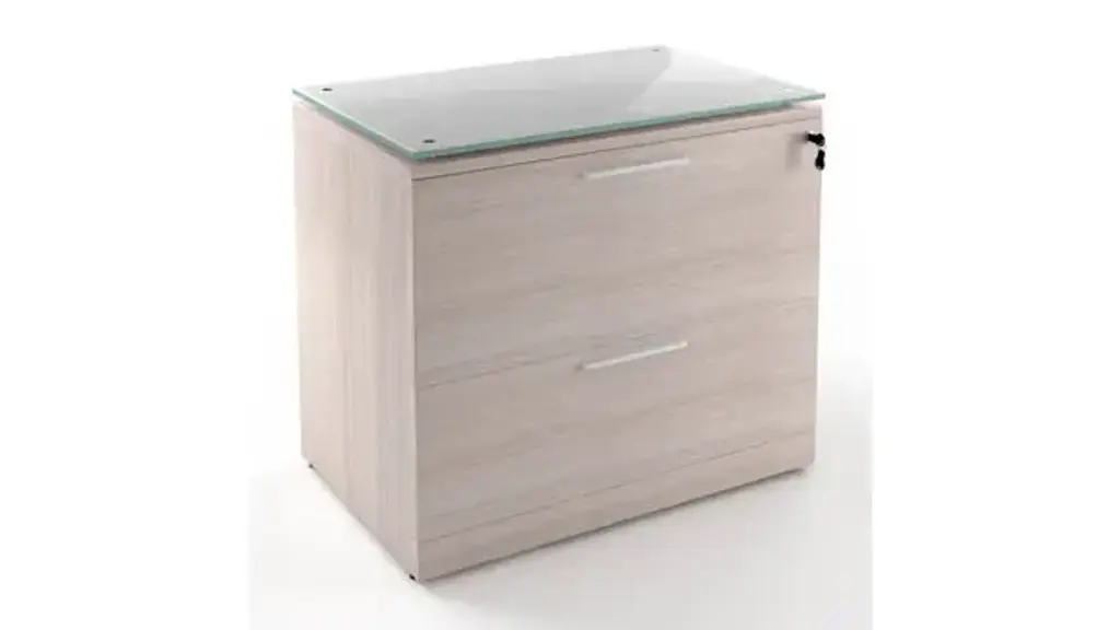 The Potenza Series propose a unique versatile design. Our low glared thermofused laminate offers a rich wood look & feel. The matching 3mm PVC edge offers comfort & protection. File Features include: * 8" wide contemporary aluminum pulls * Floated white glass top * Locking drawers * Full extension ball bearing slides Ships fully assembled.