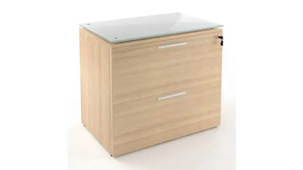 The Potenza Series propose a unique versatile design. Our low glared thermofused laminate offers a rich wood look & feel. The matching 3mm PVC edge offers comfort & protection. File Features include: * 8" wide contemporary aluminum pulls * Floated white glass top * Locking drawers * Full extension ball bearing slides Ships fully assembled.