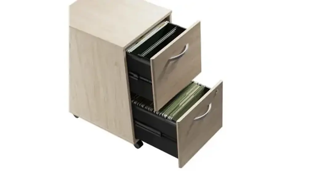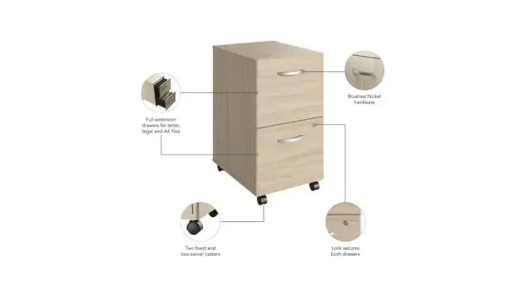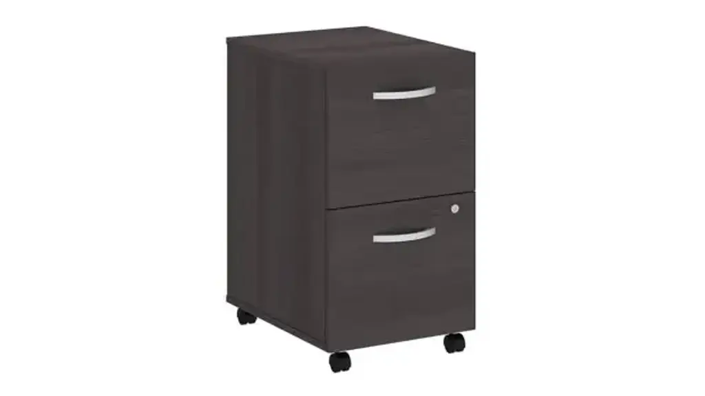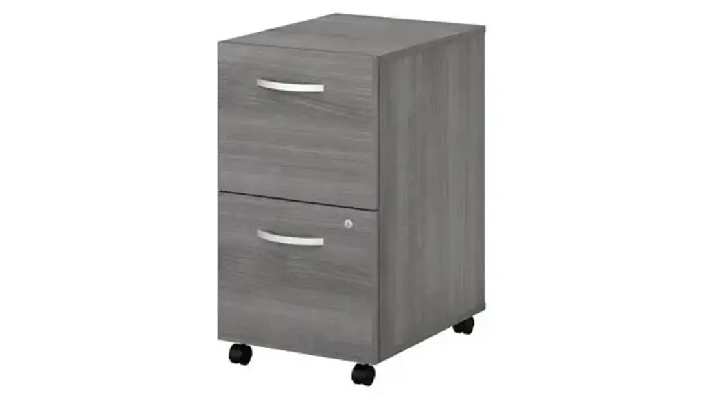 The Bush Business Furniture Studio C 2 Drawer Mobile File Cabinet rolls with you throughout your office or remains in place as needed on any surface. You'll have your letter, legal and A4-size paperwork organized in no time as the Mobile File Cabinet ships fully assembled for your convenience. Both drawers open on full-extension ball-bearing slides, making it easy to reach those pesky files all the way at the back. Dual-wheeled, hooded casters keep the 2 drawer cabinet moving wherever you want or remain in place on your office floor or carpet. A single lock secures both drawers to keep your paperwork private. When space is at a premium, the Mobile File Cabinet conveniently fits under your desk. Eye-catching Brushed Nickel drawer pulls complement the finish to make the cabinet as attractive as it is functional. Meets ANSI/BIFMA quality test standards. See the full collection for coordinating items available to make your office your own with Studio C. American made with U.S. and imported parts. Overall Dimensions: 15.71" W x 20.2" D x 27.79" H. Ships fully assembled.