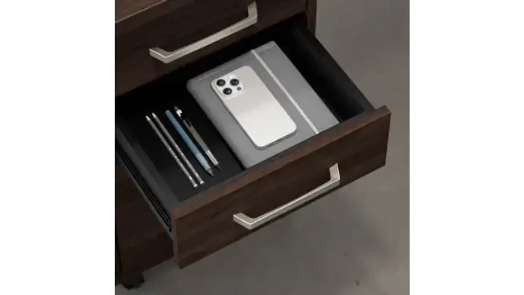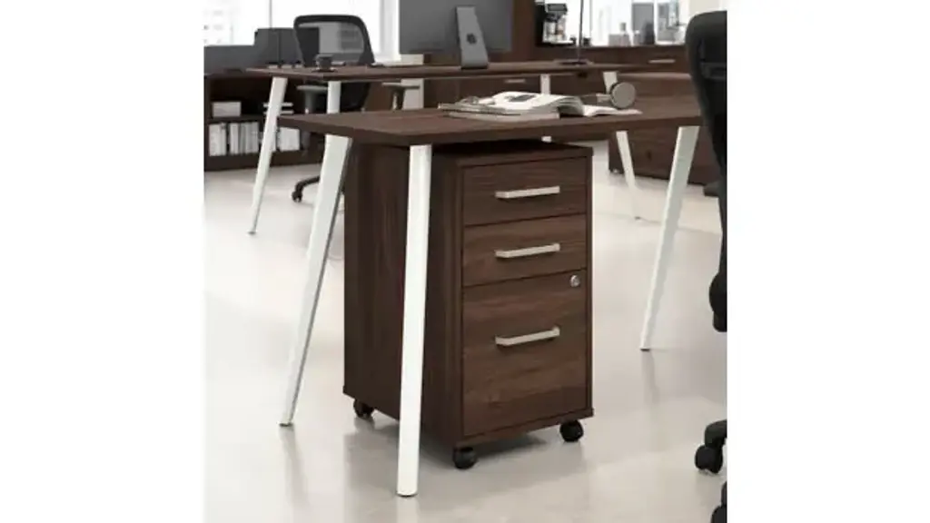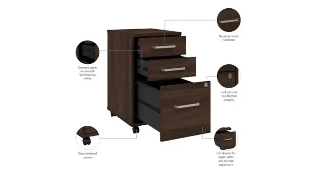 The Bush Business Furniture Vista 3 Drawer Mobile File Cabinet keeps any office or workspace organized and clutter-free, adding a modern touch and extra storage where it's needed. It features one file drawer for legal, letter, and A4-size paperwork and two box drawers for small office supplies. The drawers open smoothly on full-extension ball bearing slides, with box drawers supporting up to 15 pounds each and the file drawer up to 30 pounds. The cabinet has a single lock that secures the two bottom drawers for added security. Dual-wheeled casters provide mobility, and the unit fits neatly under coordinating Vista desks. Finished on all sides, it looks great in any direction in a private office or open floor plan. Available in several contemporary finishes paired with attractive brushed nickel hardware. Bush Business Furniture's commitment to safety includes rigorous testing that meets or exceeds ANSI/BIFMA x5.5 commercial test standards. Made in North America with globally sourced materials. Overall dimensions: 15.67" W x 19.69" D x 27.36" H. Ships fully assembled.