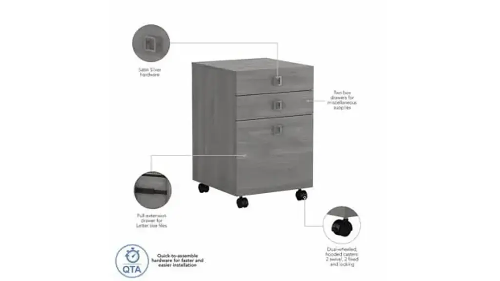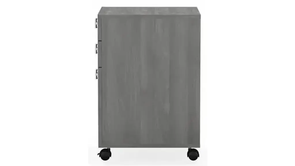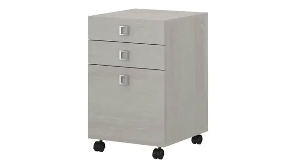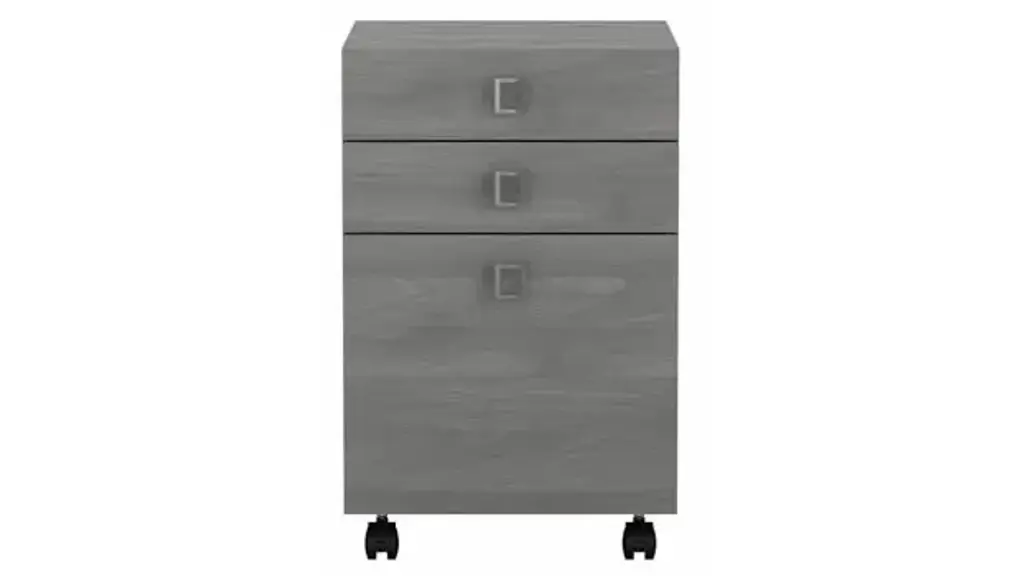 Blend style, flexibility and reliability at work or in your home. The Bush Business Furniture Echo 3 Drawer Mobile File Cabinet has laminate finishes with fashionable Satin Silver hardware to inspire your professional best. Give your workspace commercial-grade quality that promotes growth and productivity with convenient, reliable features. This contemporary filing cabinet provides two box drawers for office supplies and utensils as well as a full-extension file drawer that opens on smooth ball bearing slides for an easy reach to letter size documents. Four dual-wheeled hooded casters allow the Cabinet to roll wherever you need storage and can be locked in place for secure positioning. Slide the Mobile File Cabinet underneath your desk or move wherever you need supplies and paperwork. A durable, thermally fused laminate finish maintains the beautiful appearance for years. Available in several laminate finishes with Satin Silver Hardware. The Mobile File Cabinet meets ANSI/BIFMA quality standards for safety and performance. Browse our full line of contemporary furniture to create an office set you'll love for years to come. Celebrate your unique style and personality with the Echo Collection. Ships ready for easy assembly.