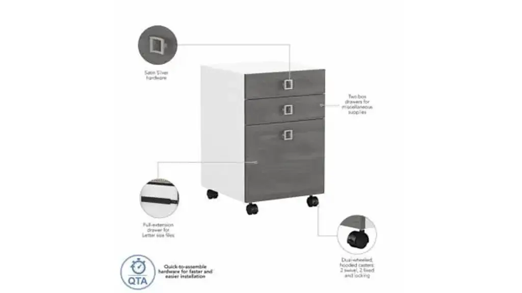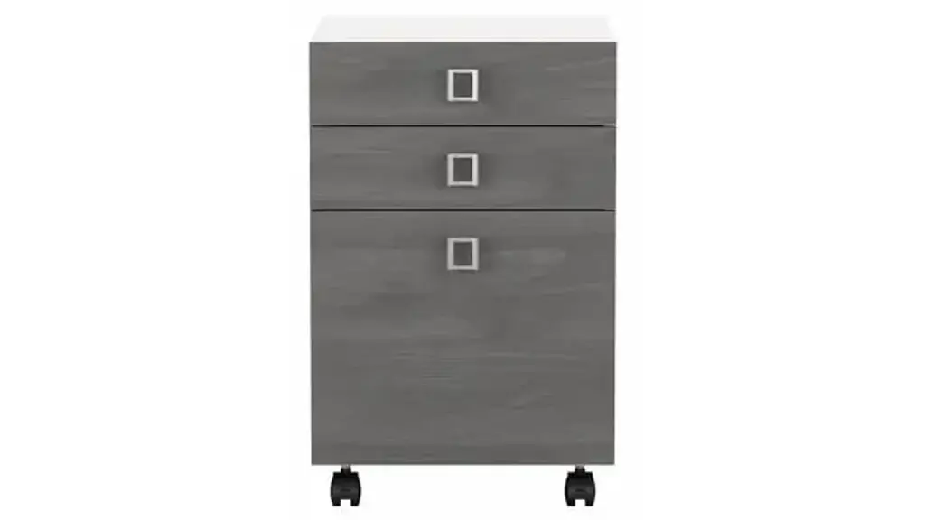 Blend style, flexibility and reliability at work or in your home. The Bush Business Furniture Echo 3 Drawer Mobile File Cabinet has laminate finishes with fashionable Satin Silver hardware to inspire your professional best. Give your workspace commercial-grade quality that promotes growth and productivity with convenient, reliable features. This contemporary filing cabinet provides two box drawers for office supplies and utensils as well as a full-extension file drawer that opens on smooth ball bearing slides for an easy reach to letter size documents. Four dual-wheeled hooded casters allow the Cabinet to roll wherever you need storage and can be locked in place for secure positioning. Slide the Mobile File Cabinet underneath your desk or move wherever you need supplies and paperwork. A durable, thermally fused laminate finish maintains the beautiful appearance for years. Available in several laminate finishes with Satin Silver Hardware. The Mobile File Cabinet meets ANSI/BIFMA quality standards for safety and performance. Browse our full line of contemporary furniture to create an office set you'll love for years to come. Celebrate your unique style and personality with the Echo Collection. Ships ready for easy assembly.