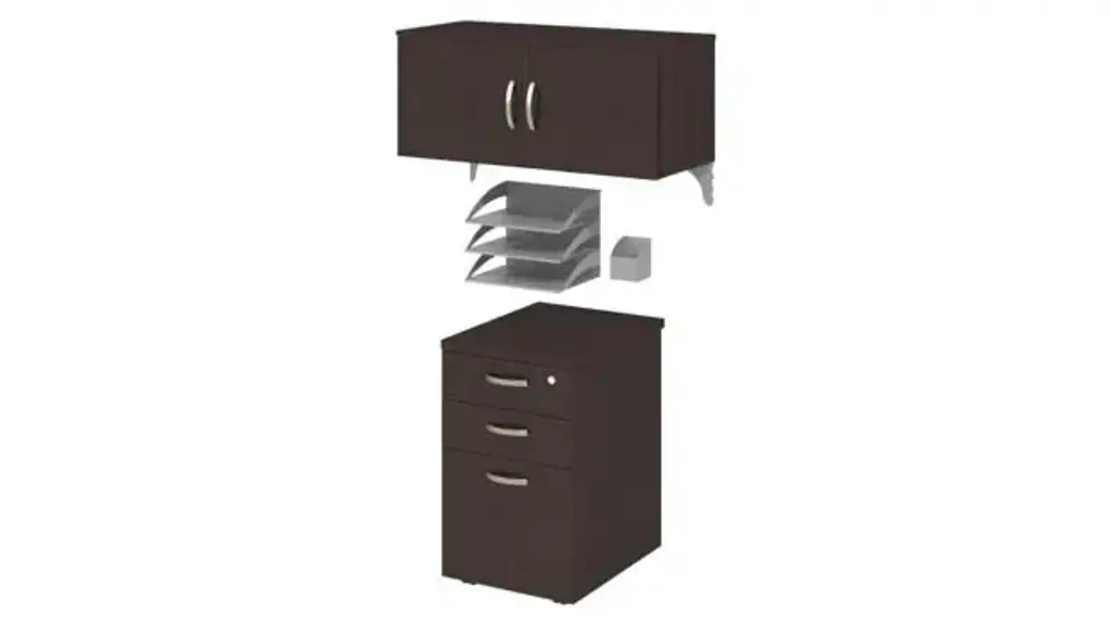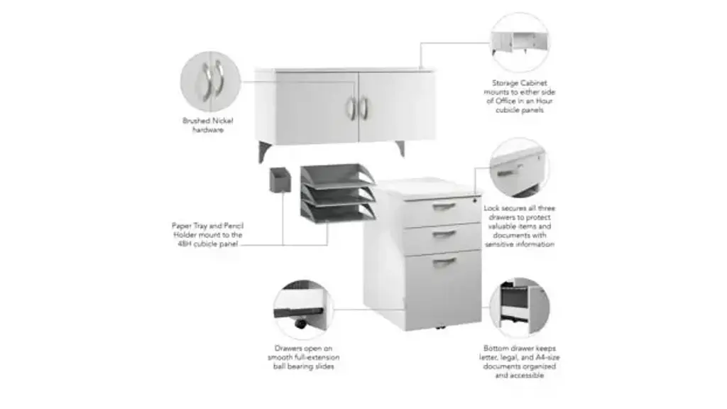 The Bush Business Furniture Office in an Hour Storage and Accessory Kit is ready when you are. This convenient accessory set includes a Storage Cabinet, Adjustable Paper Tray, Pencil Cup and Mobile File Cabinet. The assembled Storage Cabinet mounts to a framed 63"H Office in an Hour Panel and includes necessary hardware. The Mobile File Cabinet drawers open on full-extension ball bearing slides for a smooth and easy reach to the back. Roll the Cabinet anywhere on convenient casters or store it under your desk to conserve space. Two box drawers work great for personal items, pens and paper, while a file drawer holds letter and legal-sized folders. A single lock secures all three drawers to protect valuable items and documents with sensitive information. The Paper Tray and Pencil Cup mount to a 48"H Office in an Hour Panel to further organize your work surface. This collection turns open spaces into efficient, collaborative work environments in no time. The commercial-grade Office in an Hour meets ANSI/BIFMA standards for safety and performance. See the full collection for coordinating items available. Overall Dimensions: 31.50"W x 2008"D x 25.37"H. Mobile File Cabinet and Storage Cabinet ship fully assembled.