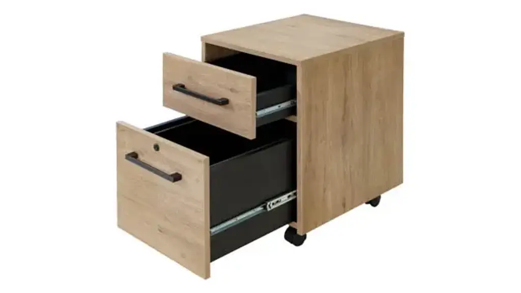 Mason uses Thermal Fused Laminate wood or "TFL" to create a durable office collection that will stand the test of time. Solid wood framing accents the laminate and lends a modern appeal, while contemporary metal hardware completes the look. The Mason collection provides functionality with storage and space saving options and fits perfectly in any home or executive office. One utility drawer for office storage needs, and one locking file drawer to ensure privacy. Superior drawer construction with full suspension ball bearing glides and precision channel joints. Wheels on base allow easy placement in any room or office space. Sophisticated black metal hardware. Finished on all sides. Overall Dimensions: 18" W x 20" D x 24" H. Ships Fully Assembled.