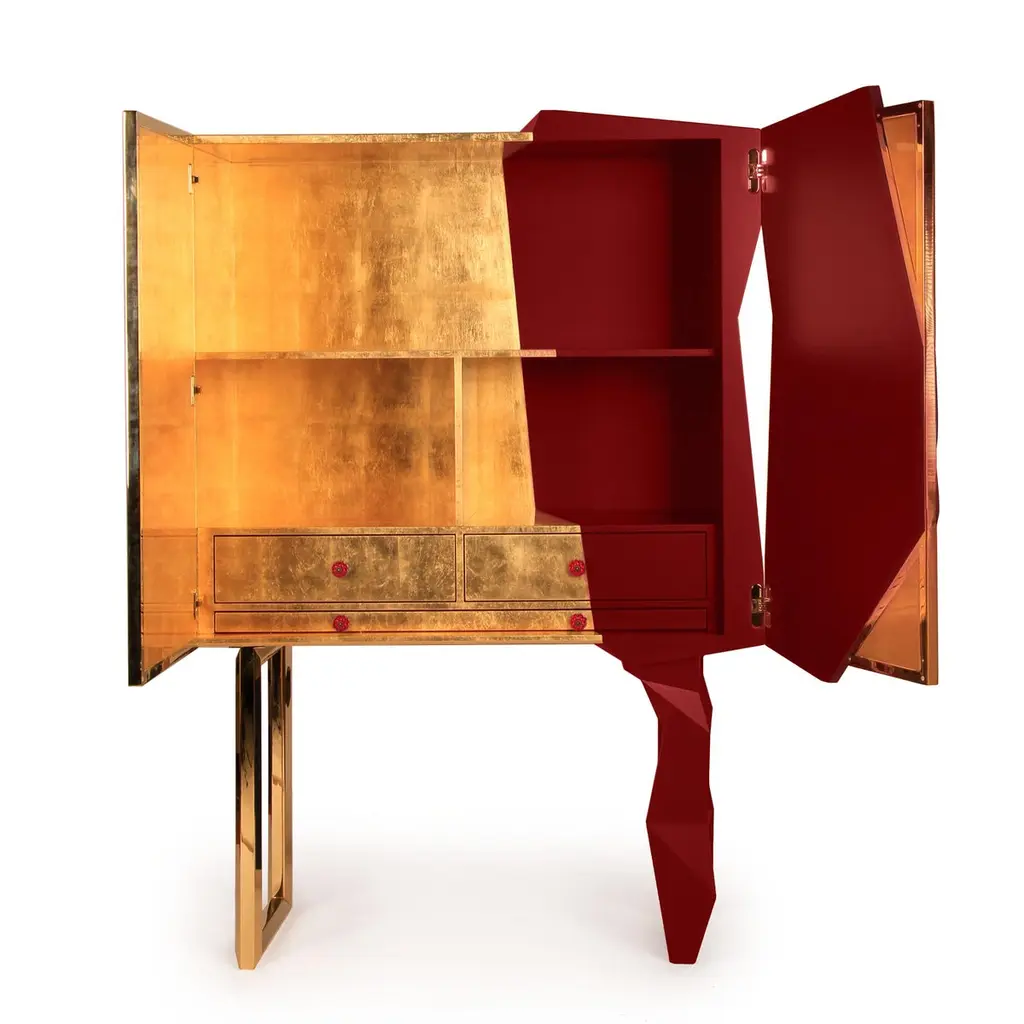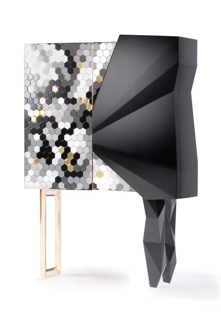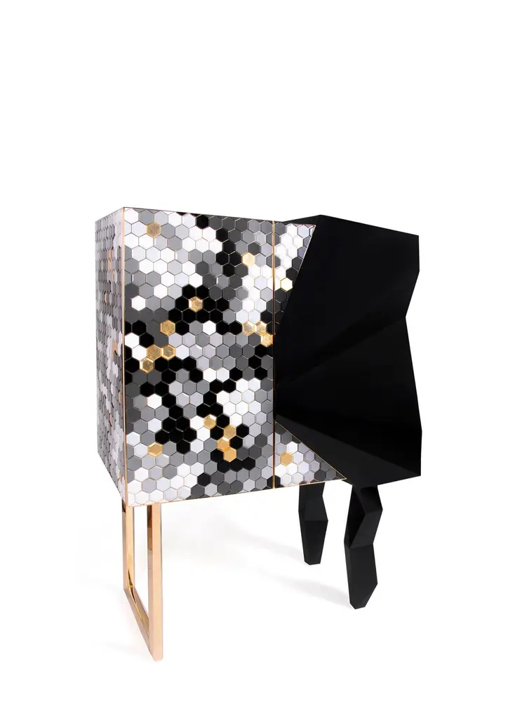 Honeycomb Emerald cabinet, Royal StrangerDimensions: 185 x 126 x 60 cmMaterials: Black pearl color combination with gold leaf and stainless steel coated in brass.Inspired by one of the most intrinsic forms of nature, this sideboard transforms your home into a transcendent and inspiring place. The honeycomb visual form hides a pixelated floral scenario that serves as a motto to the logic of an entire piece inspired by nature. The homogeneous and sweet form ends in a robust solidify of sensations that complement and confront each other on the same line of context. In a different experience, the interior reveals a luxurious essence of light and shadow lined with contrasts, transposing to an almost divine sensation.Royal stranger is an exclusive furniture brand determined to bring you the best unique pieces of art and design.Fusing design, art and the best craftsmanship, they strive to deliver the best state of the handmade art furniture. The design team works every day to create meaningful products that represent values such as passion, function, aesthetics and know-how. Values that are meant to represent Royal stranger’s DNA. This dedication is present at all stages of production and the combination of craftsmanship and innovative design contributes toour final purpose: to produce certified high-quality products, made with passion and expertise and using royal materials such as gold leaf, rich woods and high quality lacquers.It was in 2013, as an architects, that Sofia Santos & Rui Santos started to push the boundaries of innovation in several retail design concepts for some of the best stores in Portugal. This will has always been present in their work, and that’s how the brand was born.