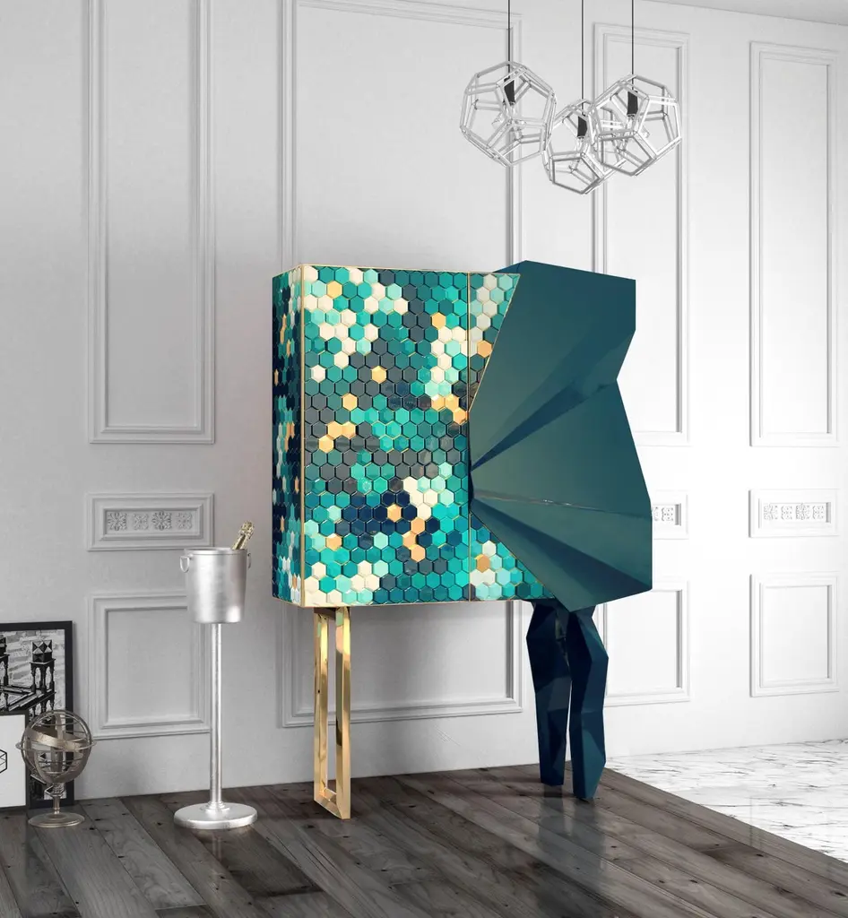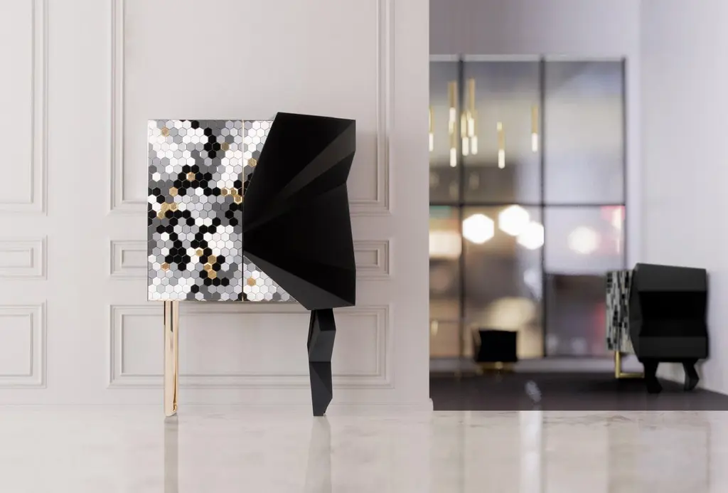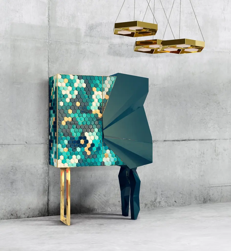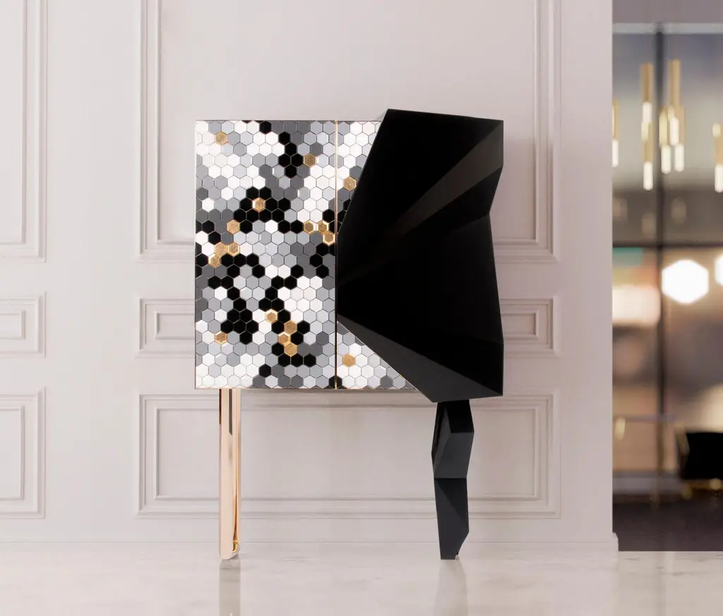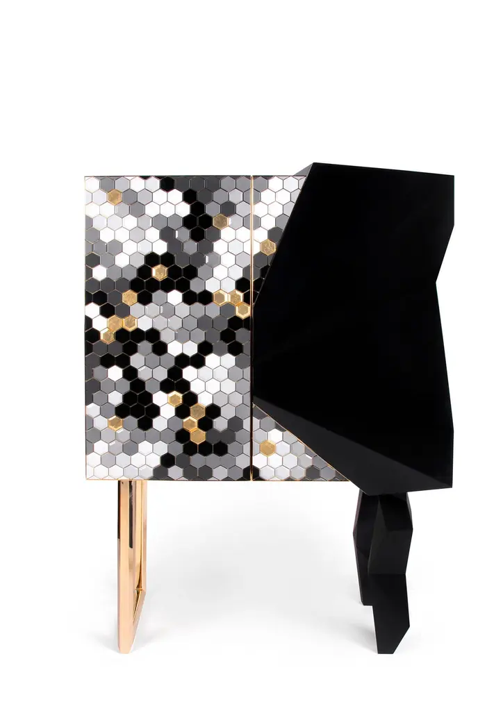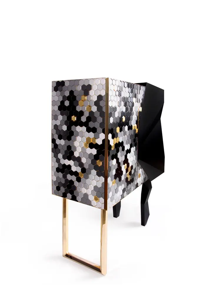 Honeycomb ruby cabinet - Royal StrangerDimensions: 185 x 126 x 60 cm.Materials: Black pearl color combination with gold leaf and stainless steel coated in brass.Inspired by one of the most intrinsic forms of nature, this sideboard transforms your home into a transcendent and inspiring place. The honeycomb visual form hides a pixelated floral scenario that serves as a motto to the logic of an entire piece inspired by nature. The homogeneous and sweet form ends in a robust solidify of sensations that complement and confront each other on the same line of context. In a different experience, the interior reveals a luxurious essence of light and shadow lined with contrasts, transposing to an almost divine sensation.Royal stranger is an exclusive furniture brand determined to bring you the best unique pieces of art and design.Fusing design, art and the best craftsmanship, they strive to deliver the best state of the handmade art furniture. The design team works every day to create meaningful products that represent values such as passion, function, aesthetics and know-how. Values that are meant to represent Royal stranger’s DNA. This dedication is present at all stages of production and the combination of craftsmanship and innovative design contributes toour final purpose: to produce certified high-quality products, made with passion and expertise and using royal materials such as gold leaf, rich woods and high quality lacquers.It was in 2013, as an architects, that Sofia Santos & Rui Santos started to push the boundaries of innovation in several retail design concepts for some of the best stores in Portugal. This will has always been present in their work, and that’s how the brand was born.