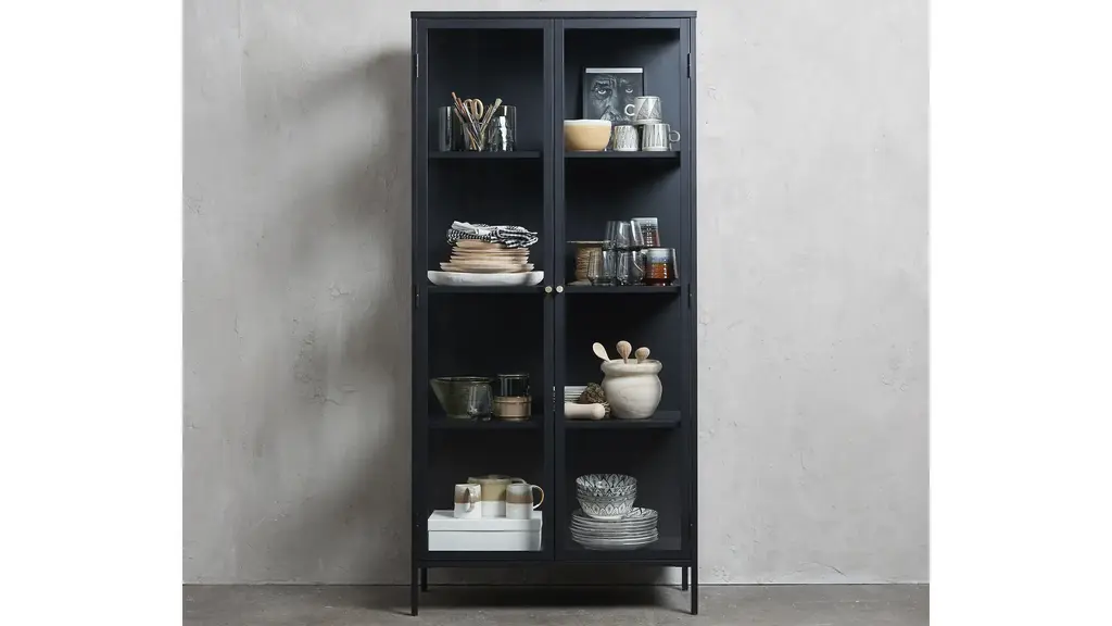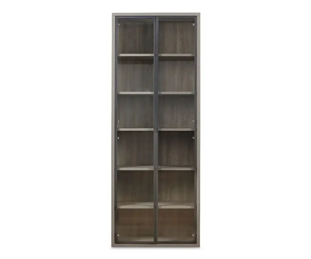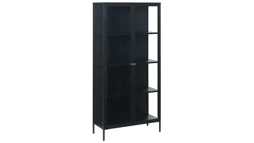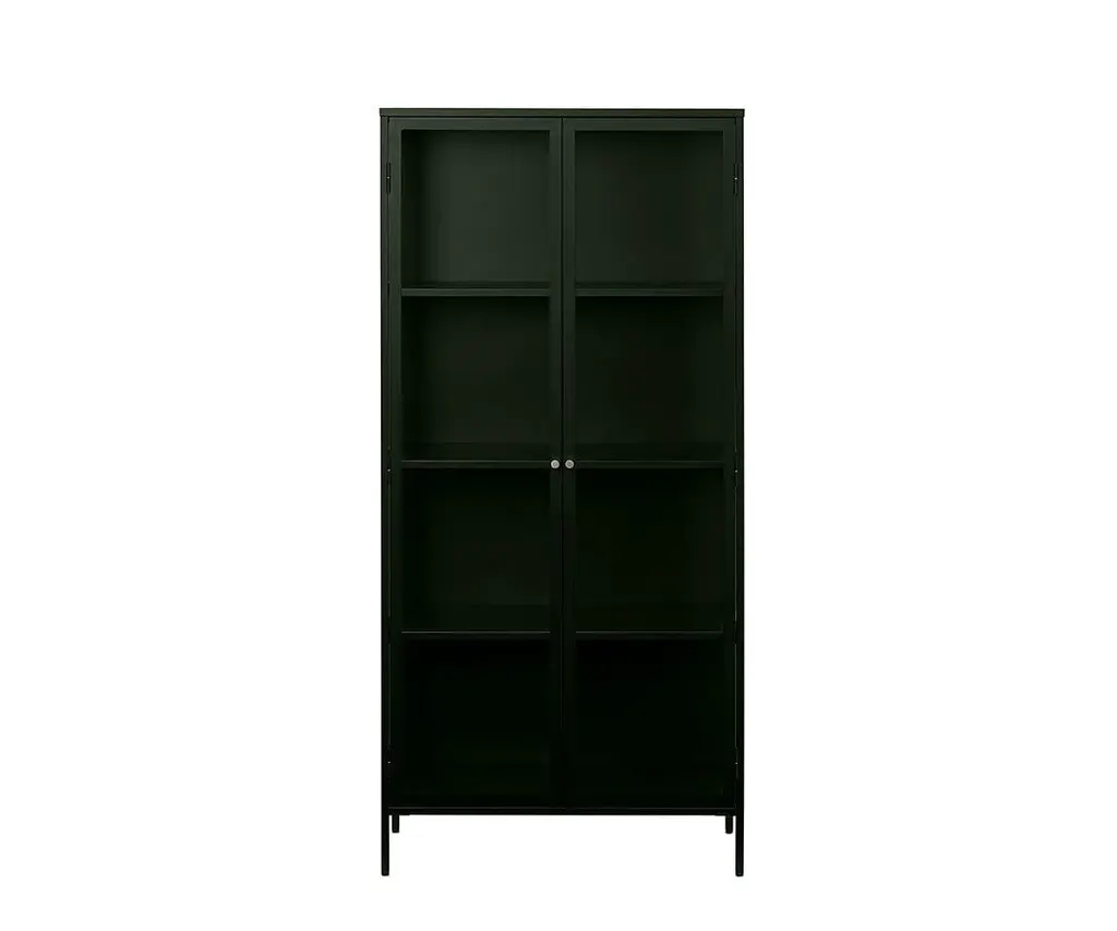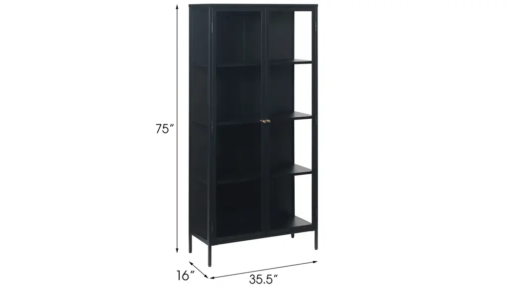 Enjoy a more refined take on the modern design aesthetic with the Hudson China Cabinet. This metal two door China cabinet is designed with two large glass panel door fronts, four shelves, and a simple black metal framework, making it the perfect home for your favorite pottery, books, and other collected curiosities. The design is timeless and complements any range, color or texture so feel free to mix it up with both natural wooden colors, darker smoked stains and bold colors from fabrics or simply use it as a "stand-alone" statement piece.