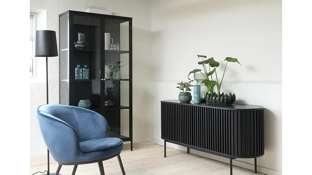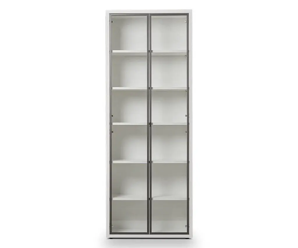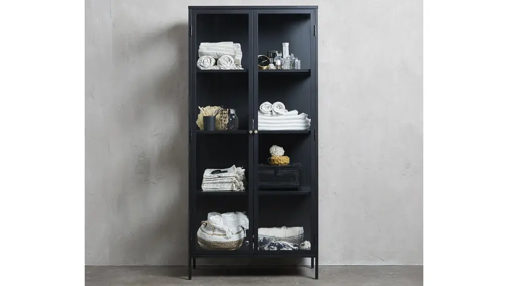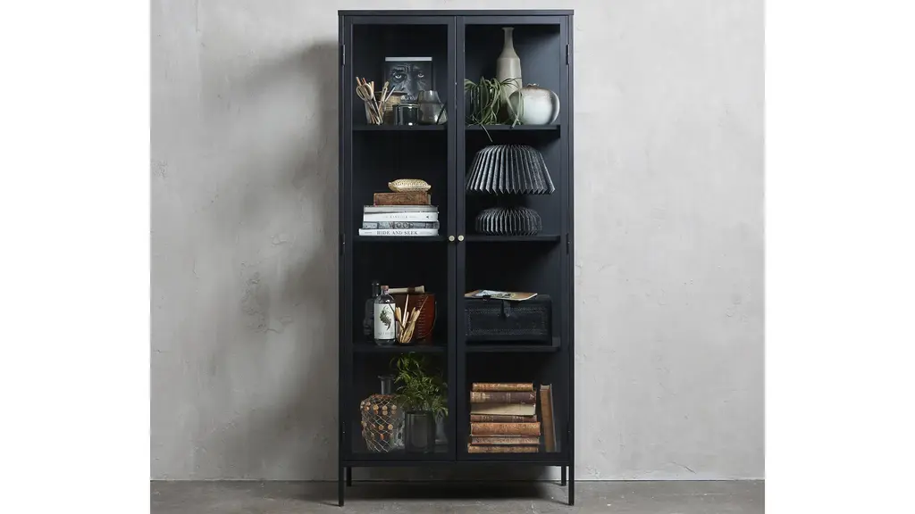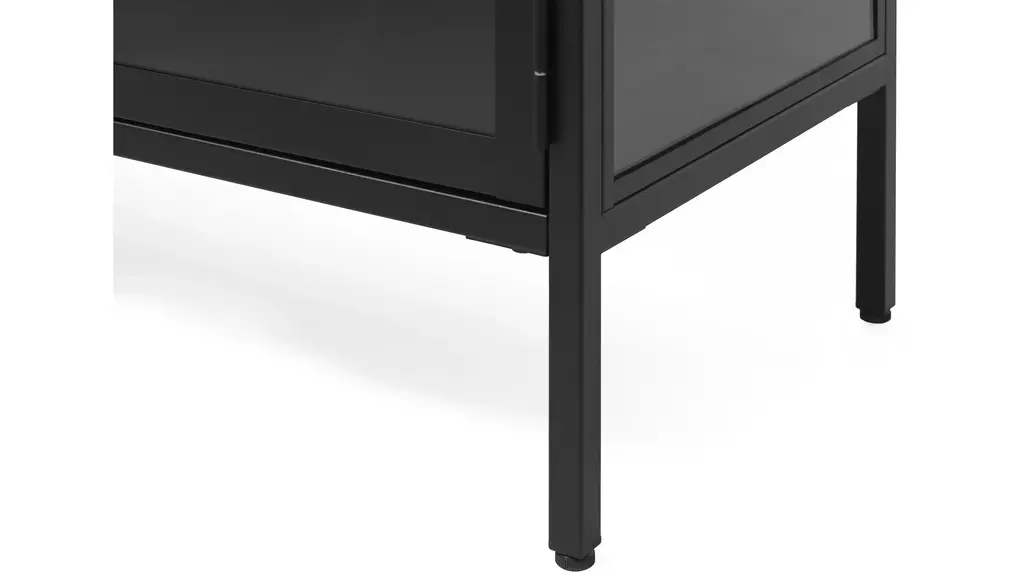 Enjoy a more refined take on the modern design aesthetic with the Hudson China Cabinet. This metal two door China cabinet is designed with two large glass panel door fronts, four shelves, and a simple black metal framework, making it the perfect home for your favorite pottery, books, and other collected curiosities. The design is timeless and complements any range, color or texture so feel free to mix it up with both natural wooden colors, darker smoked stains and bold colors from fabrics or simply use it as a "stand-alone" statement piece.