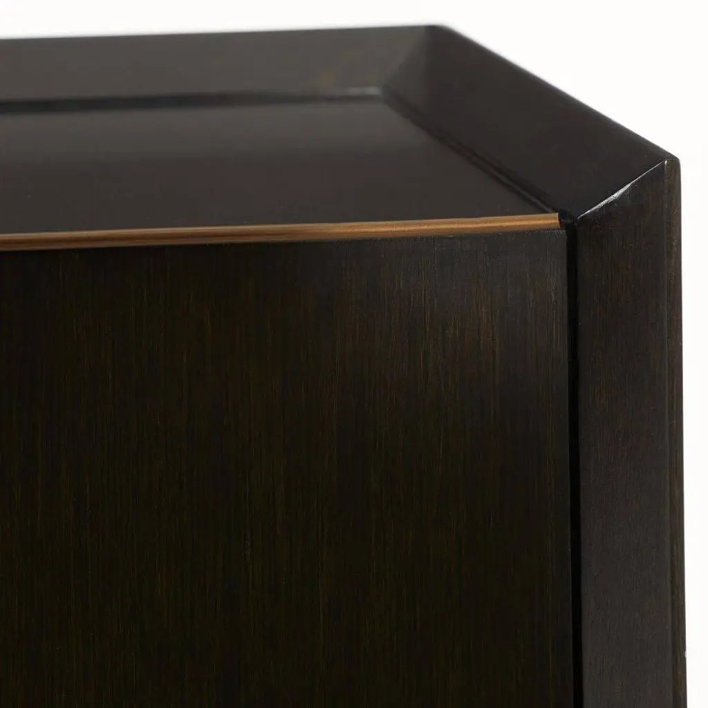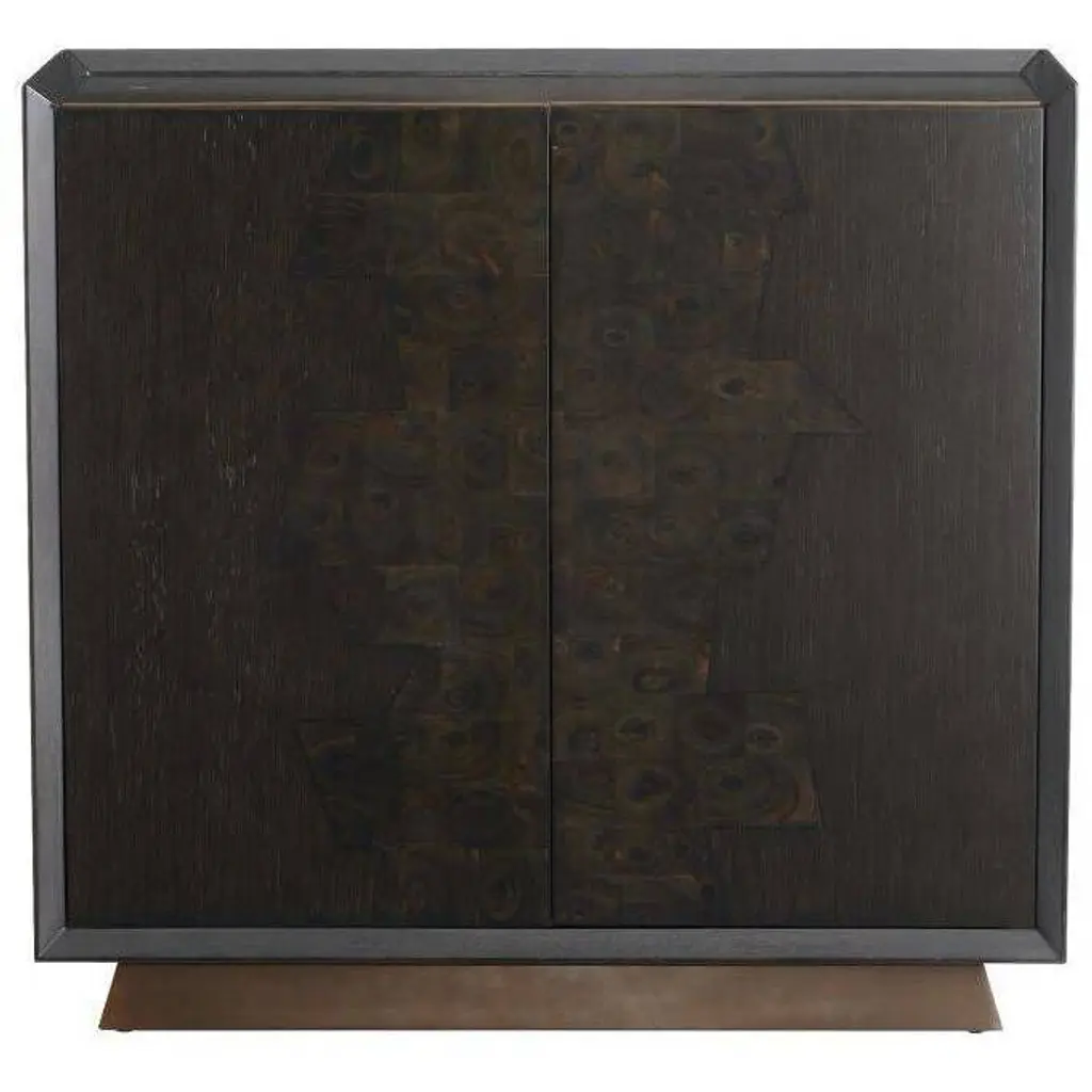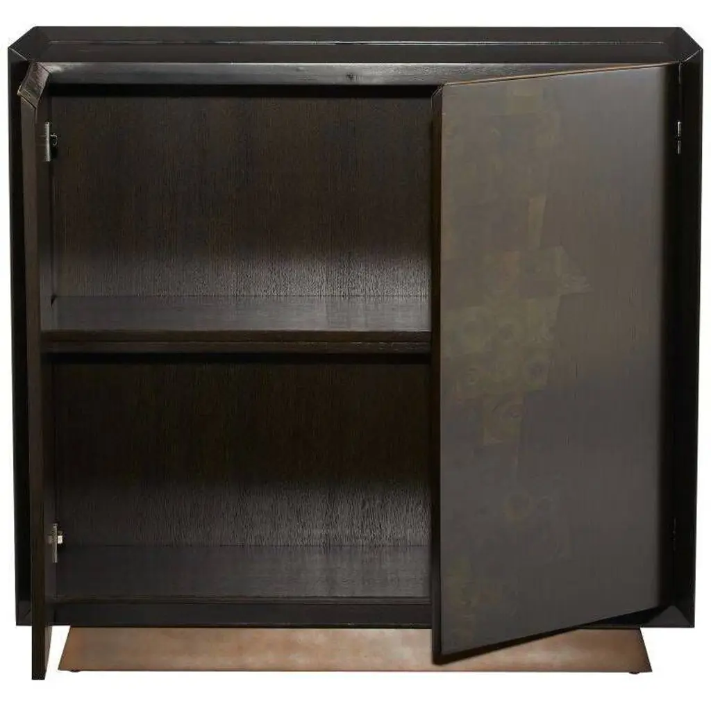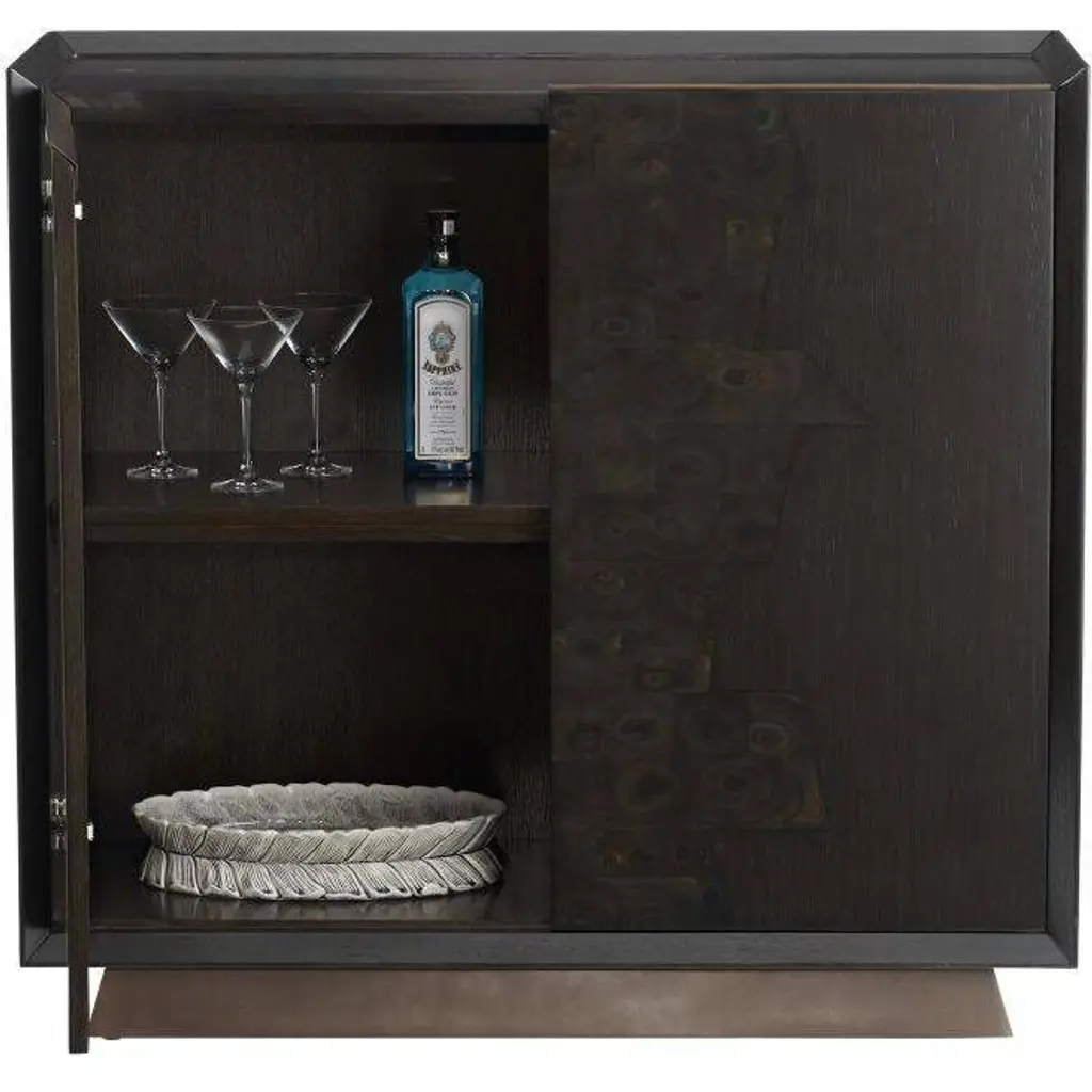 Utilizing a technique that dates to 17th-century Europe, the Hudson is finished with carefully applied natural oyster veneer from oak wood parquetry across the front of a sable oak veneer frame. Chamfered at the top frame and finger pulls, it is finished with a recessed top and angular plinth antique brass base. The single adjustable shelf makes it a versatile cabinet for any home. Oyster will vary.