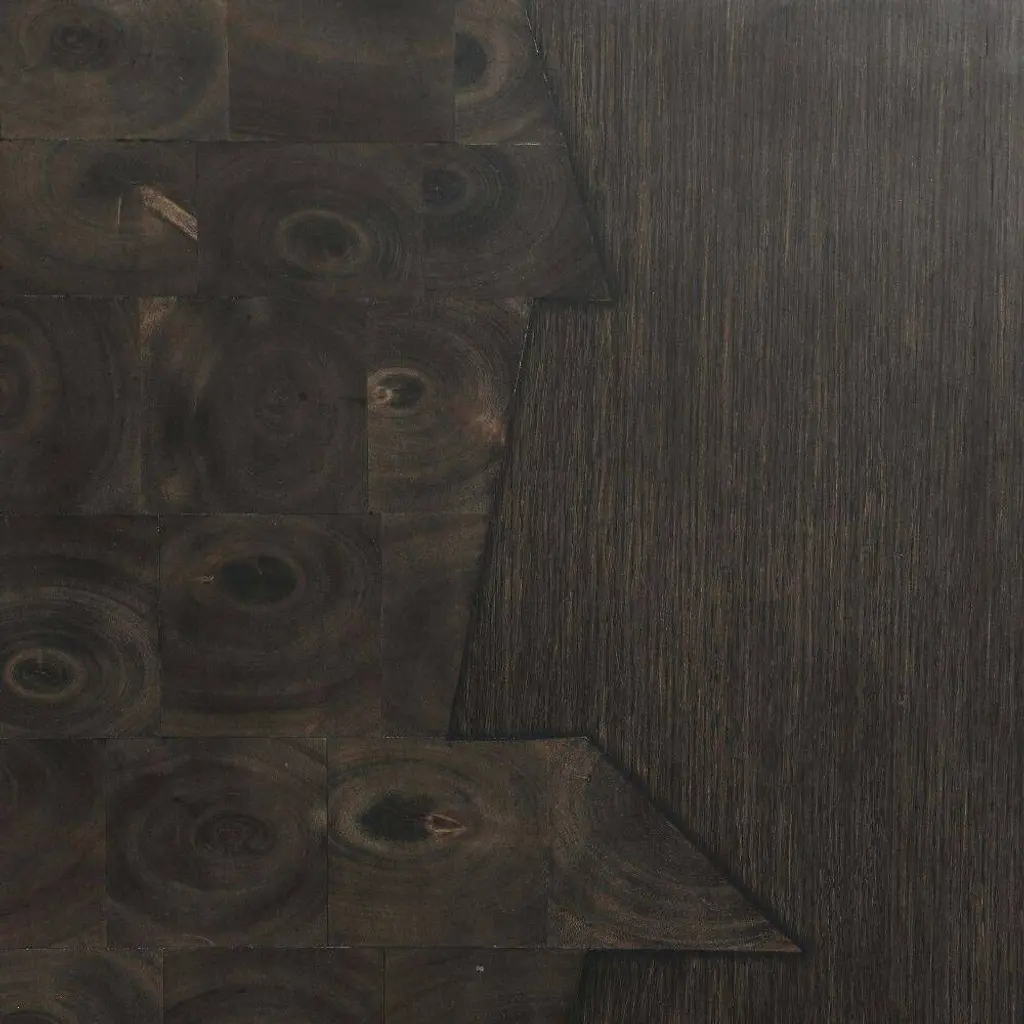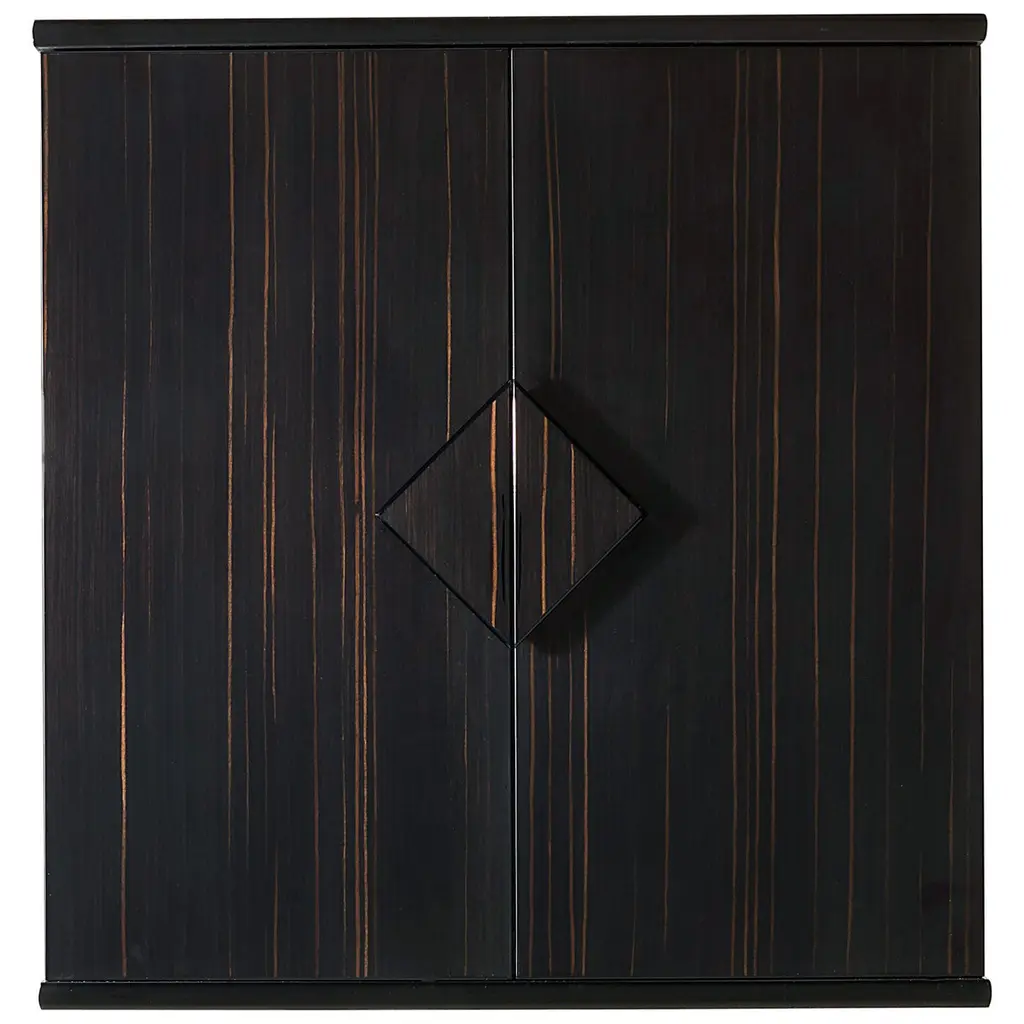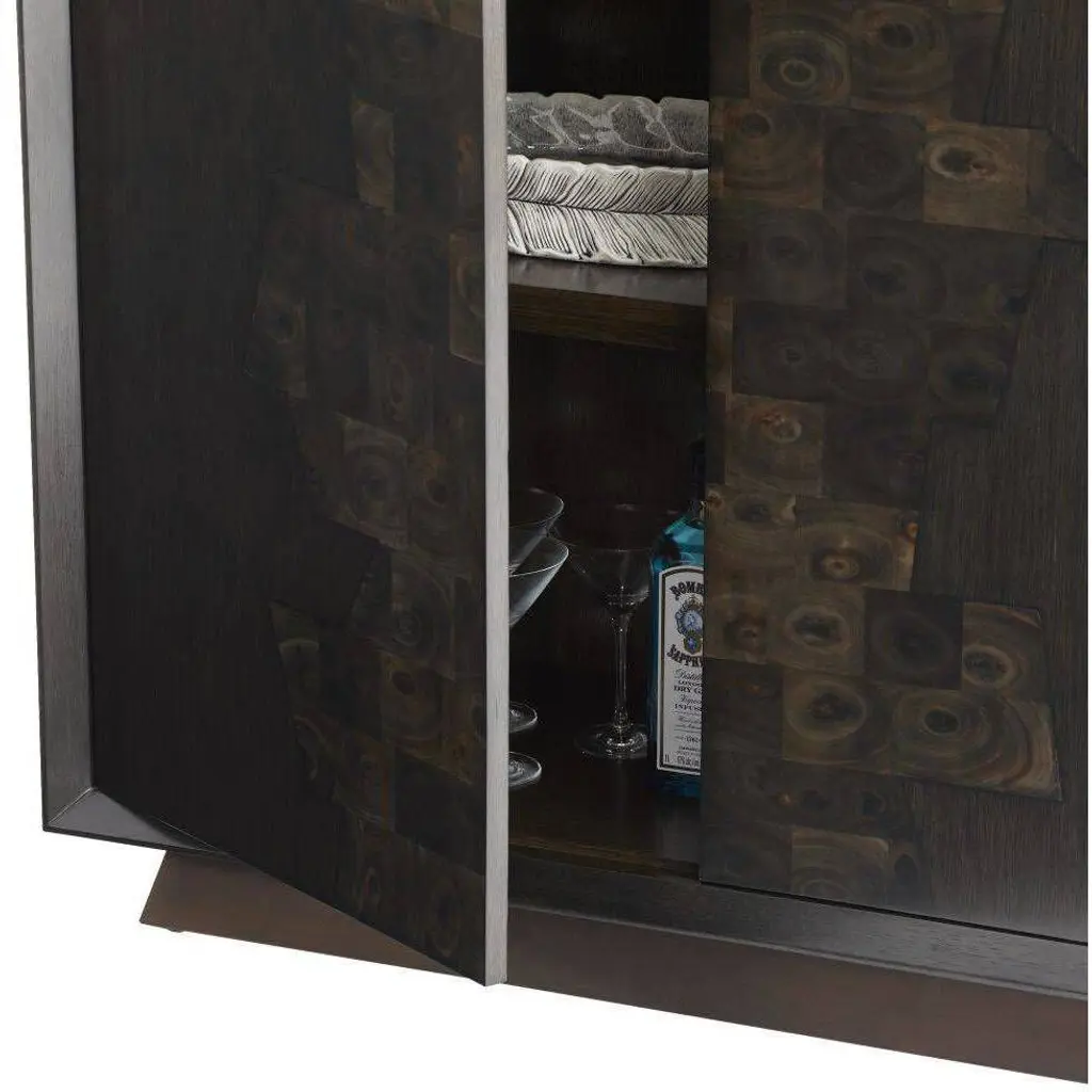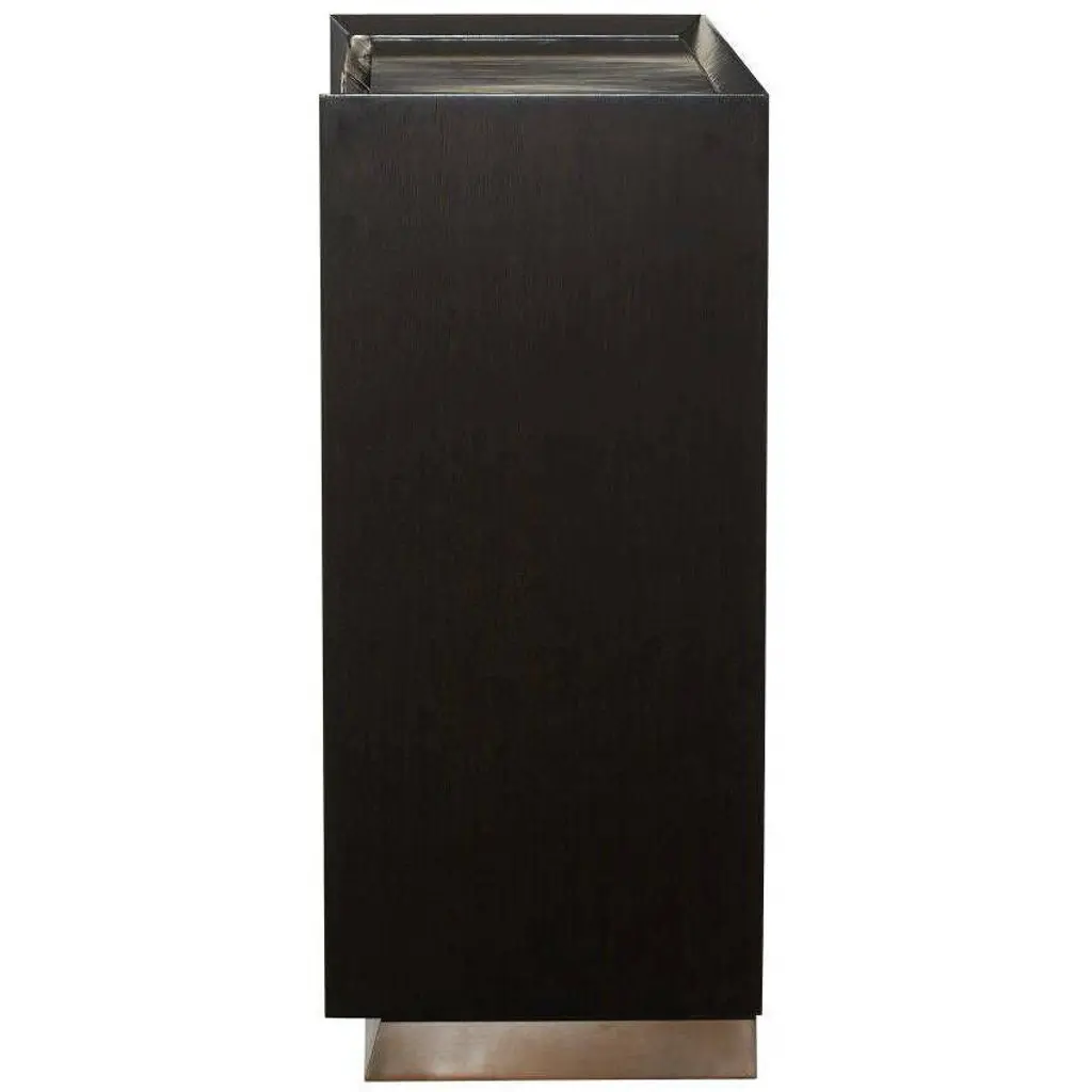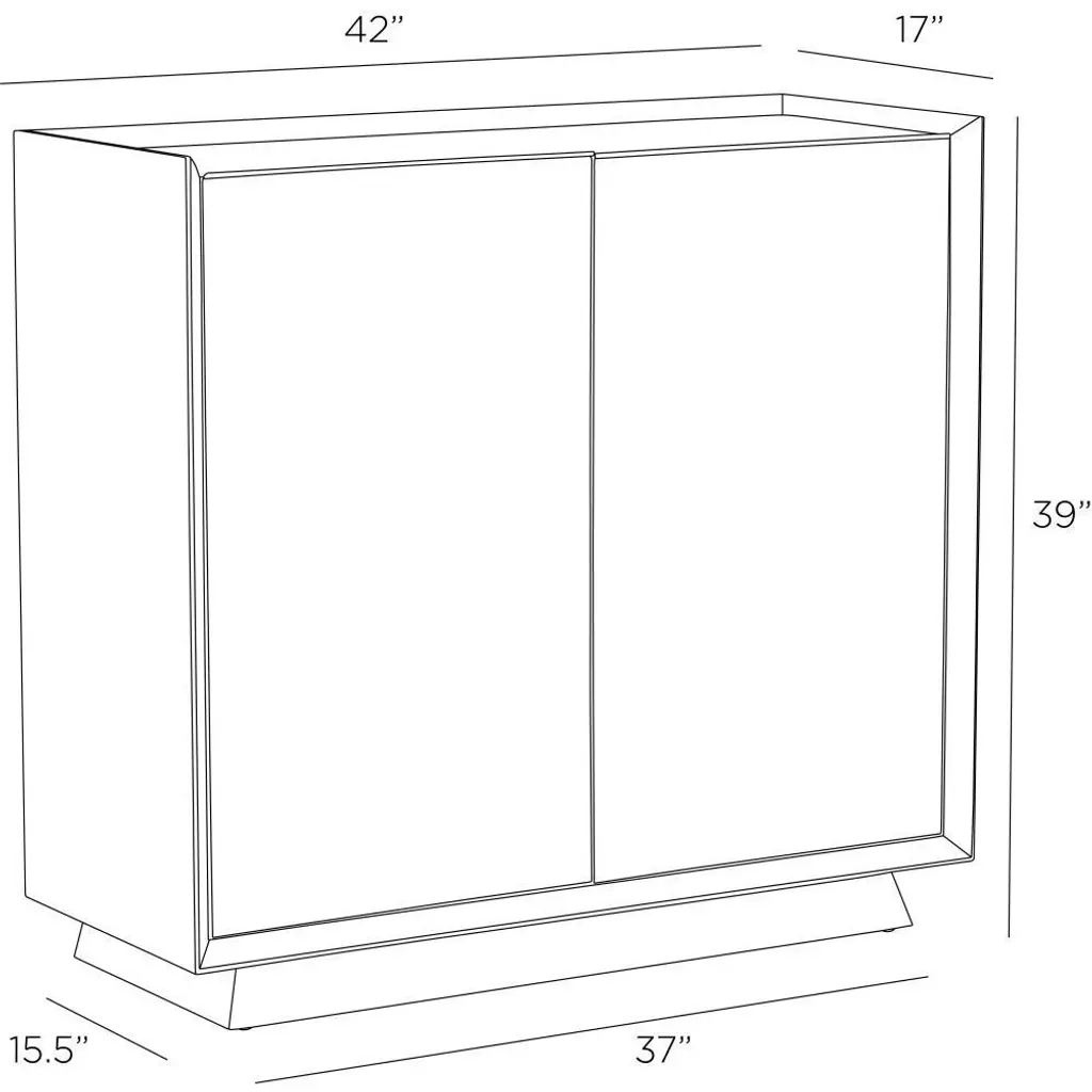 Utilizing a technique that dates to 17th-century Europe, the Hudson is finished with carefully applied natural oyster veneer from oak wood parquetry across the front of a sable oak veneer frame. Chamfered at the top frame and finger pulls, it is finished with a recessed top and angular plinth antique brass base. The single adjustable shelf makes it a versatile cabinet for any home. Oyster will vary.