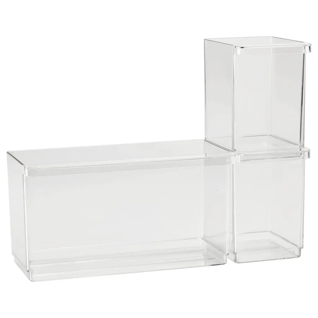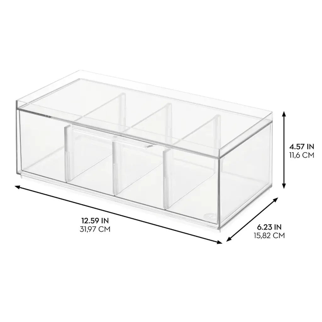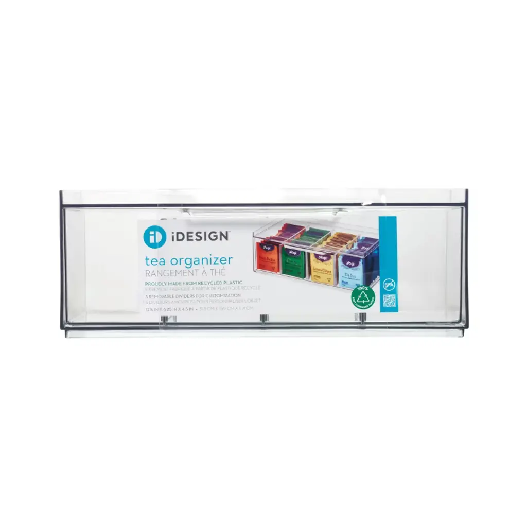 Organize your kitchen in style with the iDesign Crisp Stackable Tea Packet Storage Organizer Drawer with Lid. This three compartment organizer is great for storing tea bags, sugar packets, sweeteners, and more. This container is perfect for use on the countertop next to the tea kettle or on cabinet and pantry shelves. The removeable dividers allow for customizable storage. The hinged lid allows for convenient access when used on its own, while the slide-out front drawer provides easy access when multiple bins (sold separately) are stacked together. Made with durable BPA-free clear plastic, this organizer is designed for every day use and is easy to clean with mild soap and warm water. Measuring 12.59" x 6.23" x 4.57", this tea bag organizer is perfect for compact spaces on the kitchen counter. With iDesign by InterDesign, you can #LiveSimply every day.