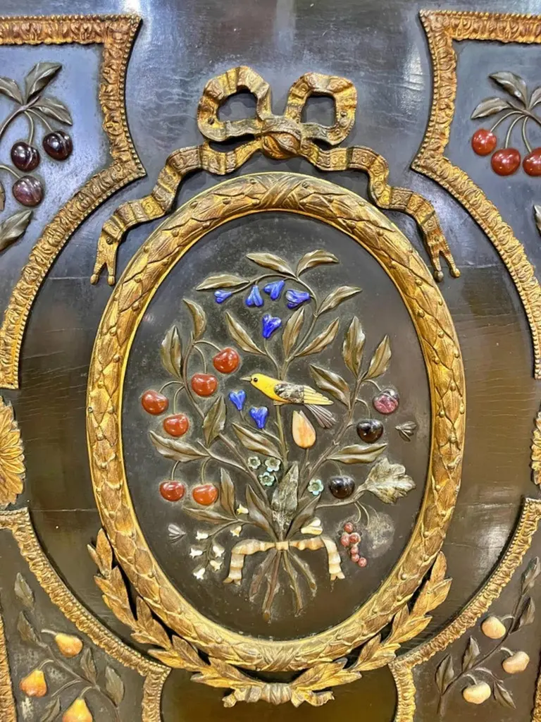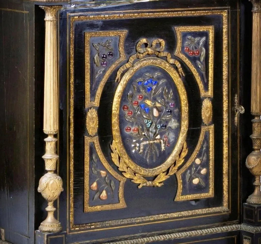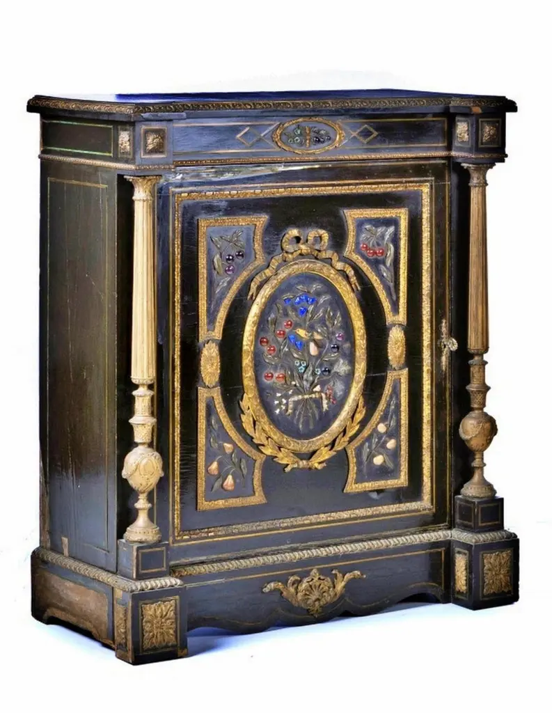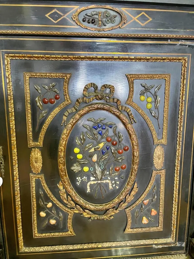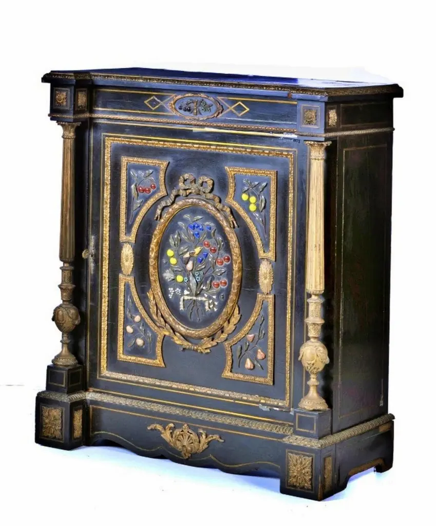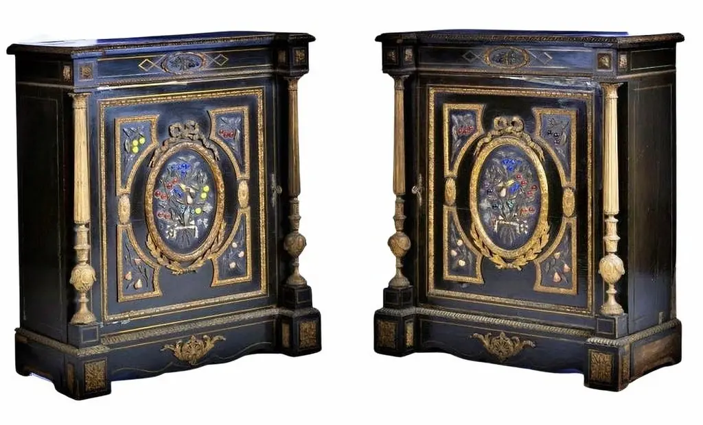 Pair of Napoleon III cabinetsFrench from the 18th century,In ebonized wood decoration embedded in hard stones "Flowers", fillets and applications in bronze.Dimension: 113 x 92 x 47 cm.Good conditions.