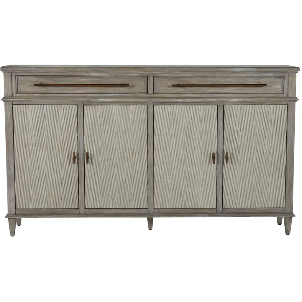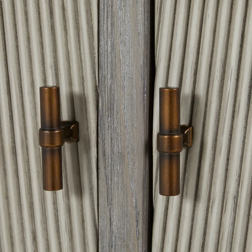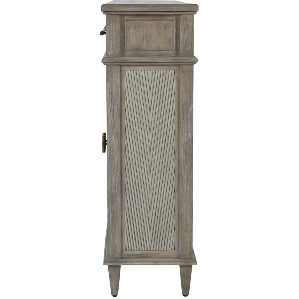 The Isaac Long Cabinet combines slim design with classic style, featuring a Mindy wood construction with a brushed gray and sesame white finish, highlighted by antique bronze accents. Its unique ribbed V-pattern doors offer visual intrigue, while the slim 14" depth makes it a perfect fit for tight spaces. Ideal for stowing away clutter or organizing essentials, it brings functional elegance to any room without occupying too much space.
