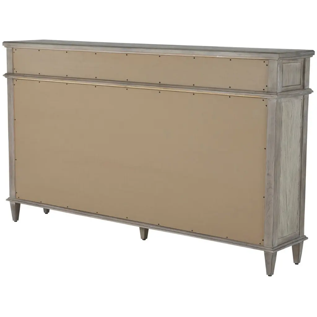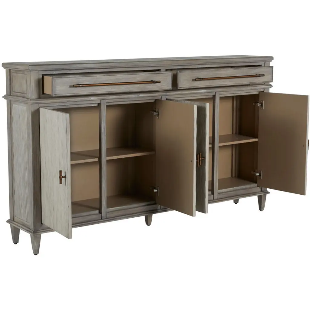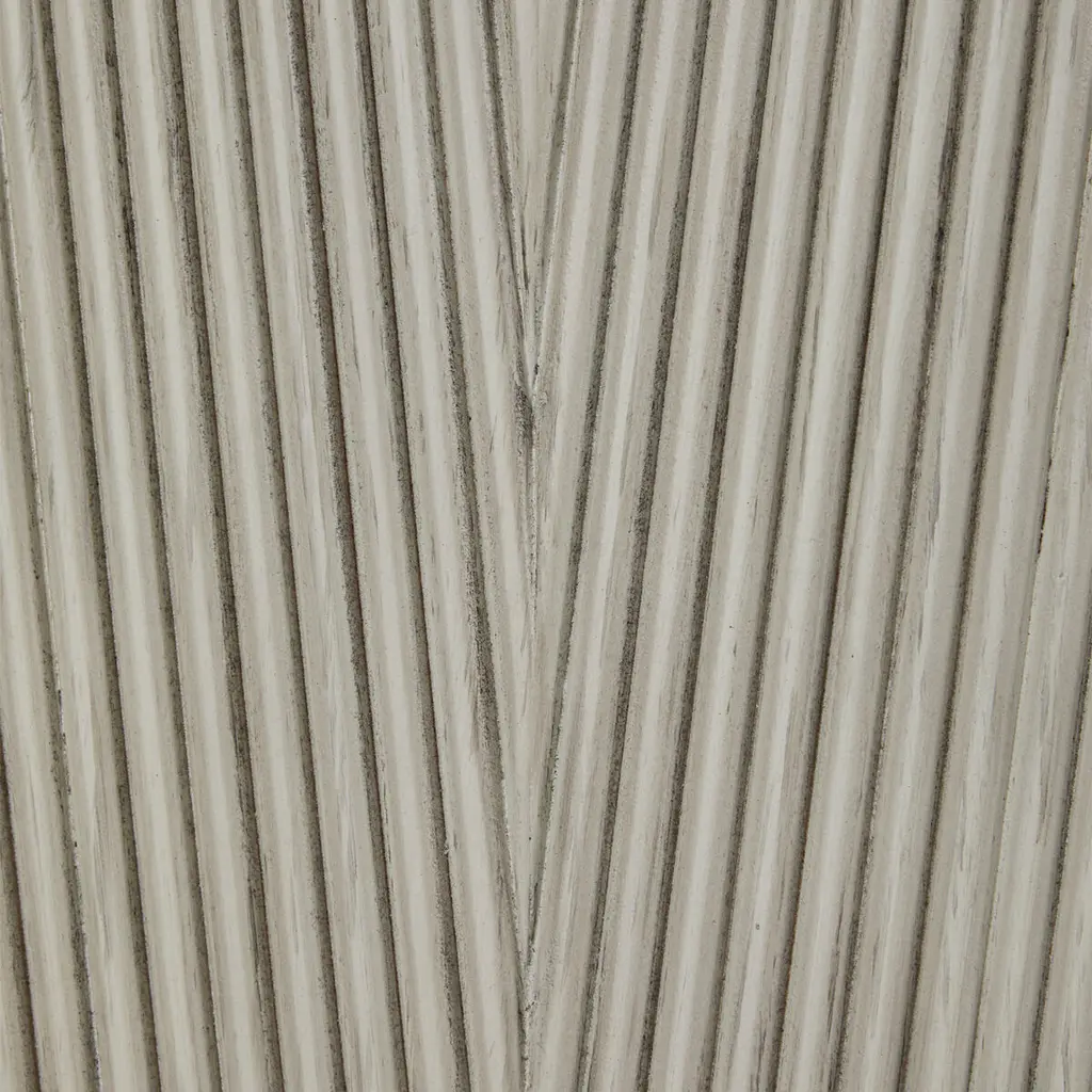 The Isaac Long Cabinet combines slim design with classic style, featuring a Mindy wood construction with a brushed gray and sesame white finish, highlighted by antique bronze accents. Its unique ribbed V-pattern doors offer visual intrigue, while the slim 14" depth makes it a perfect fit for tight spaces. Ideal for stowing away clutter or organizing essentials, it brings functional elegance to any room without occupying too much space.