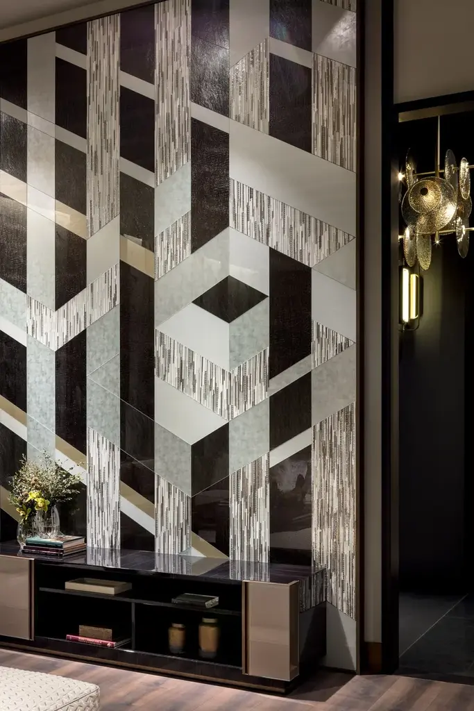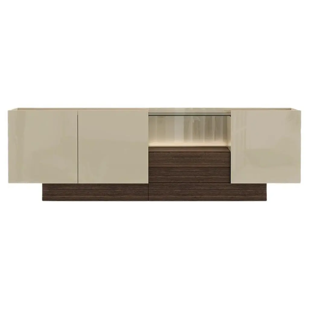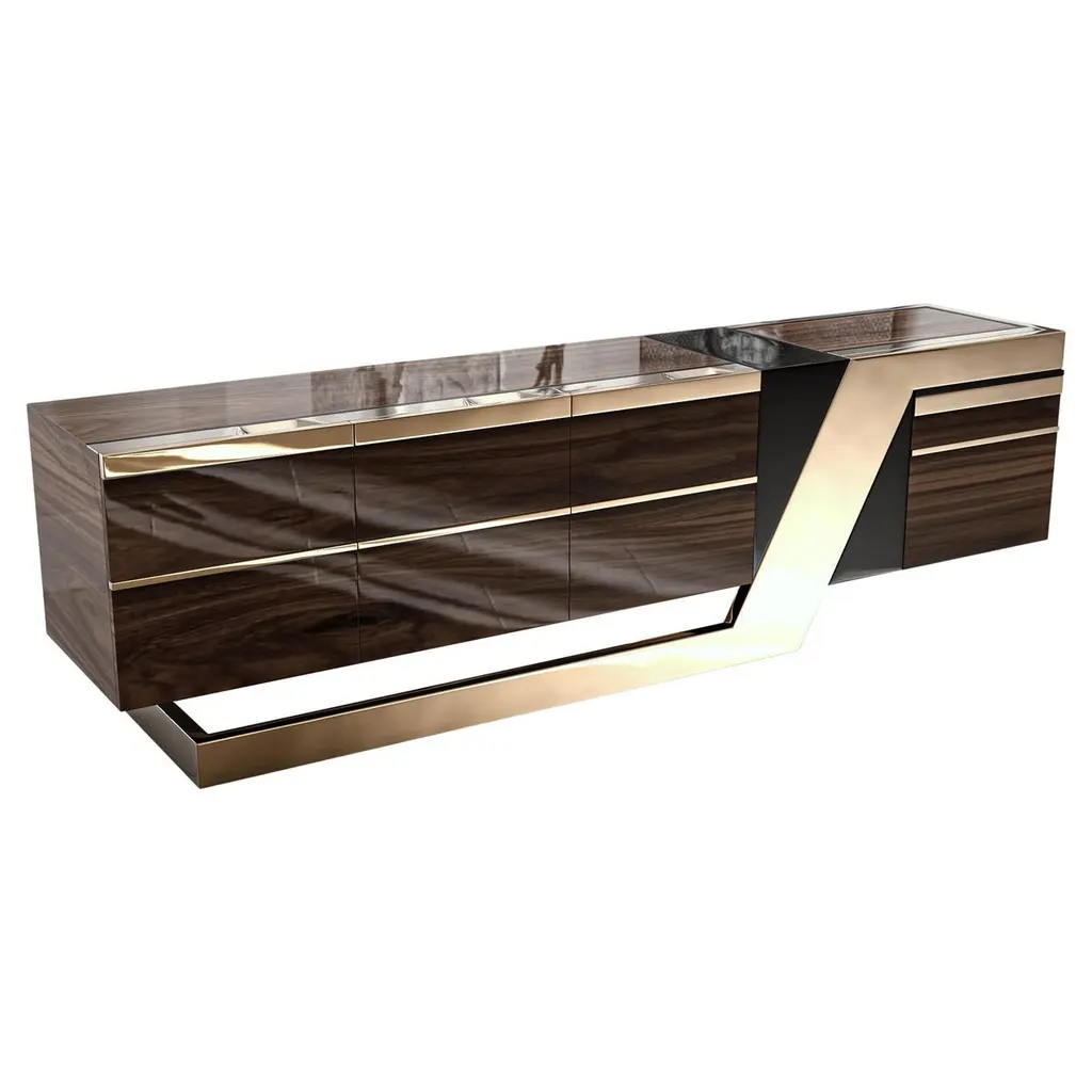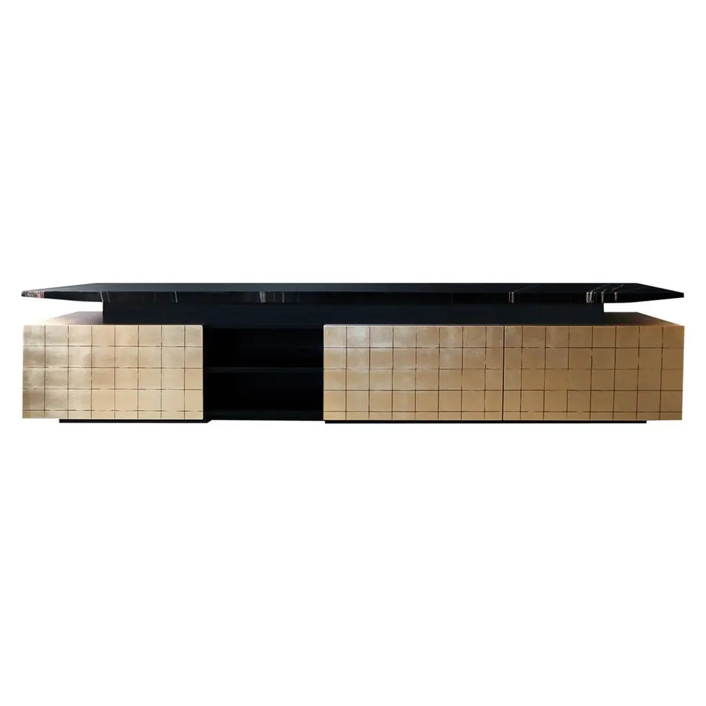 This TV cabinet Island features an almost architectural structure that takes shape thanks to the juxtaposition of the geometric shapes and structure while the precious materials used create a new idea of classicism. TV cabinet in glossy ebony and foam glass exterior. Handles and base with coated lacquered finish. Interior with matte lacquered finish, back with bronzed mirror. Microfiber mats on shelves and LED lighting with opening sensor.