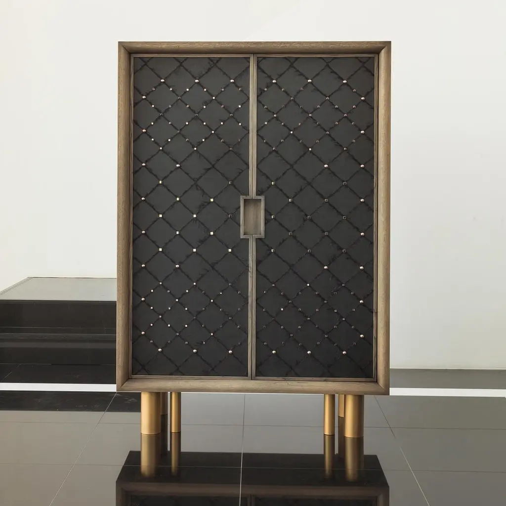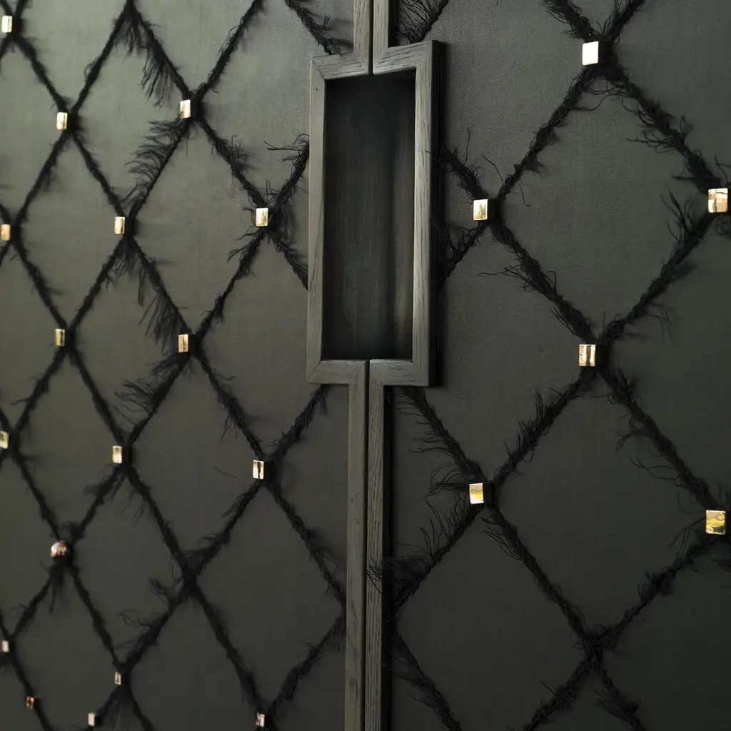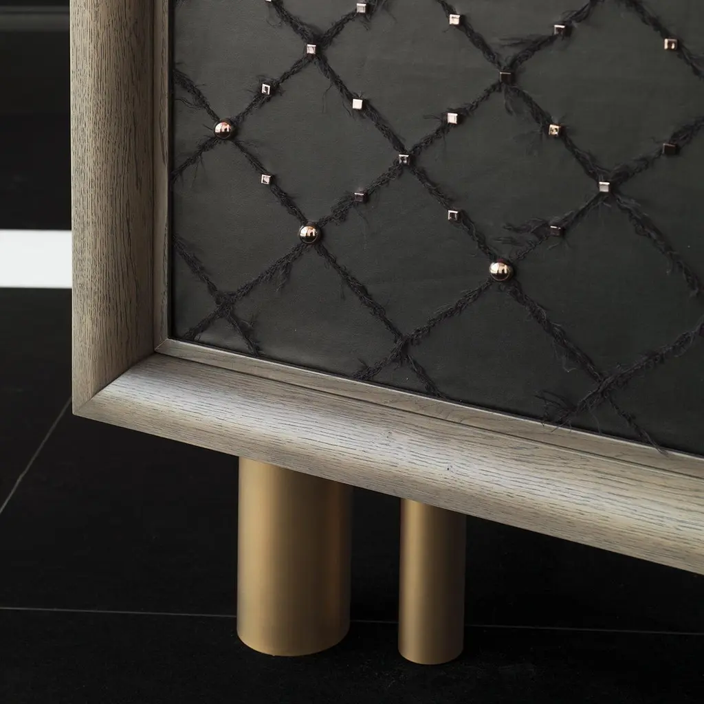The Ivo black cabinet combines a chic contemporary frame with extravagant finishings. Handcrafted in oak, the cabinet features a cool gray finish and bronze-colored metal legs. Containing three drawers and two glass shelves with a mirrored backing, the cabinet faces are covered in faux leather and accented with embroidery and studs, resembling a starry night's sky.