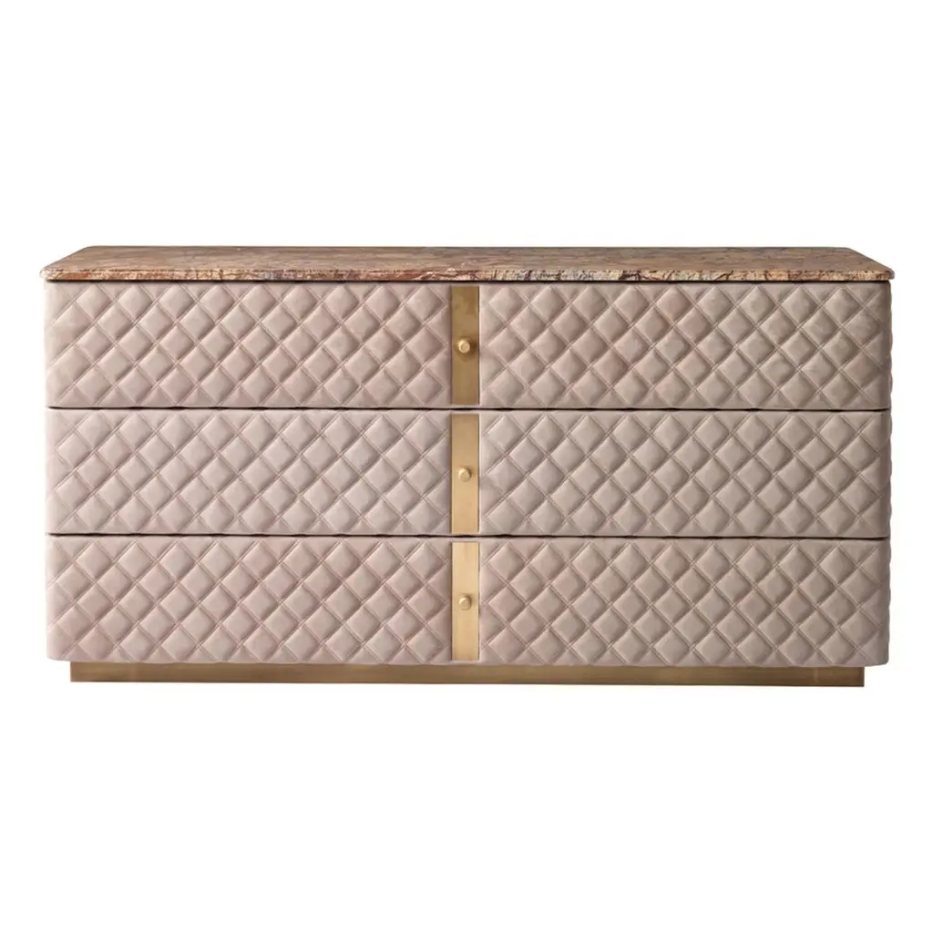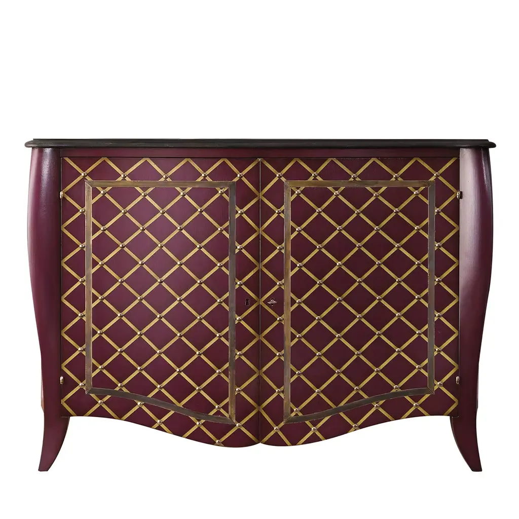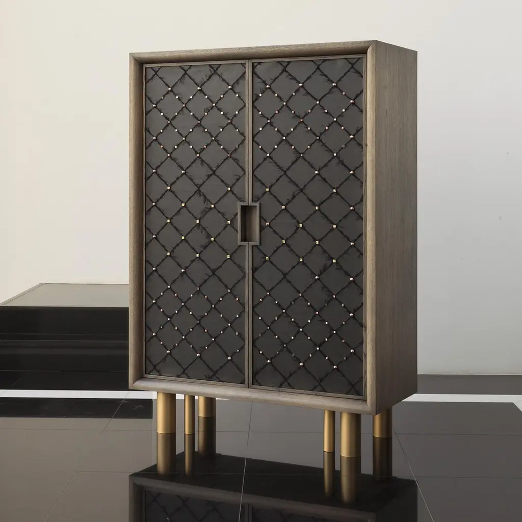 The Ivo black cabinet combines a chic contemporary frame with extravagant finishings. Handcrafted in oak, the cabinet features a cool gray finish and bronze-colored metal legs. Containing three drawers and two glass shelves with a mirrored backing, the cabinet faces are covered in faux leather and accented with embroidery and studs, resembling a starry night's sky.