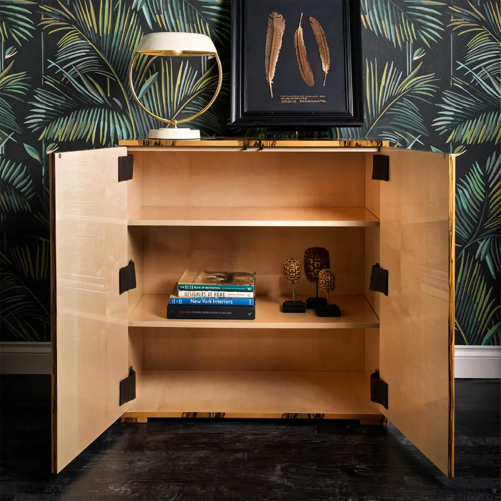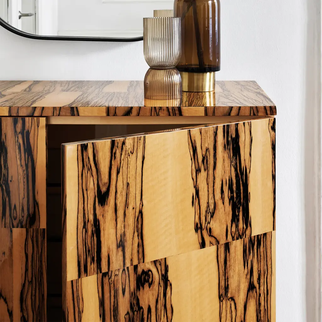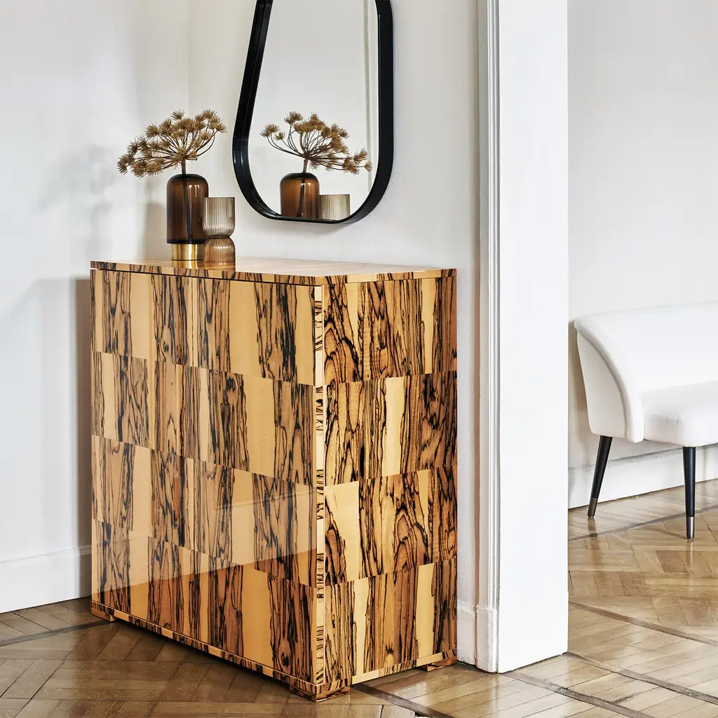 Reinterpreting the concept of traditional storage in an eye-catching design, this exclusive cabinet will be the focal point in a modern living room and dining room. The luxurious checkerboard pattern is crafted by masterfully assembling Albin wood-veneered pieces, whose stunning natural wood grains are enhanced by a glossy finish. The two doors have a push-open system to preserve the harmony of the design and reveal an interior storage of glossy natural maple with two shelves. A piece of great visual impact, this cabinet is best displayed with minimal accents.