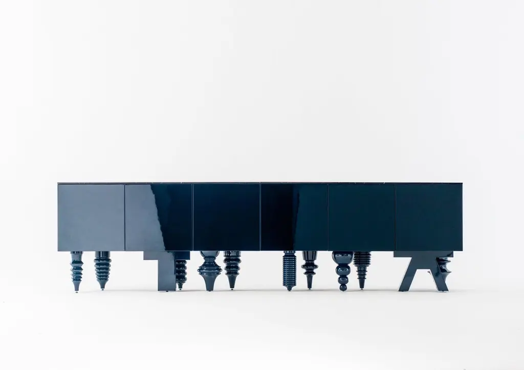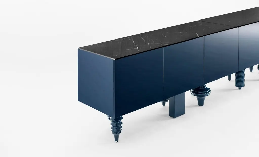 Jaime Hayon cabinet blue multi-leg cabinet designed in 2016 and manufactured by BD Barcelona.A modular multipurpose and multi-legged furniture. It is available with a dozen different designs inspired by different styles. It allows various configurations and is available with optional accessories.Materials:Containers and front panels: MDF of various thicknesses.Doors: MD lacquered gloss.Top: Marble Nero MarquinaLegs: Solid alder woodDimensions modules:Modules:D 100 cm x W 50 cm x H 81 cmTops:L 150 cm, L 200 cmAbout the designer:Jaime Hayon is the most intriguing figure in new Spanish design. He has energy, talent and a style of his own, which are all distilled in to the Show-time collection he has designed for Bd Barcelona design, the most prestigious Spanish design company. This encounter between a young designer and a veteran producer has led to the birth of a furniture collection meant for the home, but which has the adaptability and the personality needed for contract furnishing. A collection in which plastics consort with upholstery, the gleam of lacquered wood and the tradition of Fine ceramics. In these contrasts between classicism and modernity, Showtime reflects what has always been the very essence of Bd.About BD Barcelona:Accompanied with artisanal processes instead of mass production, their products always have more proximity to art than Industrial Design. Characterised by superior quality, short-series productions (and on occasion limited editions), and unique pieces due to crafted manufacturing. In the 70’s, BD pleasantly surprised by editing Gaudí’s furniture for his famous buildings and in the early 90’s, BD again astounded by introducing an exclusive first collection of furniture and lamps designed by Dalí. Recently the collections and designers with an accentuated artistic profile like Jaime Hayon and Doshi Levien, continue to point the way where design and art meet together. Design meets Art. Since 1972.